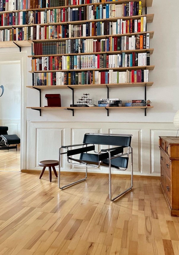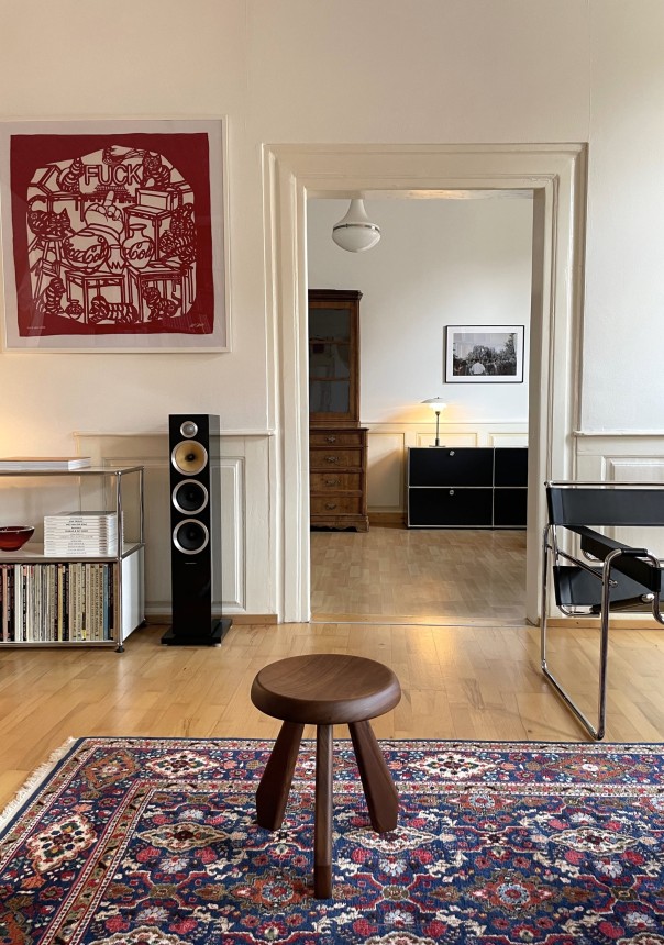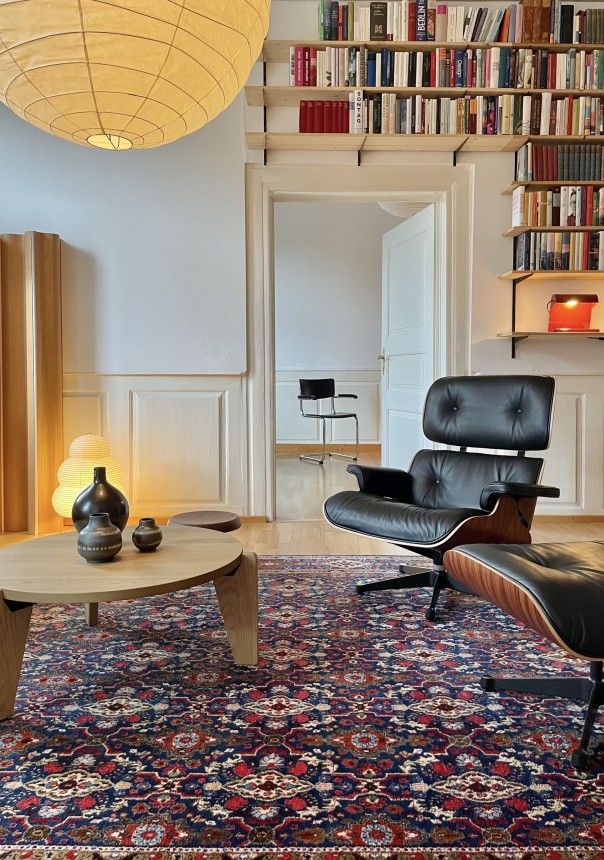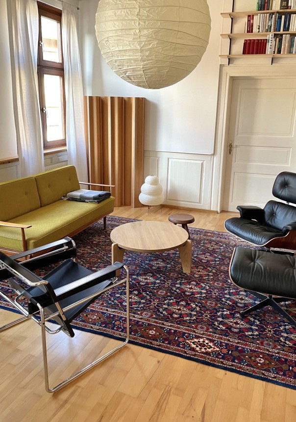 Das ist gar nicht so leicht zu beantworten, da ich viel aus dem Bauch heraus und aus meinem Herzen entscheide. Aber müsste ich mich festlegen, dann klassisch. Man muss wissen, dass ich mich viel mit Designgeschichte und Biografien von Architekt/innen und Designer/innen beschäftige. Bevor ich mir ein Möbelstück anschaffe, studiere ich erst einmal ein paar Monate in Büchern sowie im Internet und informiere mich über die Designer/in und die Absicht oder die Rezeptionsgeschichte hinter dem jeweiligen Möbelstück. Ich wähle also meine Einrichtung ganz bewusst aus und lande dadurch immer wieder bei den Klassikern, die zum Teil schon seit 100 Jahren existieren und jetzt immer noch modern wirken. Viele Stücke, die sich hier versammeln, stammen aber von Designer/innen, die zur selben Zeit gelebt haben, weswegen sie vielleicht alle so gut zusammenpassen. Wichtig ist mir aber auch, die neu gekauften Möbel mit alten Stücken zu kombinieren, damit es nicht wie in einem Katalog wirkt. So habe ich beispielsweise ein Sofa von 1960 und einen alten Teppich im Zentrum meines Wohnzimmers, wofür ich nebenbei am meisten Anfragen auf Instagram bekomme. Was die Materialien angeht, dann passen für mich Holz, Papier und Metall gut zusammen, da sie das Natürliche mit dem Modernen verbinden. Farblich bin ich eigentlich sehr zurückhaltend und verfolge das Prinzip „Schwarz-Weiß-Braun“ und gebe Farbakzente mit einem Teppich oder mit Kunst an der Wand.