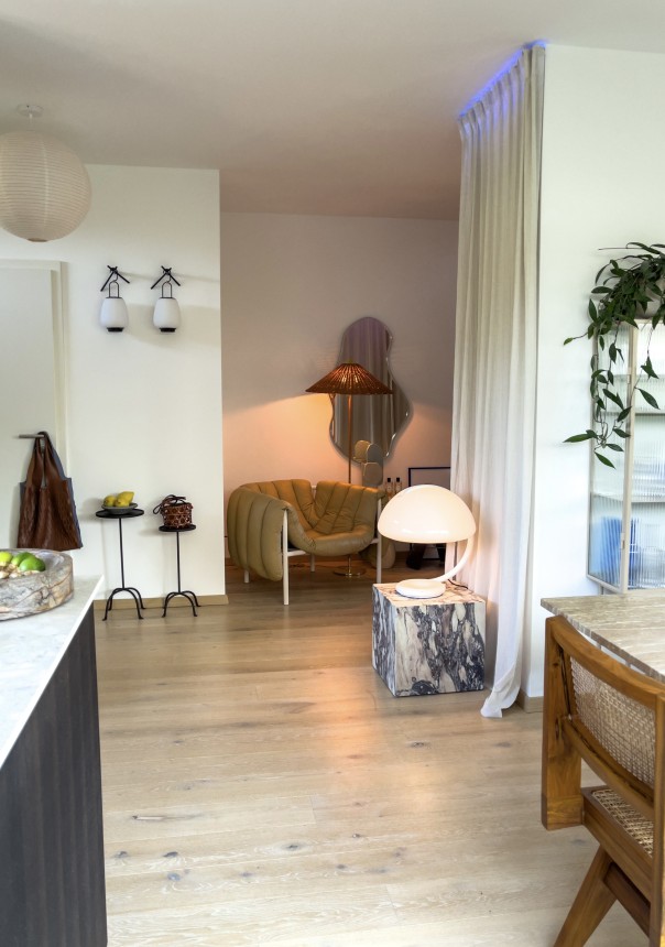 Für mich ist das alles andere als eine Herausforderung, sondern eine Chance mich kreativ auszutoben. Schon bei der ersten Besichtigung habe ich den Verkäufern genau gesagt, wo was hingestellt wird und welche neuen, aber auch bestehende Teile ich mir für die Räume vorstellen könnte. Meine Leidenschaft war wohl direkt zu spüren, weshalb ich vielleicht auch die Zusage bekommen habe. Ich habe einen recht kreativ chaotischen Denkprozess. Dank meiner räumlichen Vorstellungskraft habe ich auch alle vorherigen Wohnungen vorab im Kopf eingerichtet und dabei auch meistens schon die Möbel dafür bestellt. Für die Gardinenwand im Wohnzimmer war beispielsweise auch bereits alles geplant, nur dauert die Umsetzung halt gerne. Ehrlich gesagt ist das mit Inneneinrichtung ein wenig wie mit Mode: Es gibt It-Pieces oder Statement pieces, die entsprechend in den Vordergrund gestellt werden und die man gekonnt mit Nebenakteuren in Szene setzt. So wird nicht nur das Outfit perfekt, sondern auch das Interior Design daheim. Alles auf einmal zu kaufen macht natürlich keinen Spaß und ist zudem nicht immer machbar, gerade wenn man auf diverse namenhafte Klassiker setzt. Für mich ist es ein ständiger Veränderungsprozess und das bedeutet, dass neue Teile im Haus hinzukommen, man etwas anders kombiniert oder mal eine Wand gestrichen wird. Es bedeutet aber auch, dass gewisse Teile aktuell oder generell in meinen Augen nicht mehr passen, die ich dann gerne veräußere, um anderen damit eine Freude in ihrem Zuhause zu bereiten.