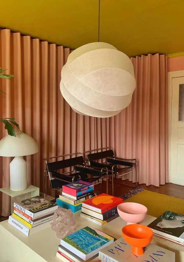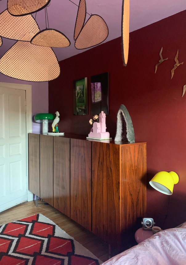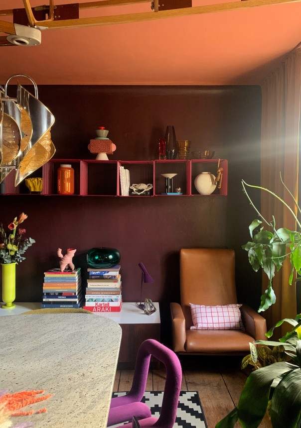 Ein paar Schlagworte wären vielleicht: Eklektisch, farbig, extravagant ?, bold – minimalistischer Maximalismus trifft es vielleicht am Besten. Als mein Partner und ich uns kennenlernten, waren wir beide schon an Interior interessiert, kamen jedoch aus verschiedenen Ecken. Wir sind relativ schnell zusammengezogen und hatten dann erstmal einen wilden Mix aus ALLEM. Über die Jahre hat sich aus dem Interesse eine Leidenschaft entwickelt und wir haben zu einem gemeinsamen Stil gefunden, die Trennschärfe wurde verschwommener. Früher war es vielleicht eher Kuriositätenkabinett meets Mid-Century. Heute sind vor allem italienische Einflüsse zu sehen, und ein paar modernere Pieces. Insgesamt begreifen wir die Wohnung und die einzelnen Farbräume vermehrt als Ganzes und stellen einheitlichere Bezüge her.