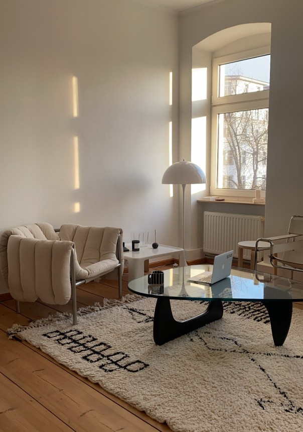 Ich habe meine Wohnung über eBay Kleinanzeigen gefunden. Wir wollten eigentlich in die Wohnung von Freunden einziehen, das hatte kurzfristig doch nicht geklappt, und so musste ich schnell etwas Neues finden. In Berlin ist der Wohnungsmarkt mittlerweile ziemlich tough, bei unserer Wohnungssuche bin ich auf viele Menschen gestoßen, die schon lange suchen, darunter nicht nur Künstlerinnnen oder Kreative, wie man denken möchte, sondern auch Ärztinnen und Juristi*innen mit Festanstellungen. Ich habe einfach gedacht, wenn ich auf den klassischen Immobilienseiten nichts finde, muss ich halt out of the box denken. Ich glaube, mit unserer Wohnung, das sollte so sein – sie war schon länger online und ich hatte auf meine Anfrage keine Antwort erhalten. Eines Nachts bin ich aufgewacht, konnte nicht wieder einschlafen, und habe gedacht, wenn ich mir eine Wohnung aussuchen könnte, dann wäre es die – der helle Holzboden gefiel mir so gut, die gekalkten Wände wurden original wie vor 200 Jahren wiederhergestellt. Wir haben auch die alten Zimmertüren, bei denen die Wandlaibungen mit schlichten, dekorativen Bekleidungen und Gesims ausgestattet sind. Solche Holzarbeiten werden wohl in Deutschland nicht mehr gemacht und es kamen extra Schreiner aus Südeuropa, um alle Türen und Rahmen herzustellen und einzubauen. Sowas gefällt mir. Und siehe da, obwohl ich eher zurückhaltend bin, kann ich fast unverschämt hartnäckig sein, wenn ich etwas unbedingt will – so war das mit der Wohnung und wir haben sie glücklicherweise bekommen, weil ich mir in jener Nacht, als ich aus dem Schlaf erwacht bin, ein Herz gefasst habe und den Vormieter nochmal angeschrieben habe. Und sieben Stunden später, an einem Sonntagmittag, stand ich in der Wohnung, am nächsten Tag habe ich meine Unterlagen abgegeben und hatte abends die Zusage, bin am Samstag umgezogen. Wir sind ziemlich glücklich mit dieser Wahl.