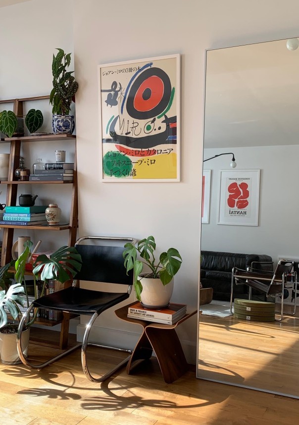 Our home is a blend of mid-century modern and modernist, many of our furniture pieces are from the Modernist period with designs by Mies van der Rohe, Marcel Breuer, & Jean Prouvé. We also try to focus on materiality in our space to keep the color palette more minimal, most of our furniture pieces are either walnut/teak or dark leather and tubular chrome, this allows us to accent our space and add pops of color with plants and art.