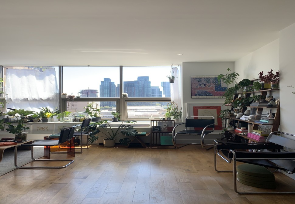 Our apartment is a 760 sq ft. loft style apartment, it's technically a studio apartment though has a closed office alcove that we use as a bedroom. What drew us to this particle apartment when searching back during 2020 was the long gallery style hallway that's lined with storage as well as the open living space with south facing windows and breathtaking views of the city from our window. Our apartment is $3200/month split between myself and my partner based on our income. When we were looking for a new apartment light was one of the most important factors and the southern exposure and phenomenal layout sold us on this particular unit we applied for right after seeing it.