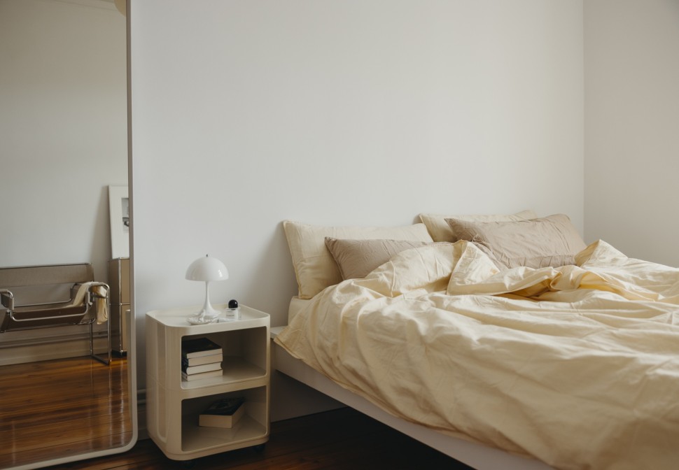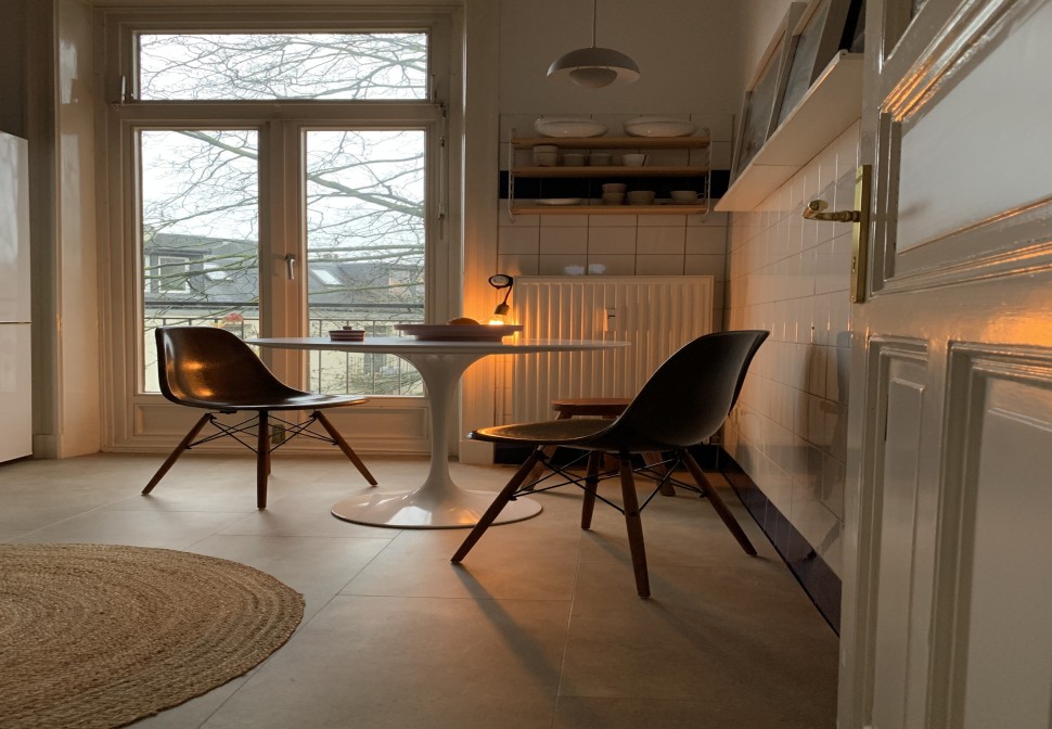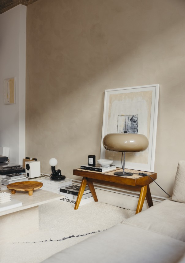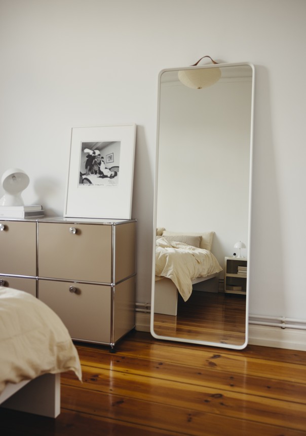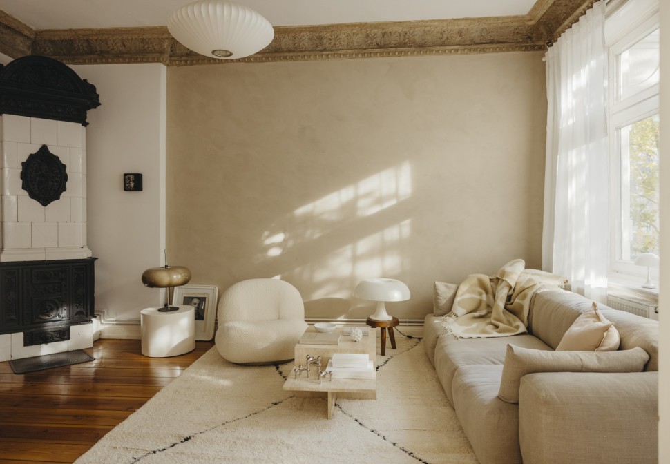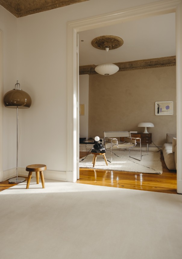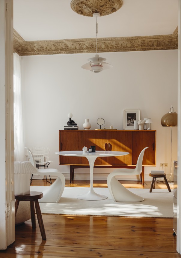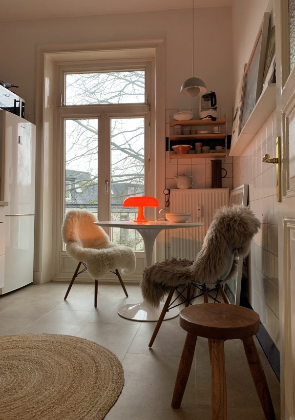Lange konnte ich gar nicht sagen, was mein bzw. unser Stil überhaupt genau ist. Es gab einen Mix aus verschiedenen Farben und Materialien. Hauptsächlich waren das Midcentury- und moderne skandinavische Möbel. Viele Dinge haben wir spontan gekauft, ohne nachzudenken, ob es zum Gesamtkonzept passt. Ich habe dann 2020 – mit dem Start meines Interior-Accounts - angefangen Ruhe in diesen überladenen Mix aus Materialien und Farben zu bringen: Zuerst habe ich all unsere Pflanzen an Freunde verschenkt, was optisch zu mehr Ordnung und Leichtigkeit geführt hat. Mein Berufsleben als Fotografin und Fotoredakteurin ist schon sehr reizüberflutet, dem wollte ich entgegenwirken. Als nächstes habe ich mich mehr an zeitlose, meist helle, Designklassiker gehalten statt kurzlebigen Trends zu folgen – z.B.: der Wassily- Armchair und der Gubi Pacha von Pierre Paulin. Das Schöne ist, dass wir auf einem Teil der Möbel, die wir schon hatten, aufbauen konnten, wie die zwei Panton-Stühle meines Freundes oder die Artemideleuchte, die wir vor 17 Jahren gekauft haben.