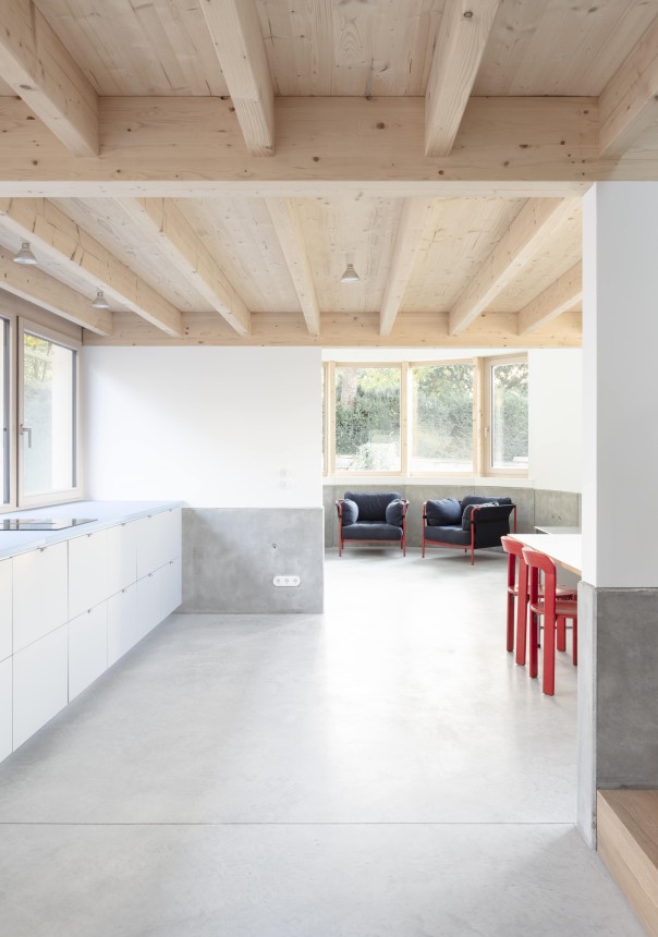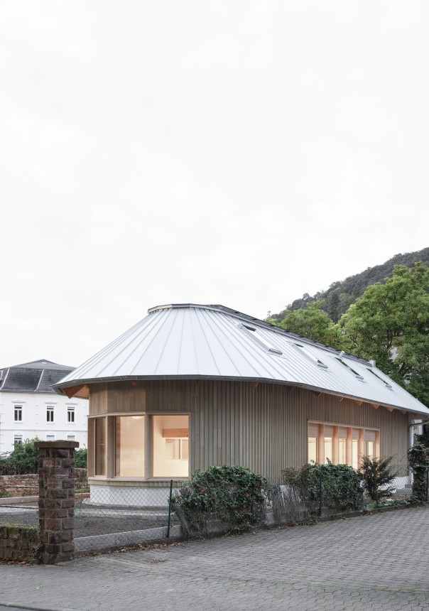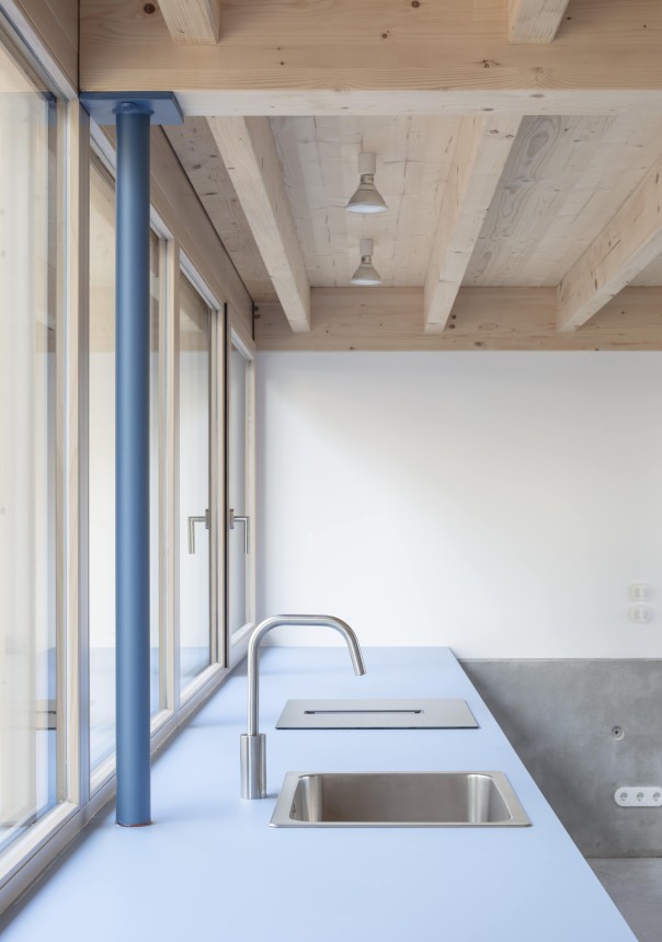 Unser Ziel war es, ein Haus zu entwickeln, das sich harmonisch in die Umgebung einfügt und dennoch eine eigene Identität bewahrt. Das keilförmige Grundstück liegt zwischen dem historischen Bergfriedhof und der Bahntrasse und wurde einst von einem Steinmetz genutzt – diese besondere Lage und Historie spiegeln sich in der Architektur wider. Ein kompakter Sockelbau mit vertikaler Holzstülpschalung bildet die Basis, während darüber ein auskragendes Dachvolumen mit silberner Stehfalzdeckung scheinbar schwebt. Diese Gestaltung erinnert an die Typologie einfacher Bahn- und Trafohäuser. Die westliche Rundung des Baukörpers reagiert auf die städtebauliche Situation an der Straßenkreuzung und schafft durch die umlaufende Traufe eine fließende Verbindung zwischen den beiden Straßenrichtungen. Zur östlichen Wohnbebauung vermittelt eine verputzte Fassade mit akzentuiertem Eingangsbereich. Im Inneren ist die Raumabfolge überraschend asymmetrisch organisiert und orientiert sich am natürlichen Lichteinfall. Das leicht abgesenkte Erdgeschoss schafft einen offenen, aber geschützten Gemeinschaftsbereich, während das Obergeschoss kompaktere, introvertierte Individualräume beherbergt. Zwei Lufträume verbinden die Ebenen vertikal und schaffen spannende Blickbeziehungen. Ein besonderer Fokus lag auf der Materialwahl: Wir wollten Materialien in ihrer ursprünglichen Qualität zeigen. Die Holzkonstruktion ist sichtbar geblieben, ebenso der Betonsockel im Innenraum, der eine markante Beckenwirkung erzeugt. Handgefertigte Holzfenster mit außenliegenden Schutzrahmen, einheitlich blau gestrichene, fein gearbeitete Stahlelemente und präzise abgestimmte Details verleihen dem Haus seine eigene Handschrift. Im Außenbereich wurden viele Materialien der ursprünglichen Werkshütte wiederverwendet. Darüber hinaus wurde eine historische Grabsteinplatte als skulpturales Element in die Gartengestaltung integriert.