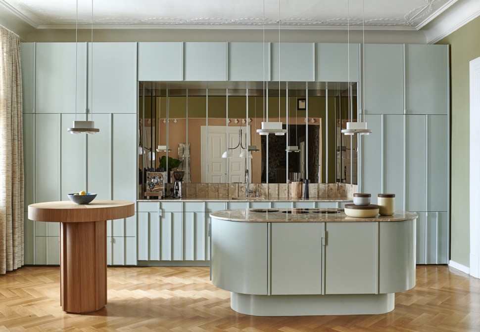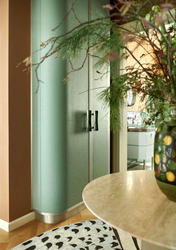 Einen Raum zu schaffen, der meine Ideen in der Anwendung zeigt und meine Besucher inspiriert – wie ein Showcase zum Anfassen. So kann man das Konzept viel besser veranschaulichen und neue Ideen direkt vor Ort ausprobieren, was es Menschen natürlich direkt viel zugänglicher macht. Jedes Möbelstück und Accessoire wurde sorgfältig ausgewählt, um eine einzigartige Atmosphäre zu schaffen, die meinen Stil perfekt repräsentiert. Besonders gelungen ist mir das in der Küche, die für mich das Herzstück der Wohnung ist. Hier war mir die konsequente Umsetzung meiner Idee am wichtigsten. Mit einem Bartisch, einer Kochinsel und einer integrierten Spiegelfront schuf ich einen offenen und kommunikativen Raum, der sich farblich nahtlos ins Gesamtkonzept einfügt. Die Küche wurde nach einem Eigenentwurf von einem Schreiner umgesetzt, und die hochwertigen Küchengeräte von V-ZUG fügen sich perfekt ins Design ein.