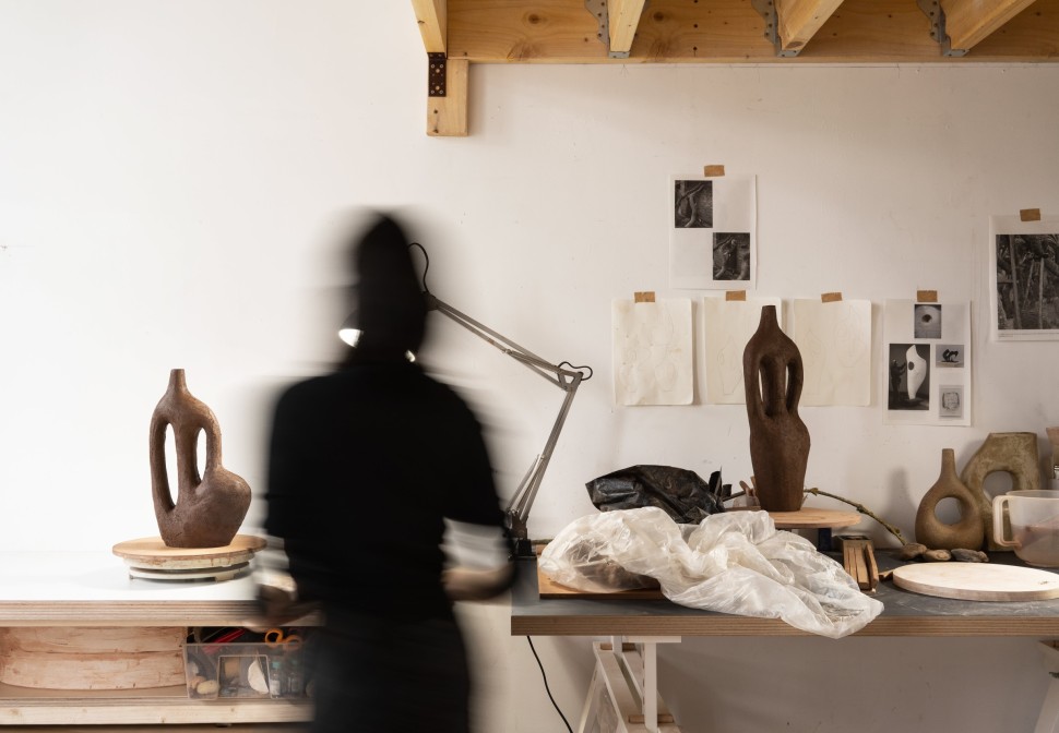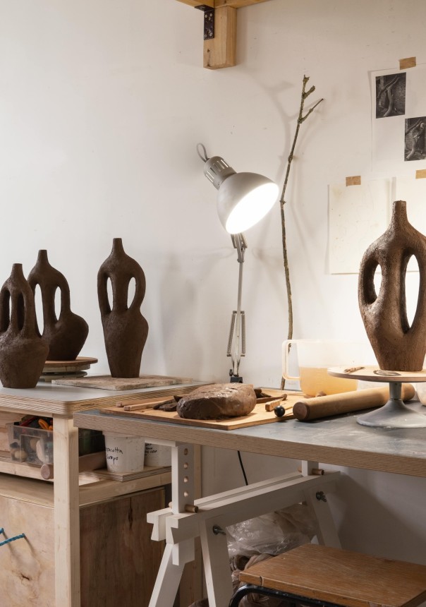 Ich war fast 10 Jahre lang als Floristin tätig, bevor ich in meinen Dreißigern eine Kunstschule besuchte. Während meiner Zeit als Floristin wurde mir klar, wie sehr ich die Arbeit mit meinen Händen genieße, und in vielerlei Hinsicht betrachtete ich Blumenarrangements, wie Skulpturen. So lag es nahe, dass ich mich für ein Studium der Bildhauerei an der Glasgow School of Art entschied. Während meiner Zeit an der Kunstschule stieß ich zum ersten Mal auf Ton, ein einfaches Material, das ein so vielfältiges Ausdruckspotenzial bietet - ich war sofort fasziniert. Ton bietet eine sehr direkte, taktile und intensive Erfahrung mit der Erde, die für mich vergangene und zukünftige Kunst verbindet.