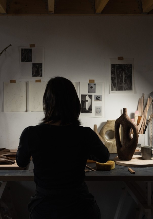 Wie viele Künstler lasse ich mich sehr stark von der Natur inspirieren. Die Farben, Formen und Strukturen, die man in der Natur findet, z. B. in Felsformationen, Kieselsteinen, Gräsern, Flechten und Bäumen, faszinieren mich unendlich. Da ich in Schottland lebe, habe ich glücklicherweise Zugang zu atemberaubenden wilden Landschaften, und das nährt meinen kreativen Prozess. Als Menschen sind wir nicht von der Natur getrennt, sondern gehören zu ihr, und so erstreckt sich meine Liebe zu natürlichen, organischen Formen auch auf meine Wertschätzung der Figur und der wunderschönen, vielfältigen Eigenschaften des Körpers. Der Ausgangspunkt für meine Arbeit ist oft der spontane Wunsch, eine bestimmte Form zu erforschen. Vielleicht beginne ich mit einigen sehr lockeren, automatischen" Skizzen, fast wie Kritzeleien, die man als Kind anfertigen kann. Aus diesen Kritzeleien wähle ich dann diejenigen aus, die ich weiter erforschen möchte. Den Entstehungsprozess intuitiv und fließend zu halten, ist ein wesentlicher Bestandteil meines Prozesses, so dass es nicht ungewöhnlich ist, dass ich am Ende etwas anderes entwerfe als das, womit ich begonnen habe.