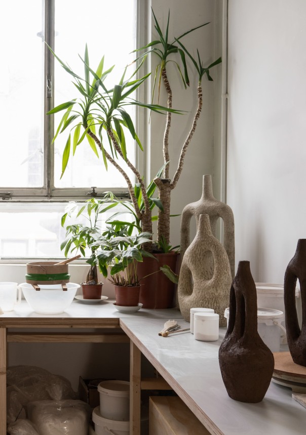 Für mich sind ein aufgeräumter Raum, gutes natürliches Licht und eine neutrale, minimale Einrichtung wichtige Voraussetzungen für ein inspirierendes Arbeitsumfeld. Natürlich schwankt mein Atelier mit dem Auf und Ab meines Arbeitspensums, und manchmal scheint es chaotisch zu sein, aber immer wenn ich ein Projekt oder eine intensive Schaffensperiode beende, möchte ich in mein Atelier zurückkehren und ein Gefühl der Ruhe und Ordnung haben - diese Bedingungen sind eine Voraussetzung dafür, dass ich mich wieder zum Schaffen inspiriert fühle.