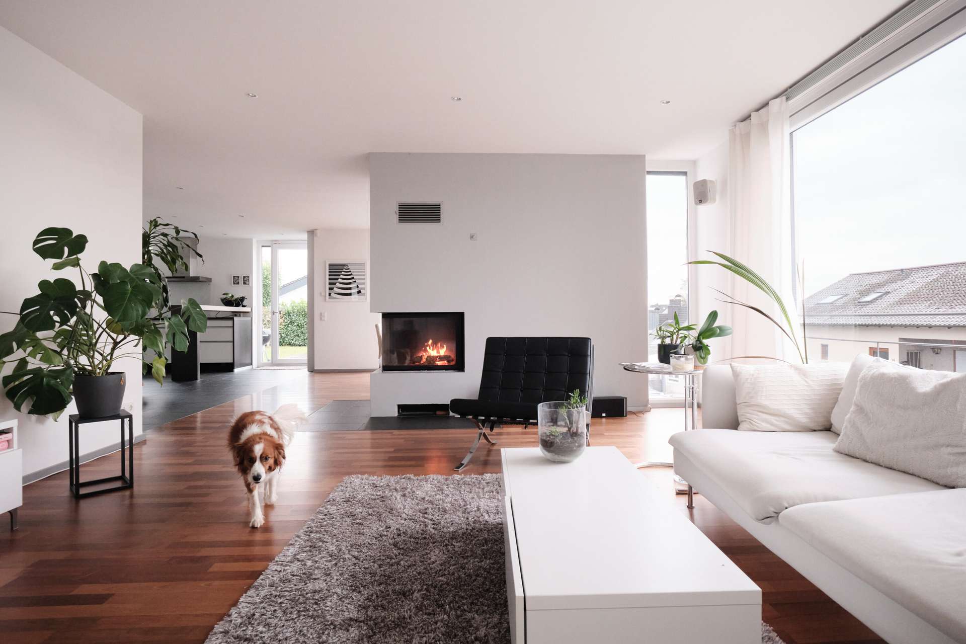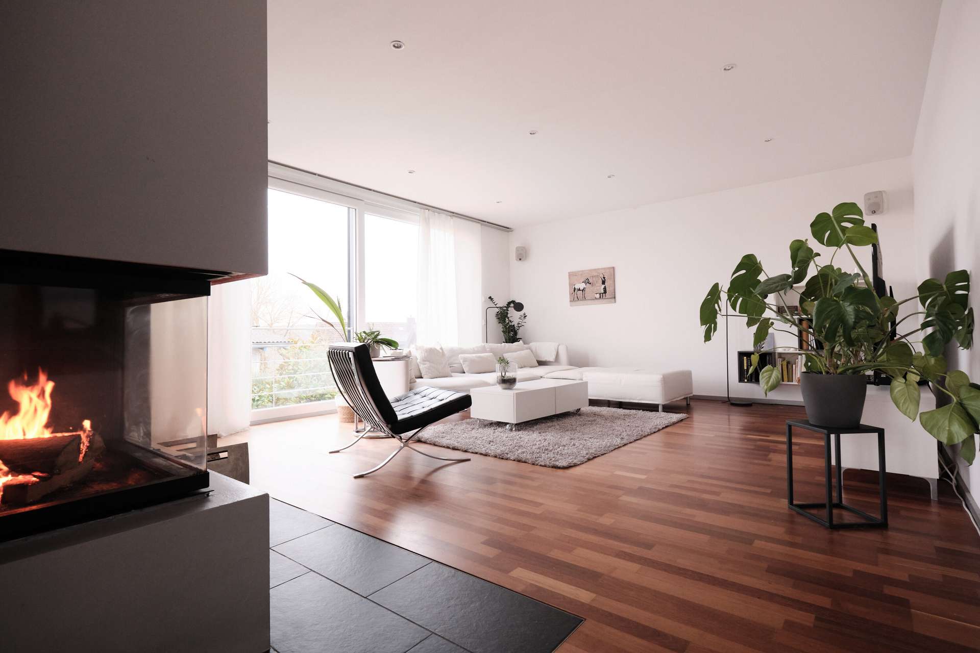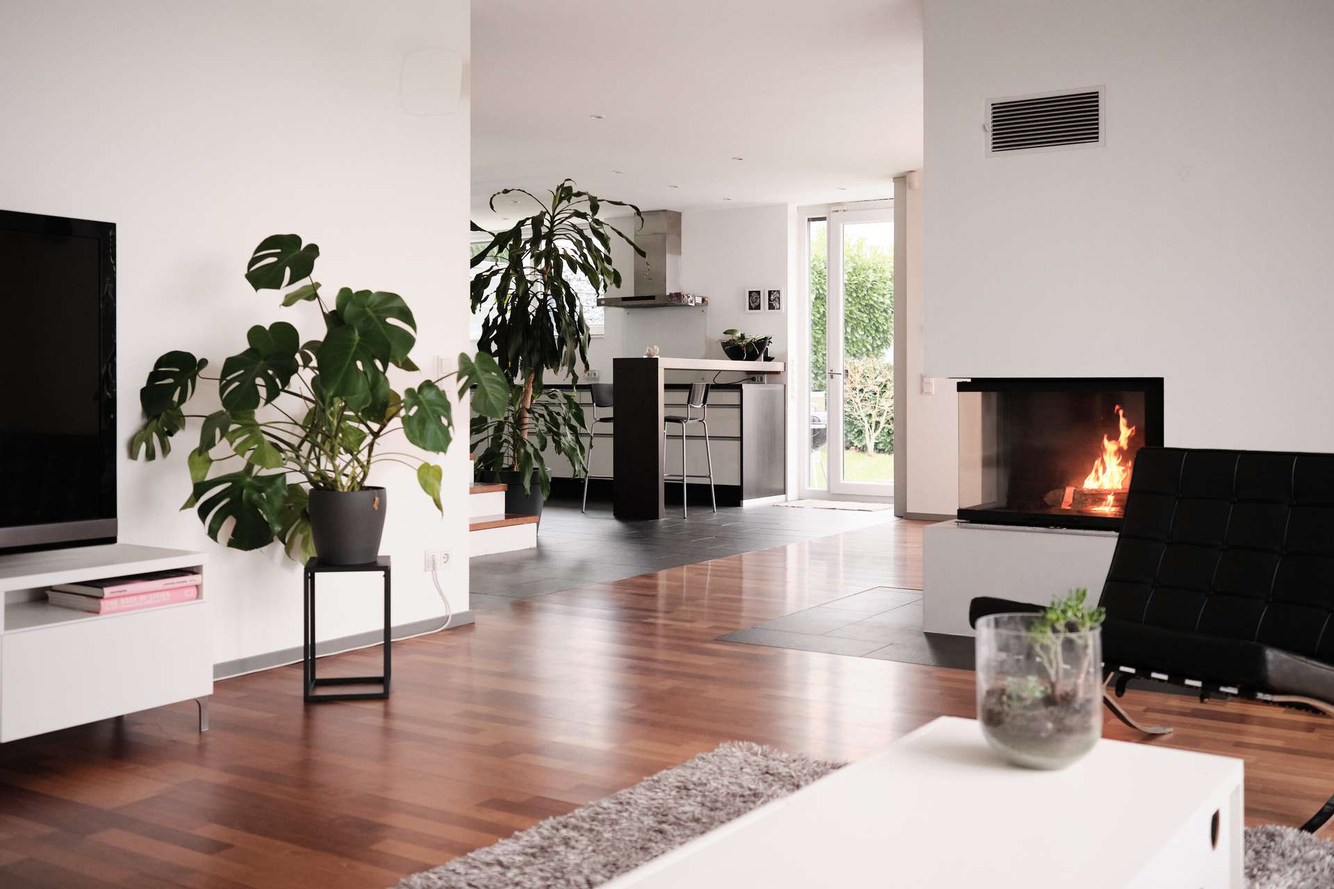 Über eine Treppe an der Seite des Hauses erreicht man das Wohngeschoss, das sich aufgrund der Hanglage im ersten Obergeschoss befindet und sich in den Hang erstreckt. Ein kleiner Flur führt direkt links neben dem Eingang in den Gästebereich mit Gäste-WC und Dusche sowie einem praktischen Gästezimmer von etwa 10 qm, das sich auch ideal als Büro eignet. Die Trennung vom Wohnzimmer sorgt für Privatsphäre und Ruhe beim Arbeiten. Der restliche Bereich ist nahezu vollständig offen und dadurch sehr geräumig. Ein moderner, offener Kamin trennt Wohn- und Esszimmer, während die große, offene Küche mit Einbauküche direkt daneben liegt und im Preis inbegriffen ist. An das Esszimmer bzw. die Küche grenzt eine riesige Terrasse mit einem nach Süden ausgerichteten Garten, der kaum einsehbar ist. Die Terrasse ist mit Holz ausgelegt und geht über eine kleine Stufe in den Rasenbereich über. Der Flur und der Küchenbereich sind mit schieferfarbenen Steinfliesen ausgelegt, der Wohn- und Essbereich mit Vollholzparkett. Bodentiefe Fenster und in der Decke eingelassene Spots sorgen für eine gleichmäßige Beleuchtung. Besonders ansprechend ist die gemauerte Treppe mit Holzstufen, die ins Obergeschoss führt.