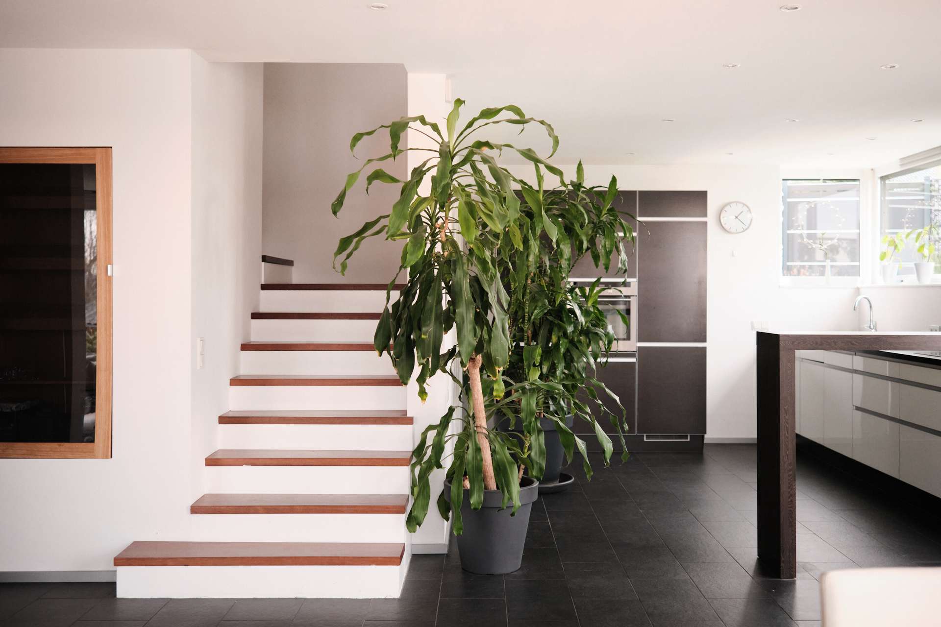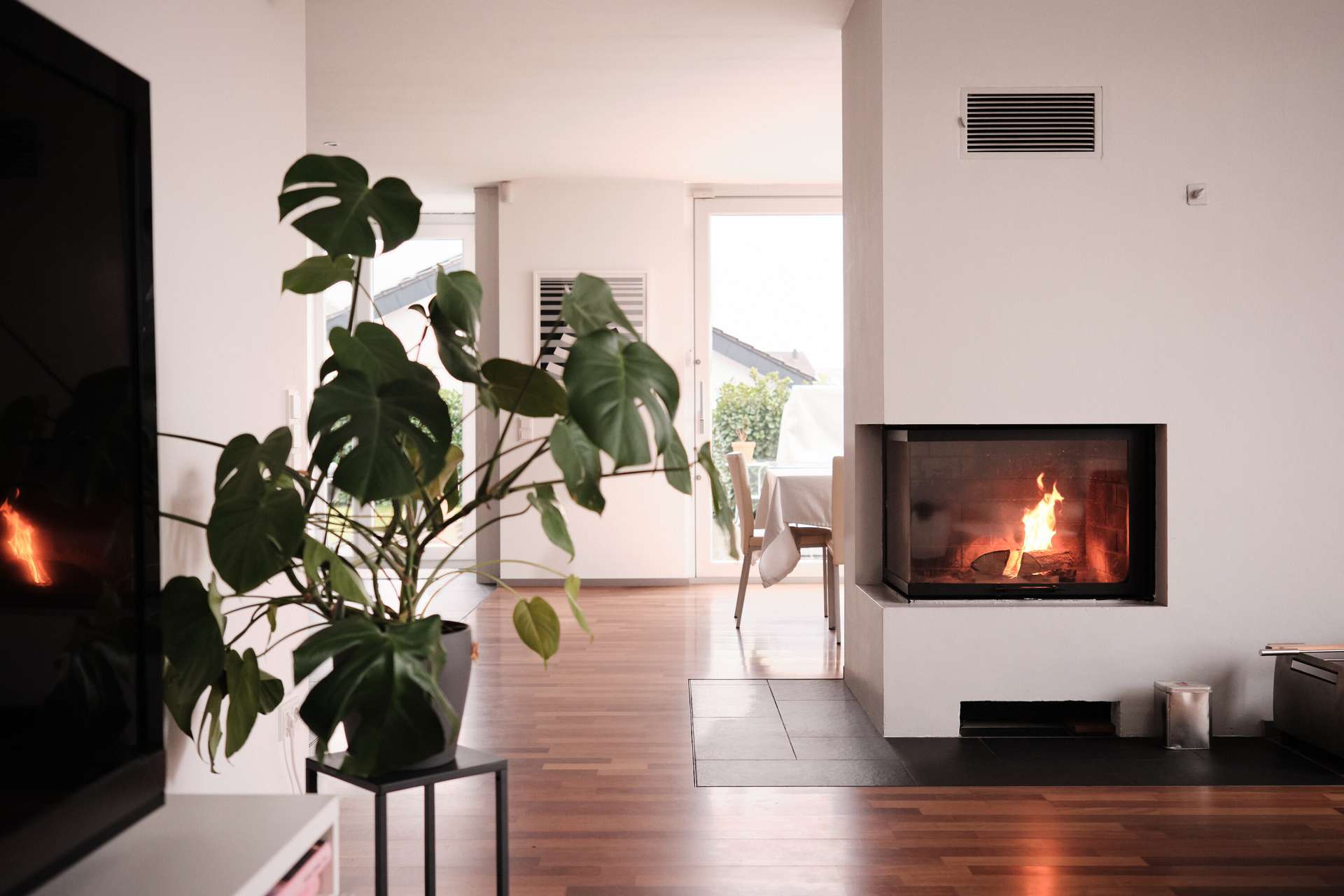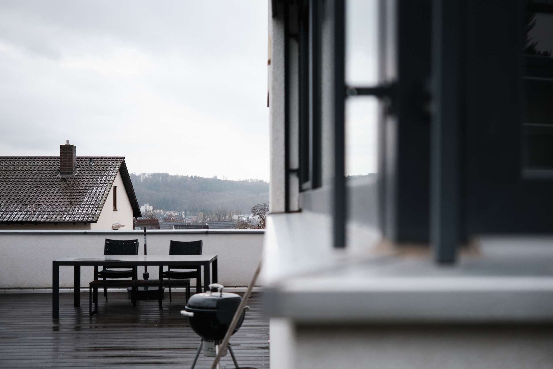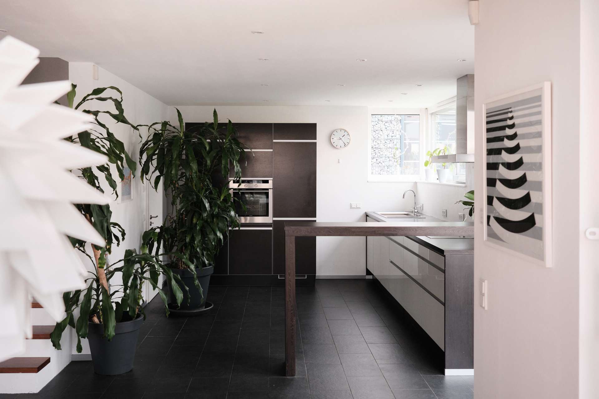 Über eine Treppe an der Seite des Hauses erreicht man das Wohngeschoss, das sich aufgrund der Hanglage im ersten Obergeschoss befindet und sich in den Hang erstreckt. Ein kleiner Flur führt direkt links neben dem Eingang in den Gästebereich mit Gäste-WC und Dusche sowie einem praktischen Gästezimmer von etwa 10 qm, das sich auch ideal als Büro eignet. Die Trennung vom Wohnzimmer sorgt für Privatsphäre und Ruhe beim Arbeiten. Der restliche Bereich ist nahezu vollständig offen und dadurch sehr geräumig. Ein moderner, offener Kamin trennt Wohn- und Esszimmer, während die große, offene Küche mit Einbauküche direkt daneben liegt und im Preis inbegriffen ist. An das Esszimmer bzw. die Küche grenzt eine riesige Terrasse mit einem nach Süden ausgerichteten Garten, der kaum einsehbar ist. Die Terrasse ist mit Holz ausgelegt und geht über eine kleine Stufe in den Rasenbereich über. Der Flur und der Küchenbereich sind mit schieferfarbenen Steinfliesen ausgelegt, der Wohn- und Essbereich mit Vollholzparkett. Bodentiefe Fenster und in der Decke eingelassene Spots sorgen für eine gleichmäßige Beleuchtung. Besonders ansprechend ist die gemauerte Treppe mit Holzstufen, die ins Obergeschoss führt.