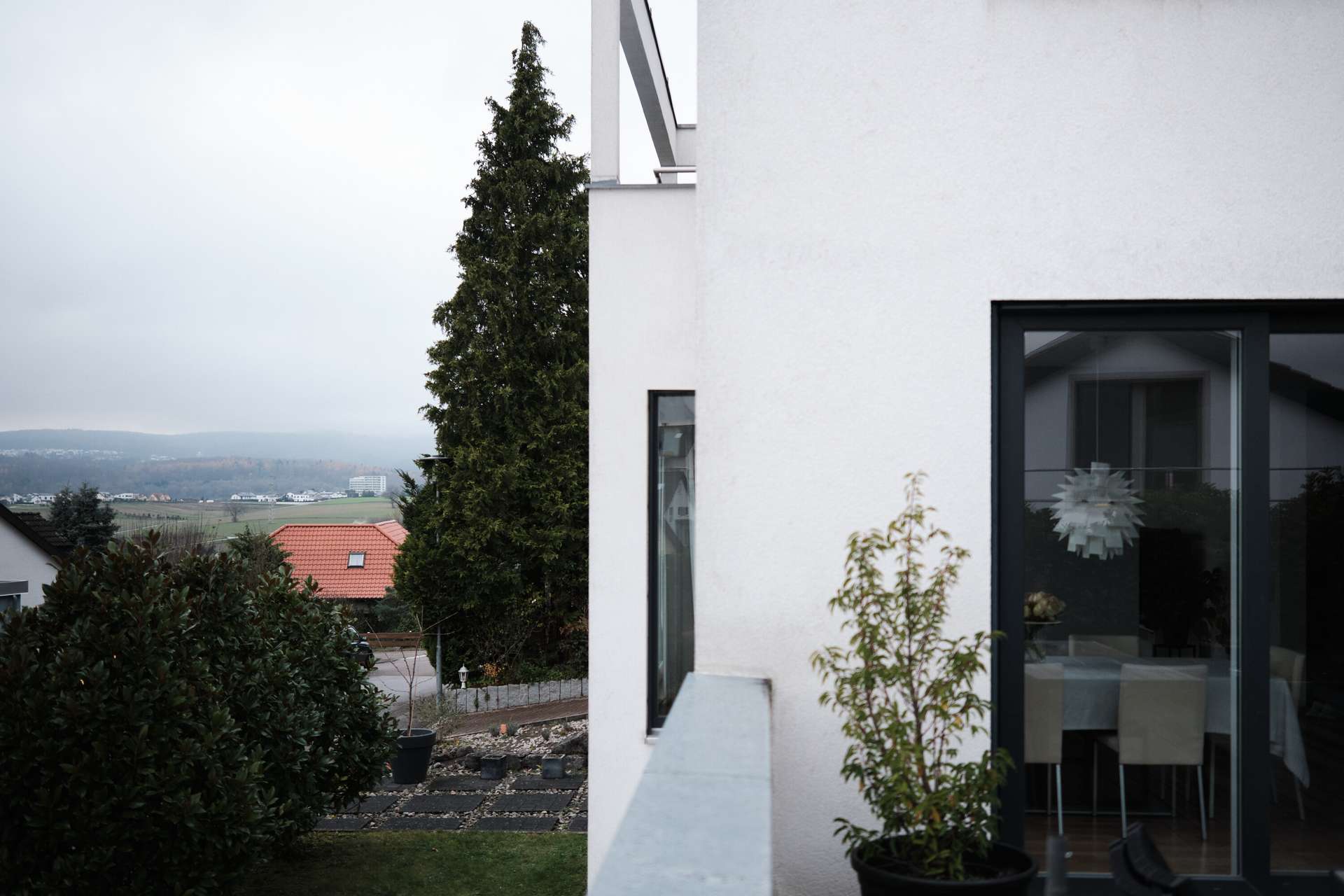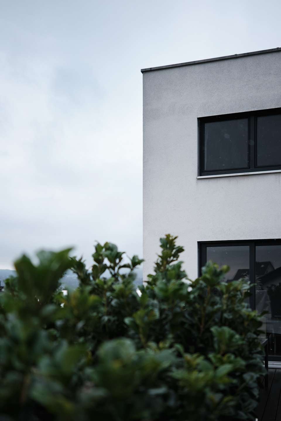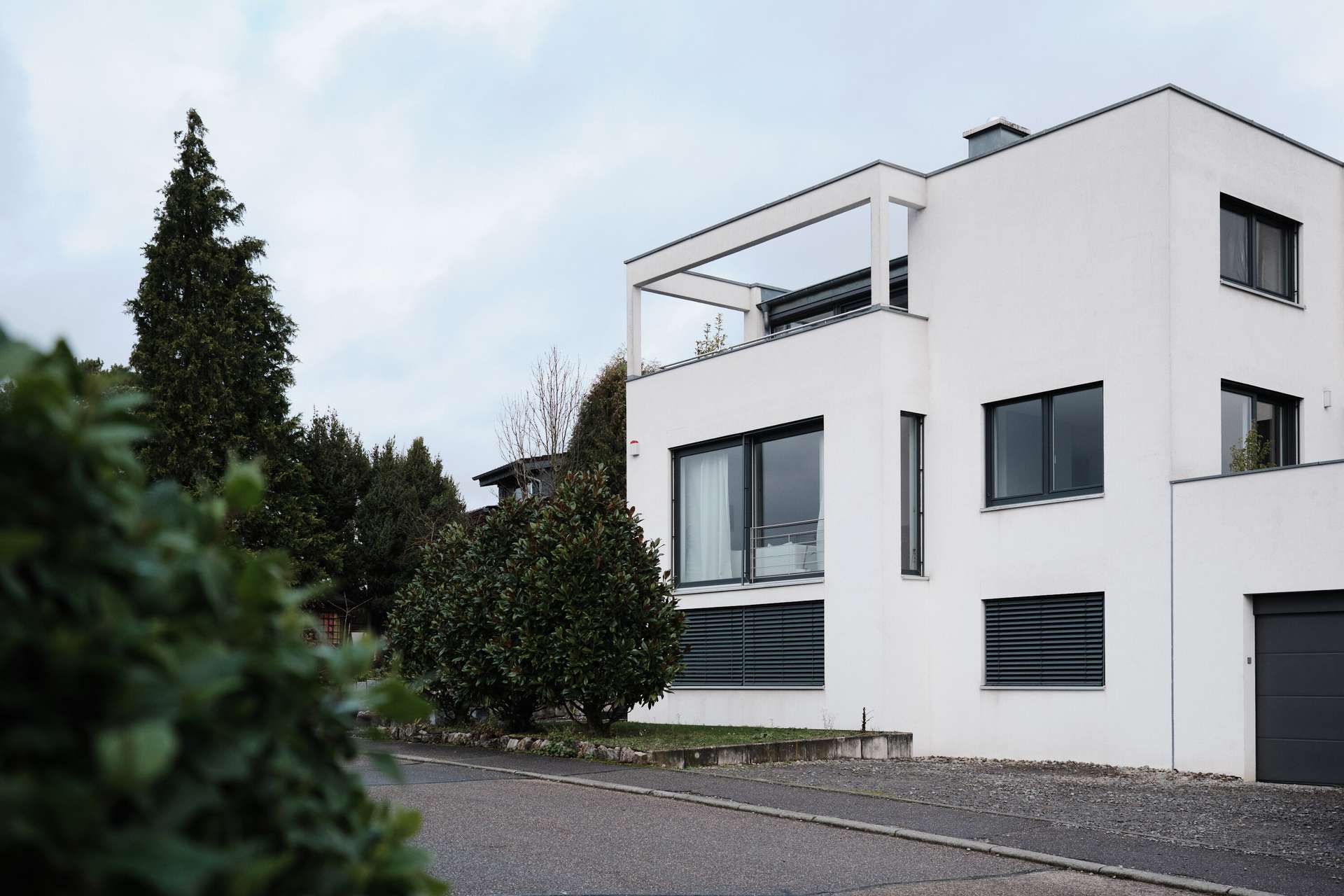 Das moderne Haus im Bauhausstil mit Flachdach erstreckt sich über zwei Vollgeschosse plus Untergeschoss (Einliegerwohnung) auf Straßenniveau. Dort befindet sich auch die großzügige Doppelgarage mit einer Fläche von 45 qm, die Platz für bis zu zwei Autos sowie Platz für Fahrräder, Kinderwägen bietet oder als zusätzlicher Stauraum neben dem 20 qm großen Keller dient. Im Erdgeschoss befindet sich auch die vermietete Einliegerwohnung mit eigenem Eingang. Die 65 qm Wohnfläche teilen sich auf ein Wohnzimmer mit offener Küche, ein geräumiges Schlafzimmer, ein innenliegendes Bad und eine Abstellkammer auf. Derzeit ist die Wohnung vollständig vom Rest des Hauses abgetrennt, kann jedoch durch geringfügige Umbauten angepasst werden.