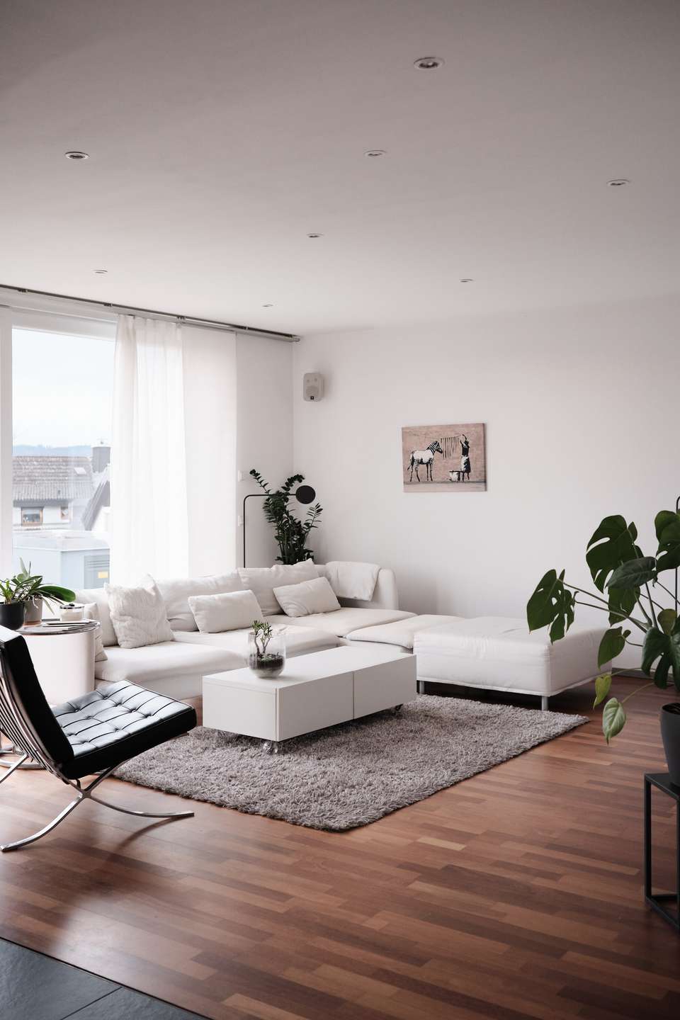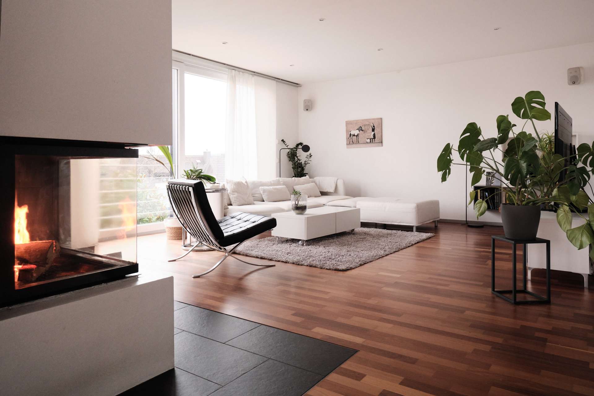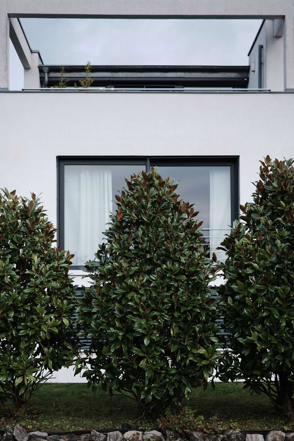 Das moderne Haus im Bauhausstil mit Flachdach erstreckt sich über zwei Vollgeschosse plus Untergeschoss (Einliegerwohnung) auf Straßenniveau. Dort befindet sich auch die großzügige Doppelgarage mit einer Fläche von 45 qm, die Platz für bis zu zwei Autos sowie Platz für Fahrräder, Kinderwägen bietet oder als zusätzlicher Stauraum neben dem 20 qm großen Keller dient. Im Erdgeschoss befindet sich auch die vermietete Einliegerwohnung mit eigenem Eingang. Die 65 qm Wohnfläche teilen sich auf ein Wohnzimmer mit offener Küche, ein geräumiges Schlafzimmer, ein innenliegendes Bad und eine Abstellkammer auf. Derzeit ist die Wohnung vollständig vom Rest des Hauses abgetrennt, kann jedoch durch geringfügige Umbauten angepasst werden.