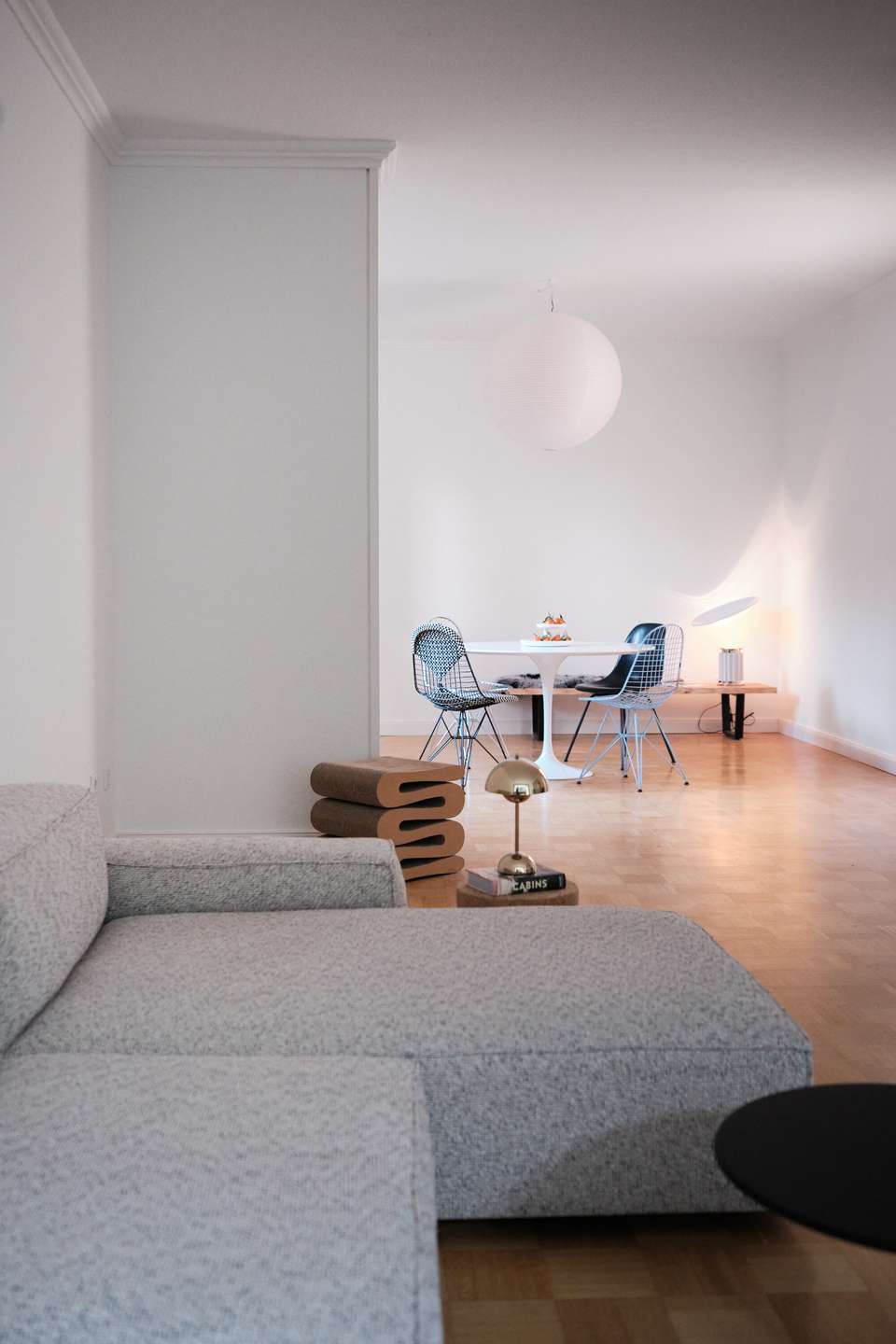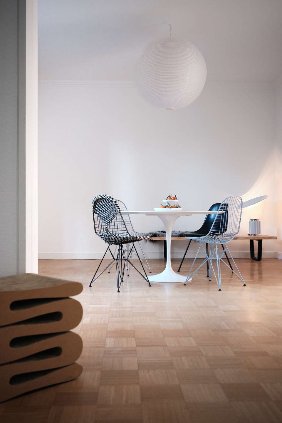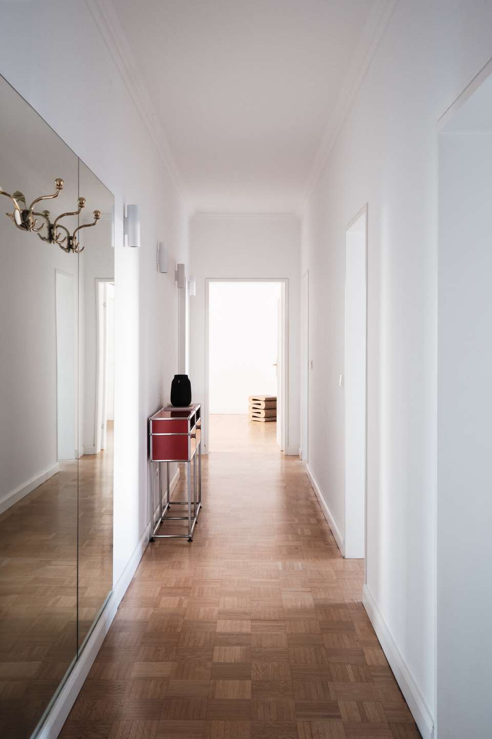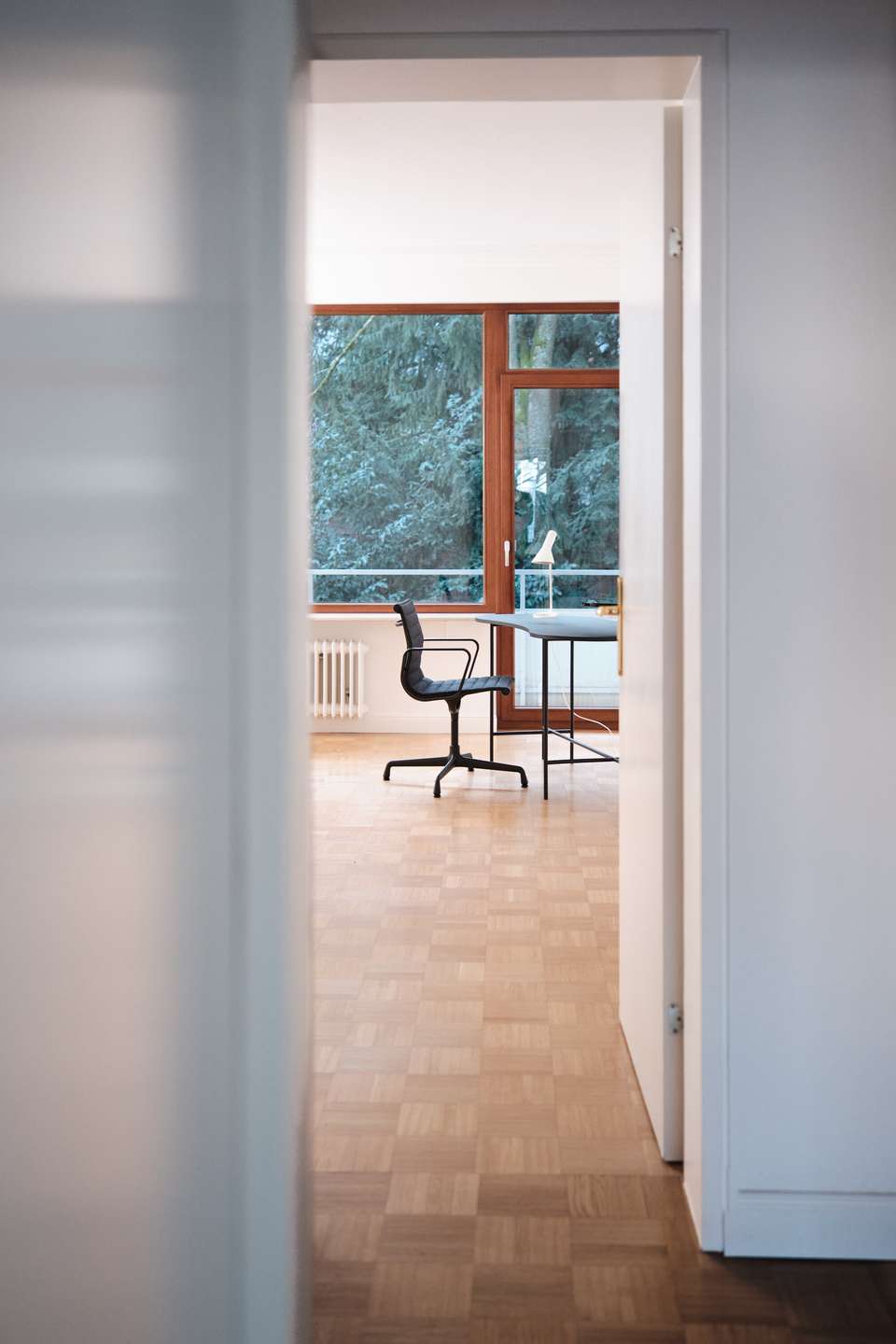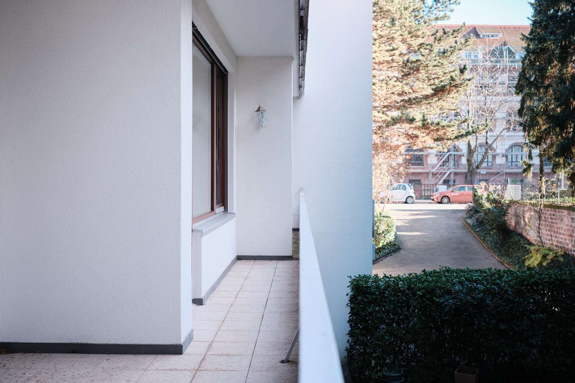Das Besondere an dieser Wohnung ist mit Sicherheit der Grundriss, der für eine kleine Familie mit Kind oder ein Paar perfekt geschnitten ist. 125 qm auf einer Ebene mit klarer Aufteilung, großen Schlafzimmern und einem riesigen Wohn-/Esszimmer findet man nicht oft. Dabei liegt die Wohnung im ruhigen Neuenheimer Westen mit kurzen Wegen zu den Kliniken und zur Autobahn nach Mannheim, ohne dass man davon etwas mitbekommt. Durch die Lage im Hochparterre muss man gerade einmal 5 Stufen überwinden, um in die Wohnung zu gelangen. Dennoch liegt sie hoch genug, dass sie von der Straße aus nicht direkt einsehbar ist. Nach Betreten der Wohnung steht man in einem langen Flur, von dem alle Zimmer abgehen. Gleich rechts befindet sich das Gäste-WC, das – getrennt von einer Schiebetür – in das große Tageslichtbad übergeht (ebenfalls mit WC). Das große Bad ist mit dem Schlafzimmer verbunden, das sich direkt daneben befindet und natürlich auch vom Flur aus zugänglich ist. Es ist eines von zwei großen Schlafzimmern und eignet sich als Elternschlafzimmer. Gegenüber liegt das potenzielle Kinder- oder Arbeitszimmer, das sogar noch etwas größer ist als das Elternschlafzimmer. Es hat außerdem Zugang zum großen Balkon, der auch vom Wohnzimmer aus begehbar ist und den Blick ins Grüne öffnet. Dieses Zimmer war ursprünglich mit einer Schiebetür vom Wohnzimmer getrennt. Der Durchgang wurde geschlossen und mit einem Einbaubücherregal ergänzt. Theoretisch kann man diesen Durchgang wieder öffnen, mit Kind bietet sich jedoch das abgeschlossene Zimmer an. Am Ende des Flurs befindet sich rechts die abgeschlossene Küche mit Einbauküche, mit Tür zum Flur und direkt in das Esszimmer, das mit dem Wohnzimmer verbunden ist und einen riesigen Raum am Ende des Flurs entstehen lässt. So ist der Grundriss klar und praktisch aufgeteilt, bietet aber gleichzeitig eine offene, großzügige Atmosphäre auf knapp 125 qm Wohnfläche mit Balkon.