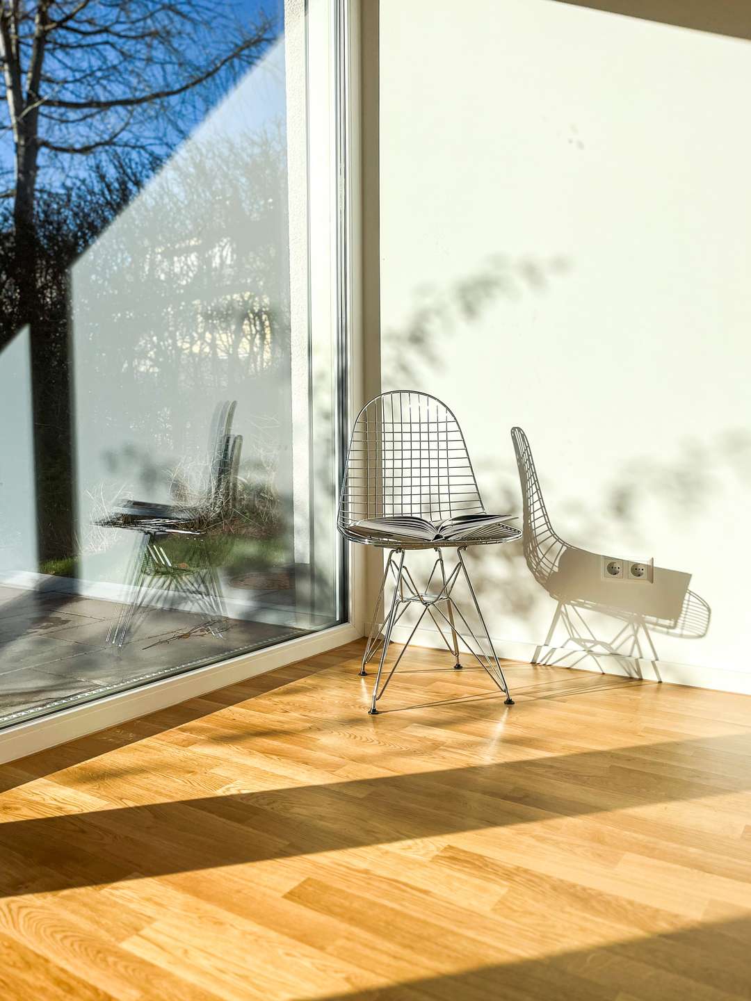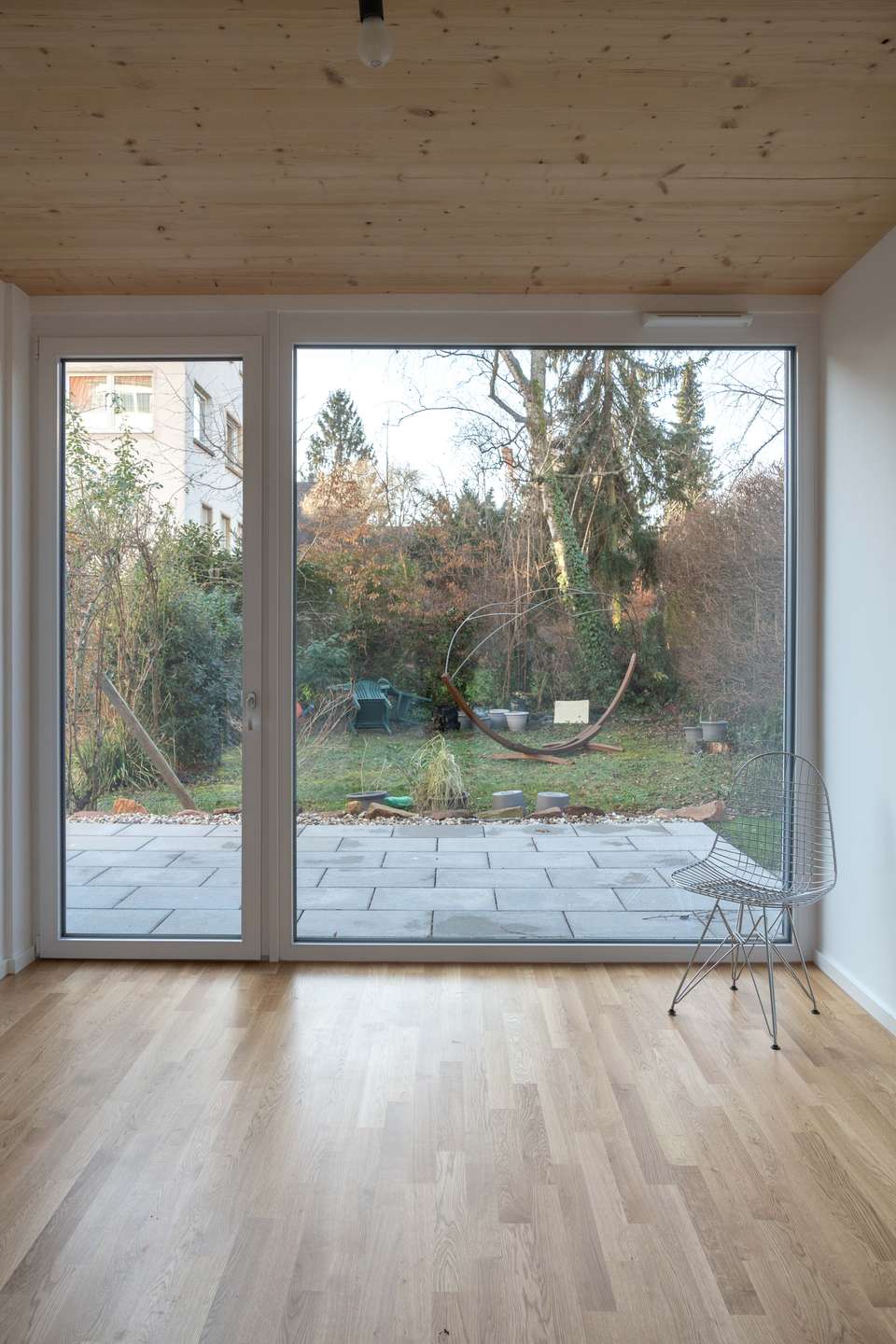 Die Wohnung bietet insgesamt eine sehr naturnahe Atmosphäre, unterstützt durch den Blick in den grünen Garten und die Verwendung natürlicher Materialien.