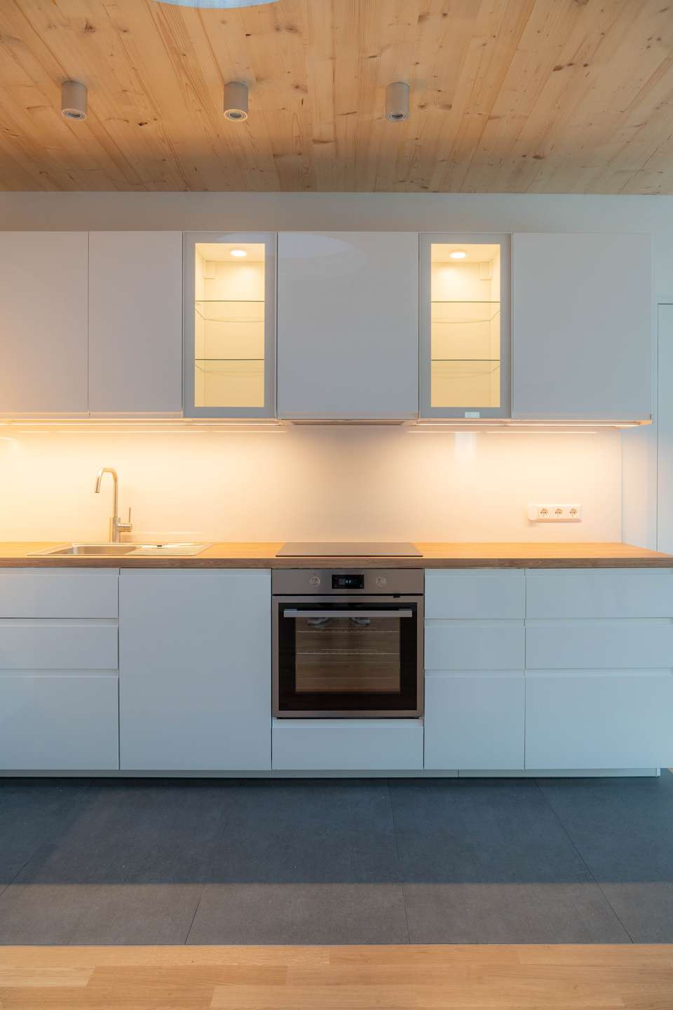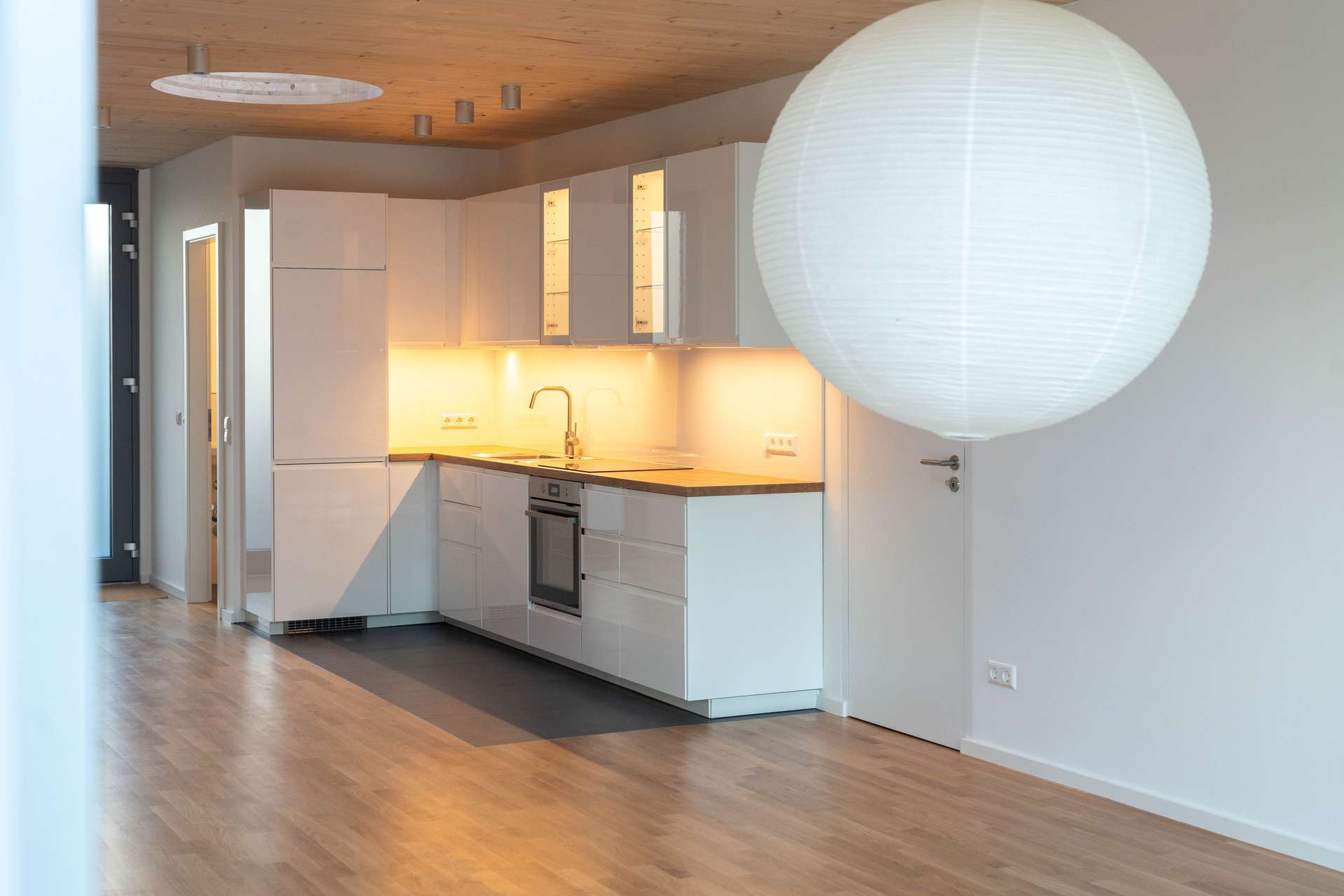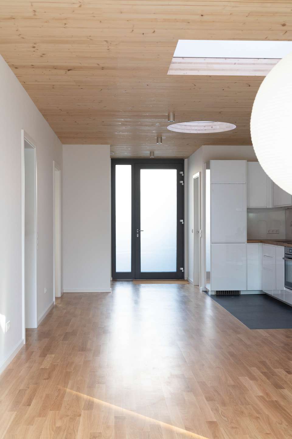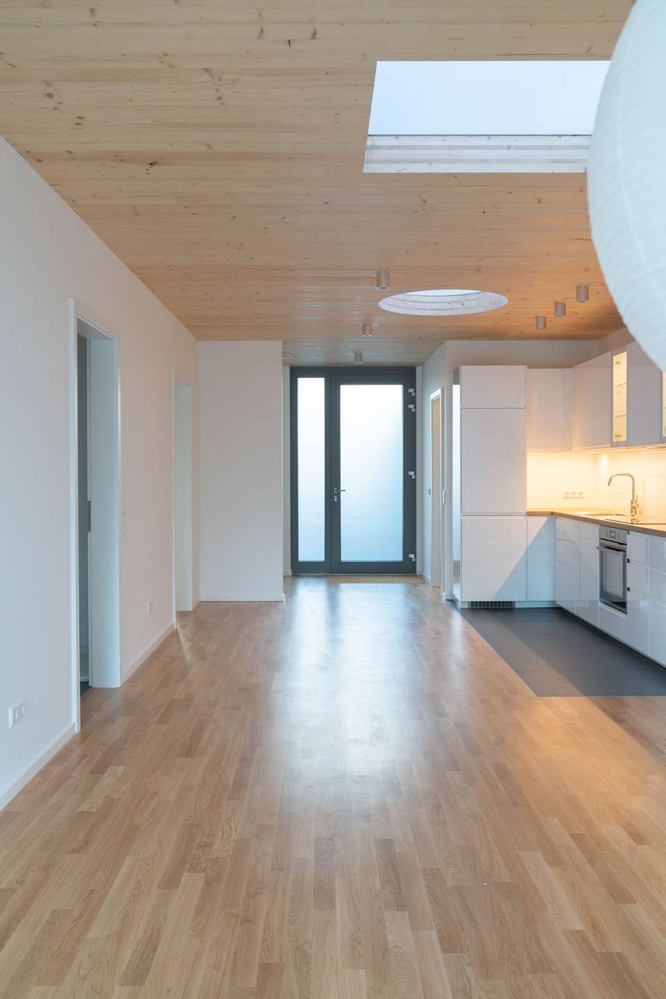 Der offene Wohnraum ist mit einer Einbauküche ausgestattet, die sich perfekt in den Grundriss einfügt. Dieser 37 qm große Bereich ist komplett nach Westen ausgerichtet, und raumhohe Glasschiebetüren zur Terrasse bzw. dem Garten ermöglichen eine optimale Verbindung zwischen Innen- und Außenbereich. Die Wohnung bietet insgesamt eine sehr naturnahe Atmosphäre, unterstützt durch den Blick in den grünen Garten und die Verwendung natürlicher Materialien. Boden und Decke sind mit hellem Holz verkleidet, und großzügige Öffnungen in der Decke lassen viel Tageslicht herein.