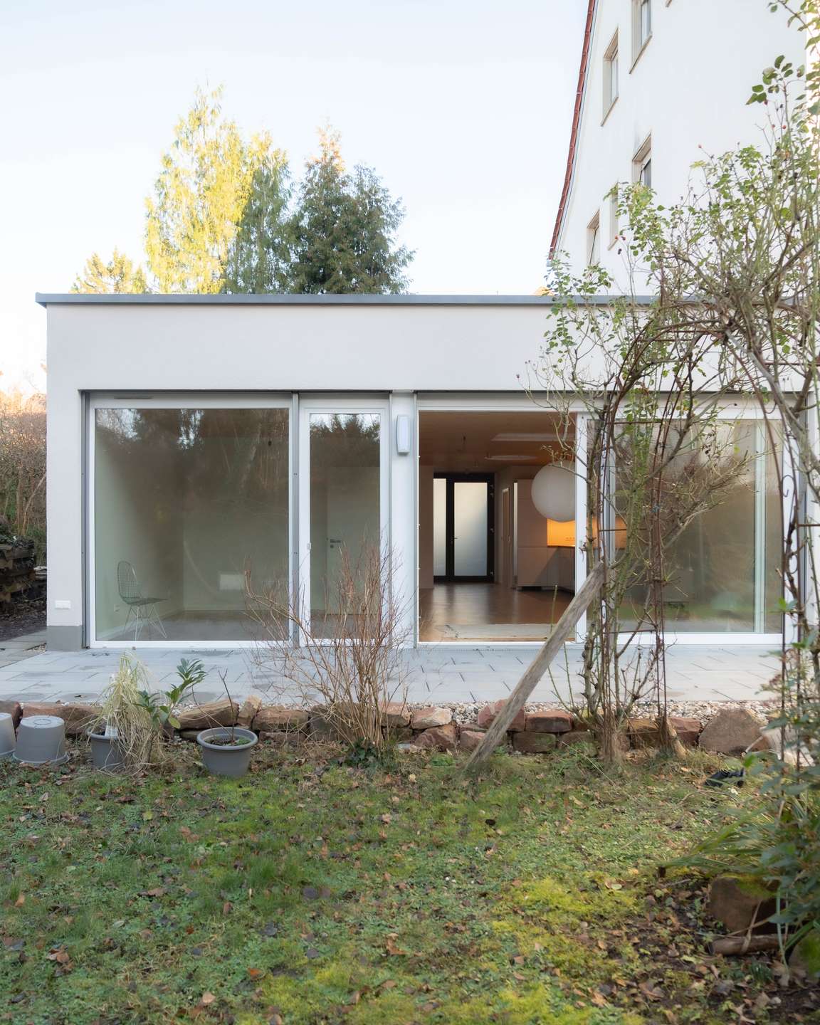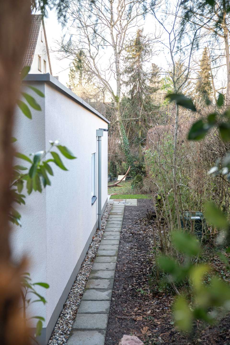 Der neu errichtete Bungalow in Handschuhsheim ist direkt an das Nachbarhaus angebaut worden und steht damit an drei Seiten frei, ähnlich einem kleinen Einfamilienhaus. Der Bungalow verfügt über eine Ost-und eine großzügige West-Terrasse. Innen prägt vor allem Holz die Ästhetik, was zu einer sehr hellen und skandinavisch anmutenden Atmosphäre beiträgt.