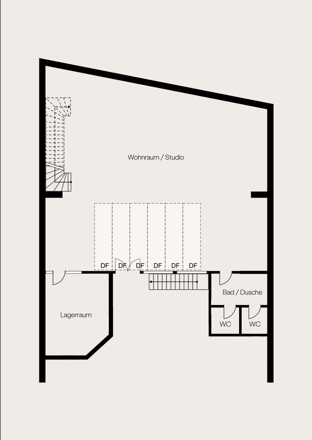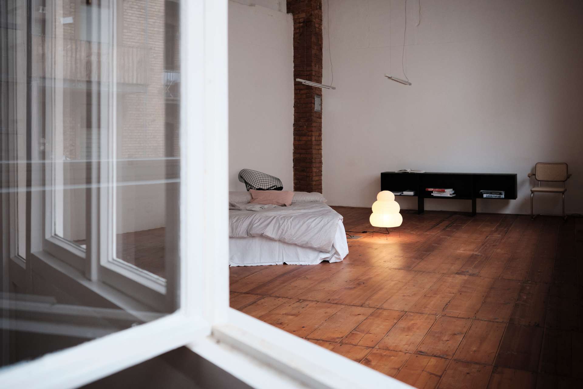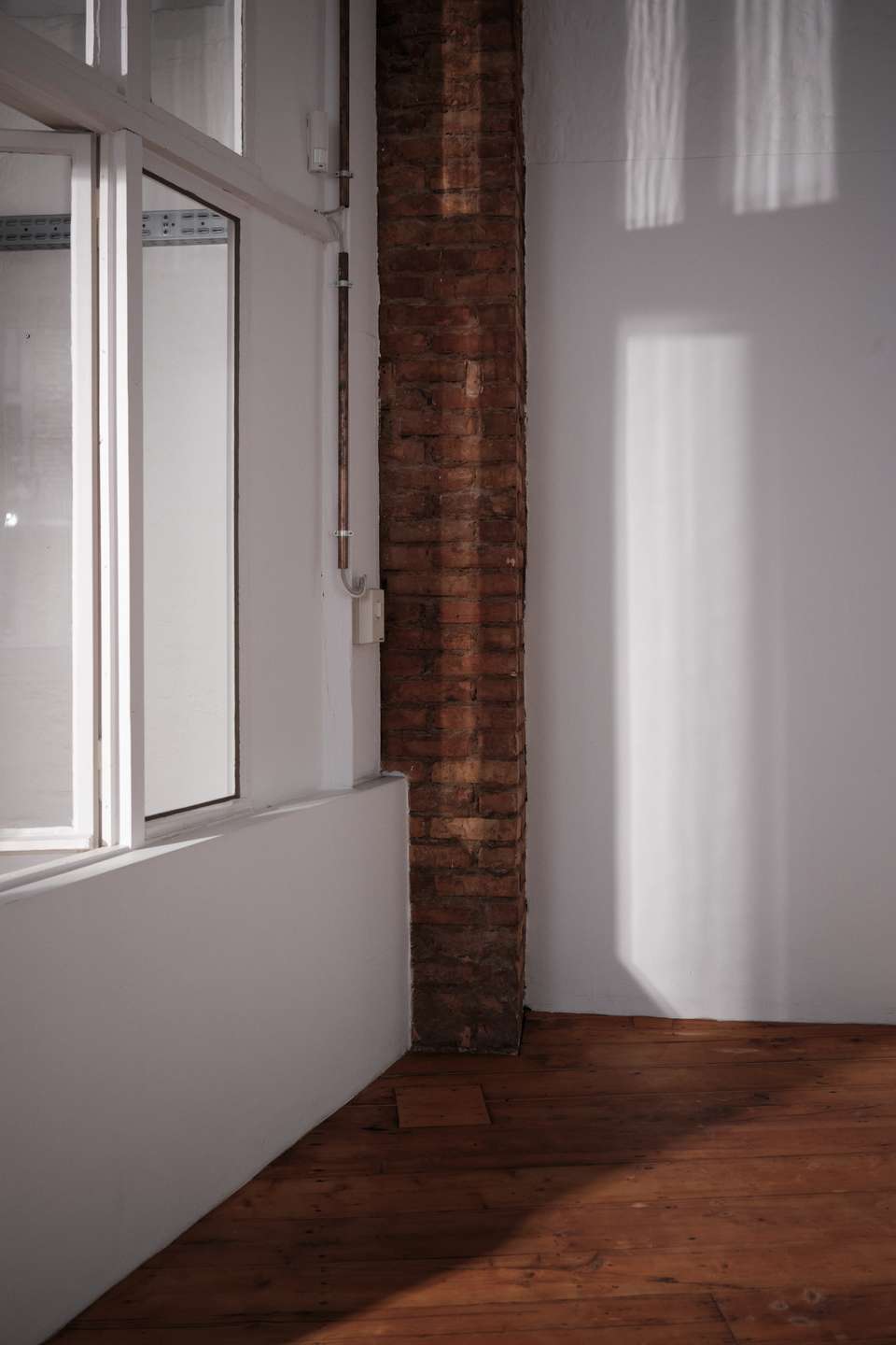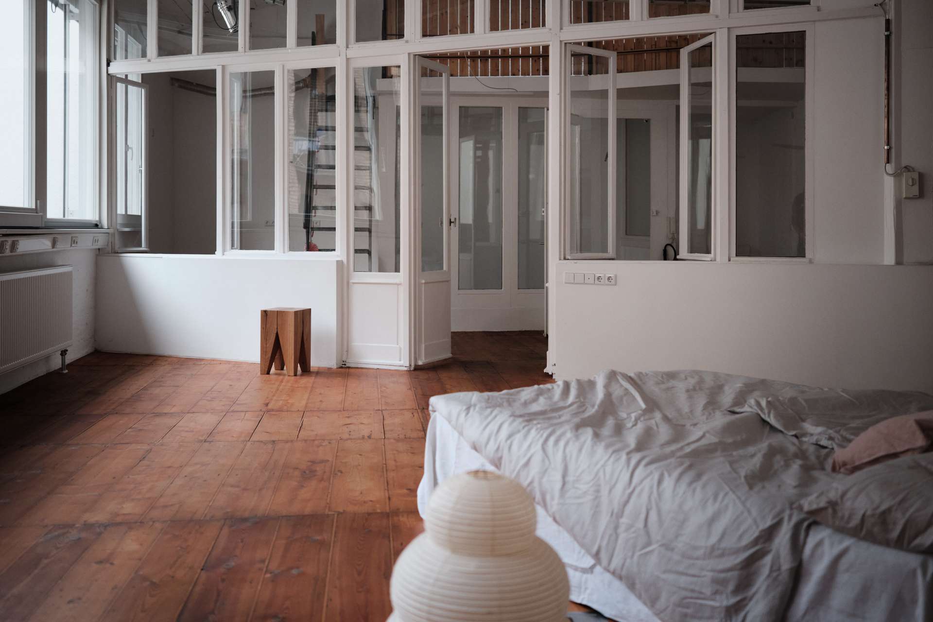Die geschwungene Treppe aus Holz bildet einen schönen Kontrast zu der klaren, schlichten Architektur des Gebäudes und führt hinauf ins Obergeschoss, wo sich ein Vorraum befindet, der mit einem Fenster/Tür-Element vom Schlafzimmer getrennt ist. Früher war hier oben eine kleine Küche und ein Essbereich eingerichtet, als der untere Raum noch als Fotostudio fungierte. Über dem Treppenaufgang befindet sich außerdem eine ca. 10 Quadratmeter große Empore die sich perfekt als Leseecke oder Stauraum nutzen lässt. Praktisch: vom Innenhof aus erreicht man über eine separate Außentreppe den über 50 Quadratmeter großen Keller, der in 4 Zellen aufgeteilt ist und zusätzlichen Lagerraum bietet. Das Schlafzimmer im Obergeschoss ist ausgesprochen groß und könnte auch bequem in zwei Zimmer und einen Flur umgebaut werden. Es ist vollständig mit Holzdielen ausgelegt und die Wände geben teilweise den Blick auf die ursprüngliche Backsteinwand frei. Ideal als großes Schlafzimmer, Arbeitszimmer oder Einzimmerwohnung.
