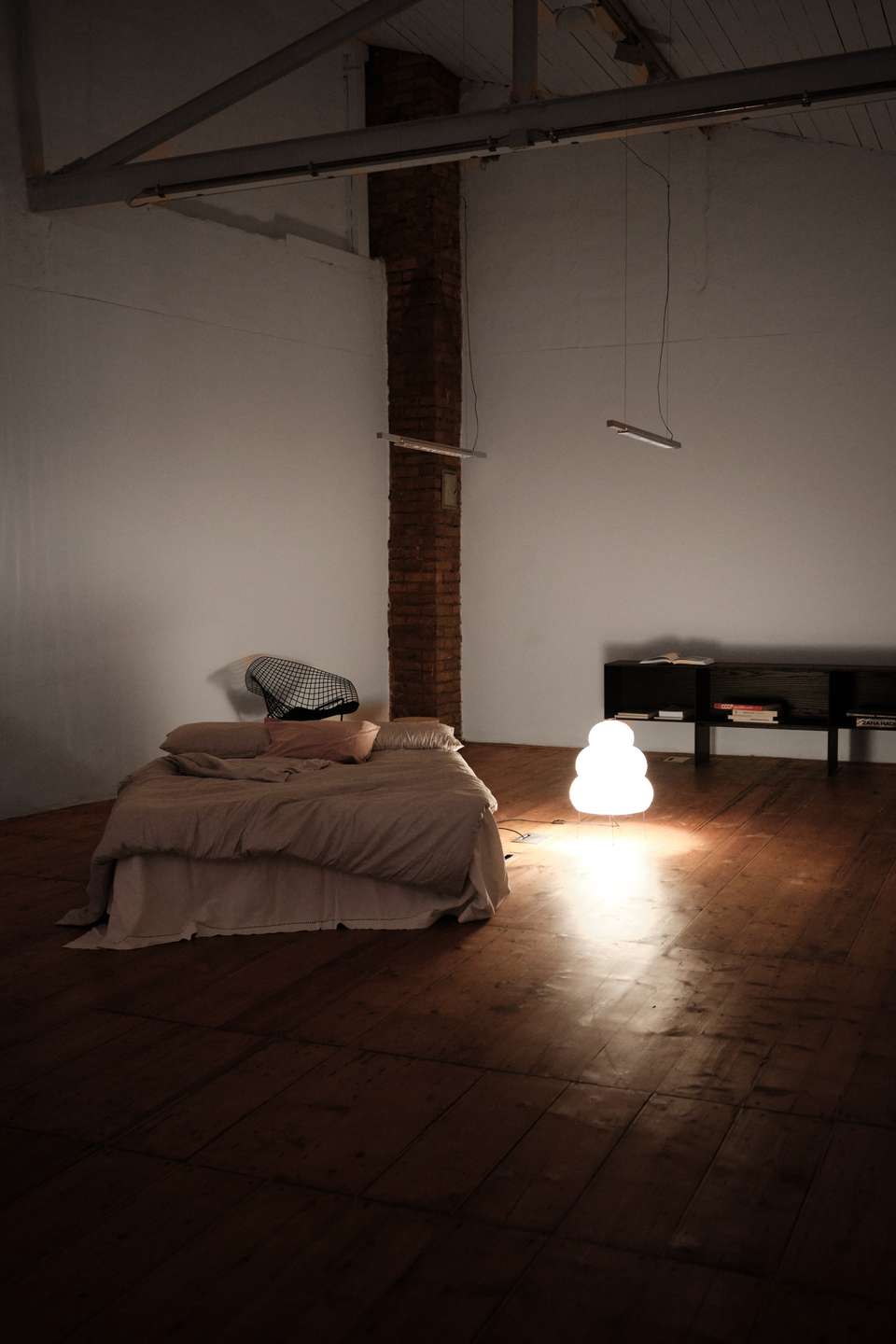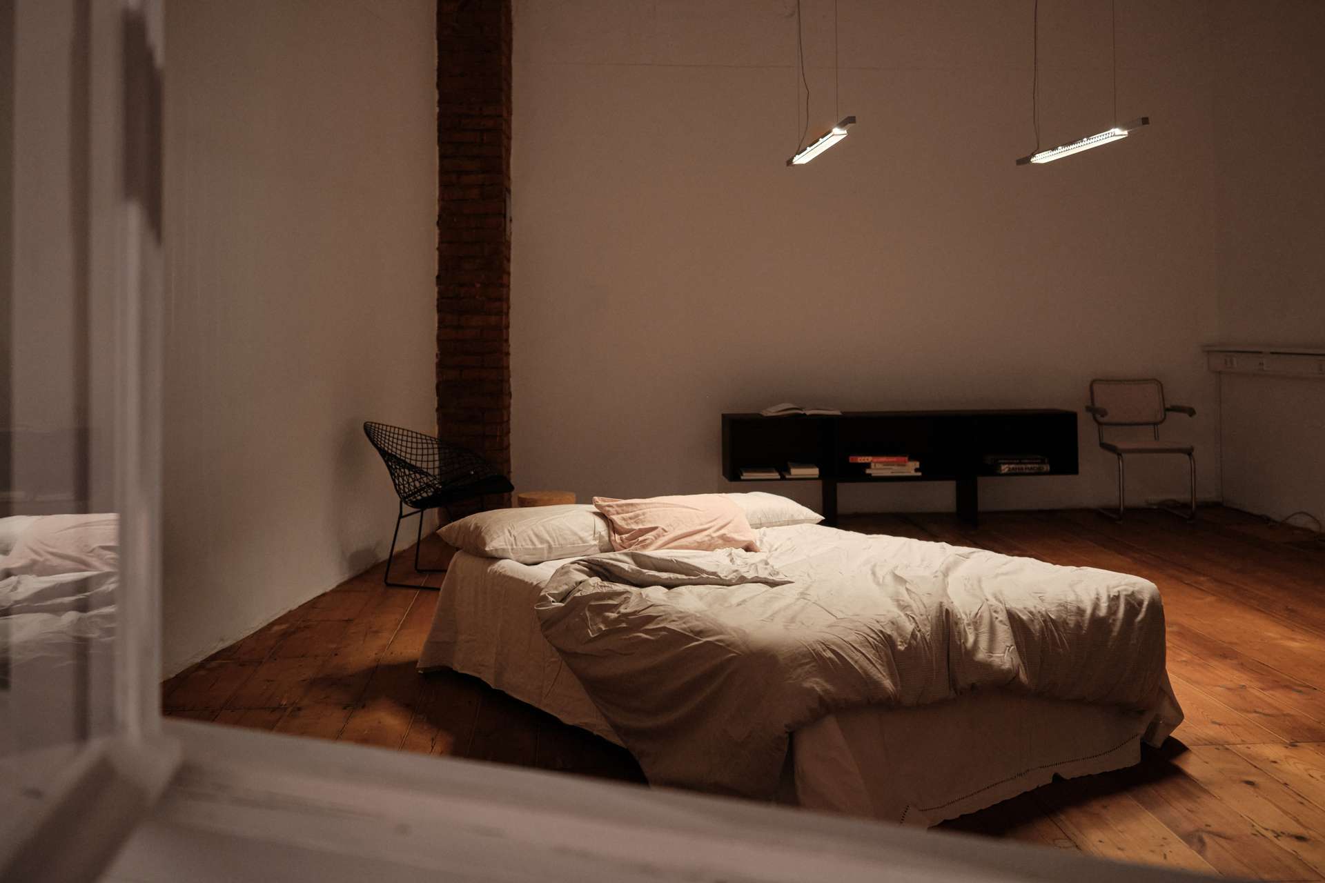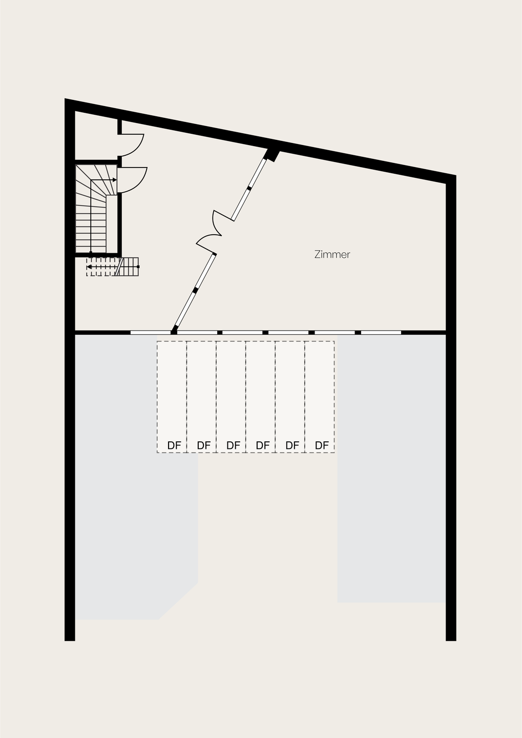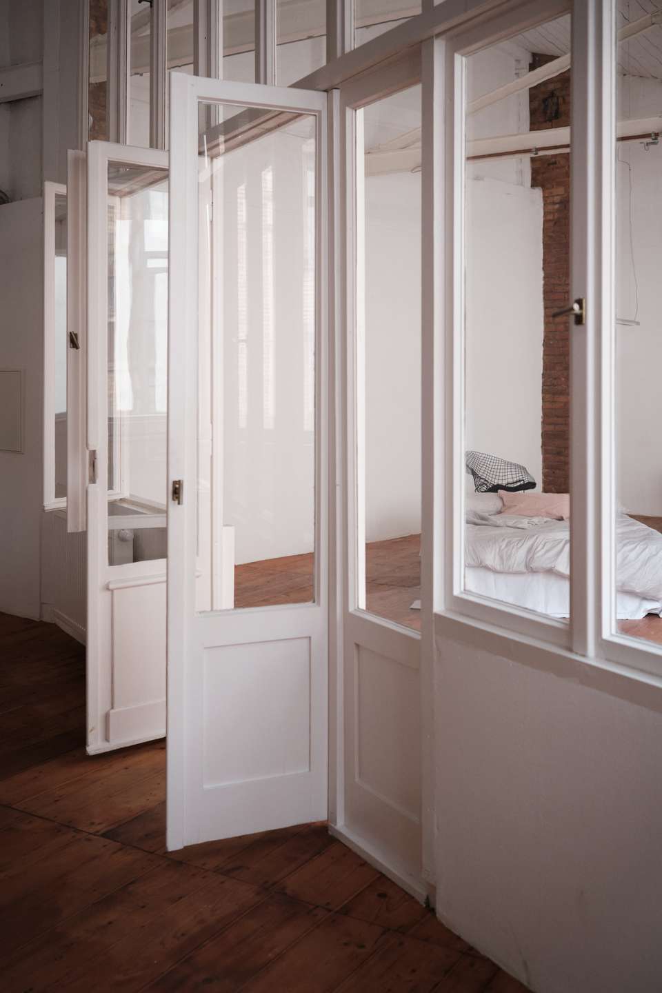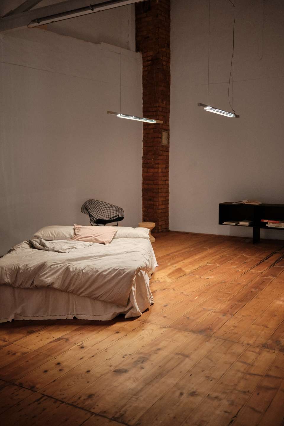 Die geschwungene Treppe aus Holz bildet einen schönen Kontrast zu der klaren, schlichten Architektur des Gebäudes und führt hinauf ins Obergeschoss, wo sich ein Vorraum befindet, der mit einem Fenster/Tür-Element vom Schlafzimmer getrennt ist. Früher war hier oben eine kleine Küche und ein Essbereich eingerichtet, als der untere Raum noch als Fotostudio fungierte. Über dem Treppenaufgang befindet sich außerdem eine ca. 10 Quadratmeter große Empore die sich perfekt als Leseecke oder Stauraum nutzen lässt. Praktisch: vom Innenhof aus erreicht man über eine separate Außentreppe den über 50 Quadratmeter großen Keller, der in 4 Zellen aufgeteilt ist und zusätzlichen Lagerraum bietet. Das Schlafzimmer im Obergeschoss ist ausgesprochen groß und könnte auch bequem in zwei Zimmer und einen Flur umgebaut werden. Es ist vollständig mit Holzdielen ausgelegt und die Wände geben teilweise den Blick auf die ursprüngliche Backsteinwand frei. Ideal als großes Schlafzimmer, Arbeitszimmer oder Einzimmerwohnung.