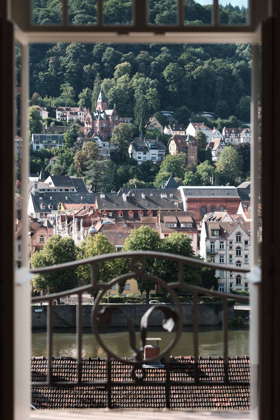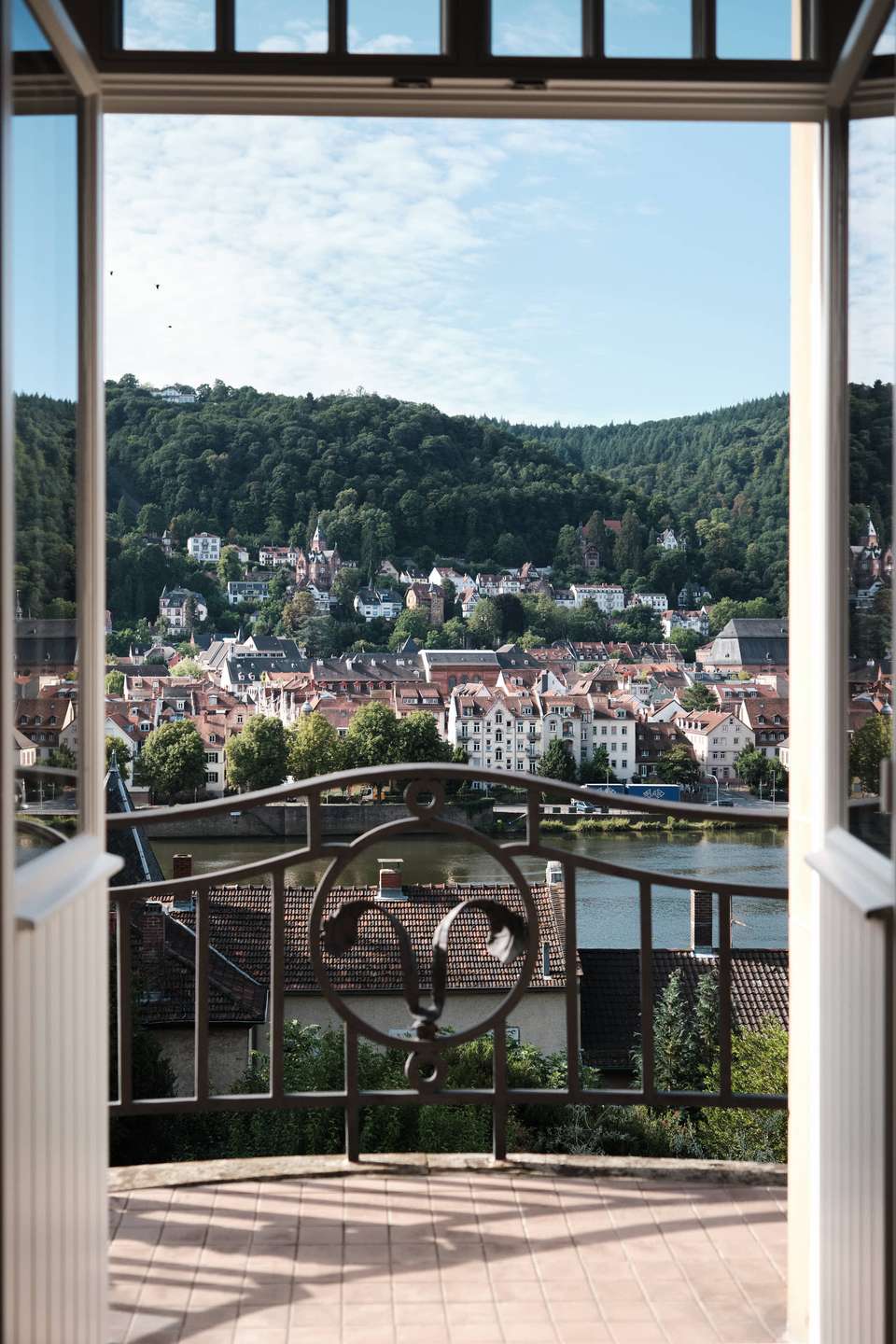 Auf der rechten Seite liegt das abgeschlossene Schlafzimmer – mit direktem Zugang zur großen, seitlich ausgerichteten Terrasse. Auch von hier reicht der Blick weit über die Stadt. Gegenüber befindet sich das Wohnzimmer mit drei hohen Sprossenfenstern und einem kleinen Balkon zur Neckarseite. Vom angrenzenden Esszimmer öffnet sich ebenfalls der Zugang zur Terrasse – mit einem beeindruckenden Panorama über Schloss, Altstadt und Flusslauf.