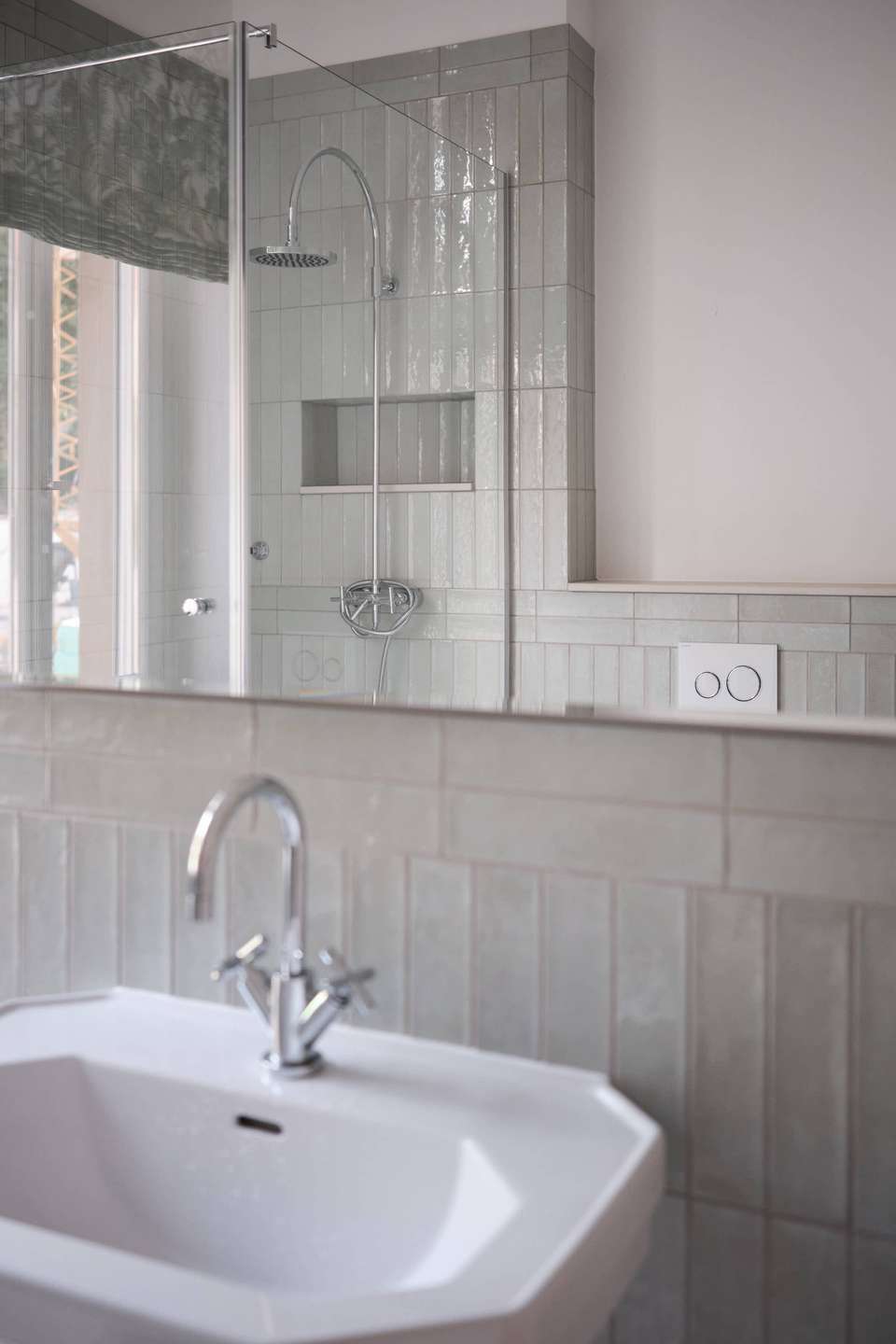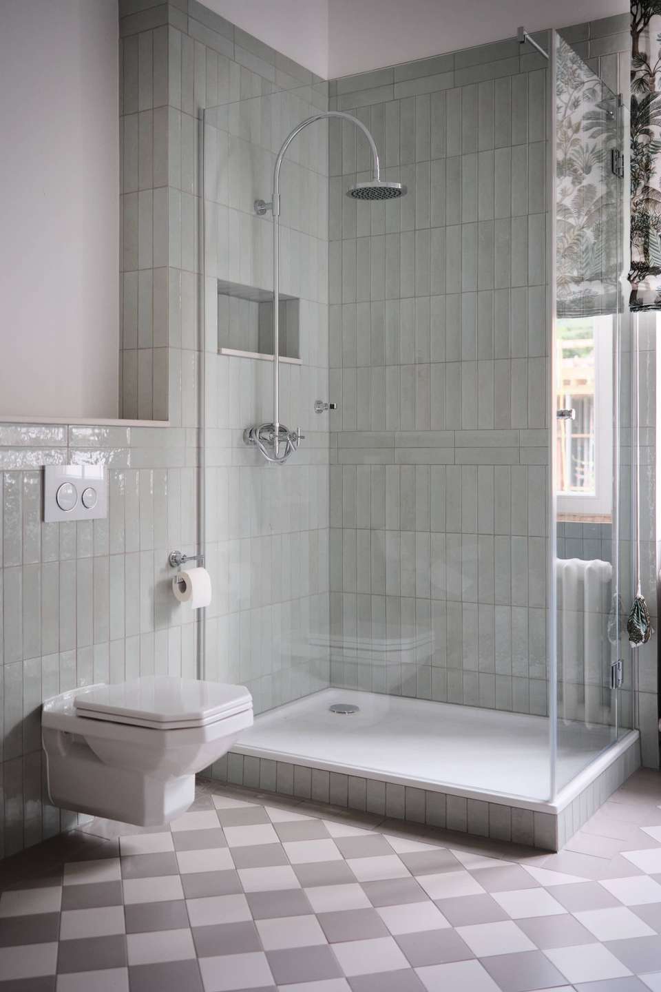 Ein separater Flur führt in den hinteren Teil der Wohnung mit Tageslichtbad, Gäste-WC und Küche. Das Badezimmer wurde vollständig erneuert: verbaut wurden Badgegenstände von Duravit, Armaturen von Dornbracht sowie ein beleuchteter Spiegel. Ein Stoffrollo von Manuel Canovas ergänzt die zurückhaltende Gestaltung.