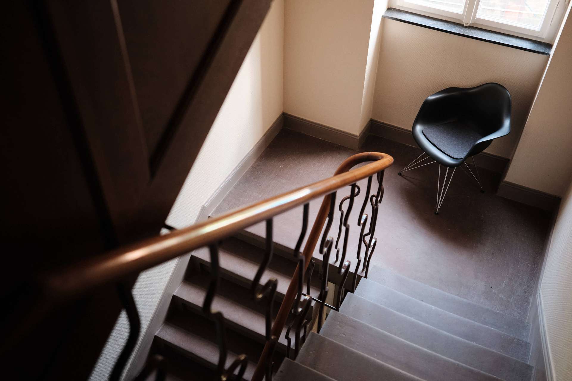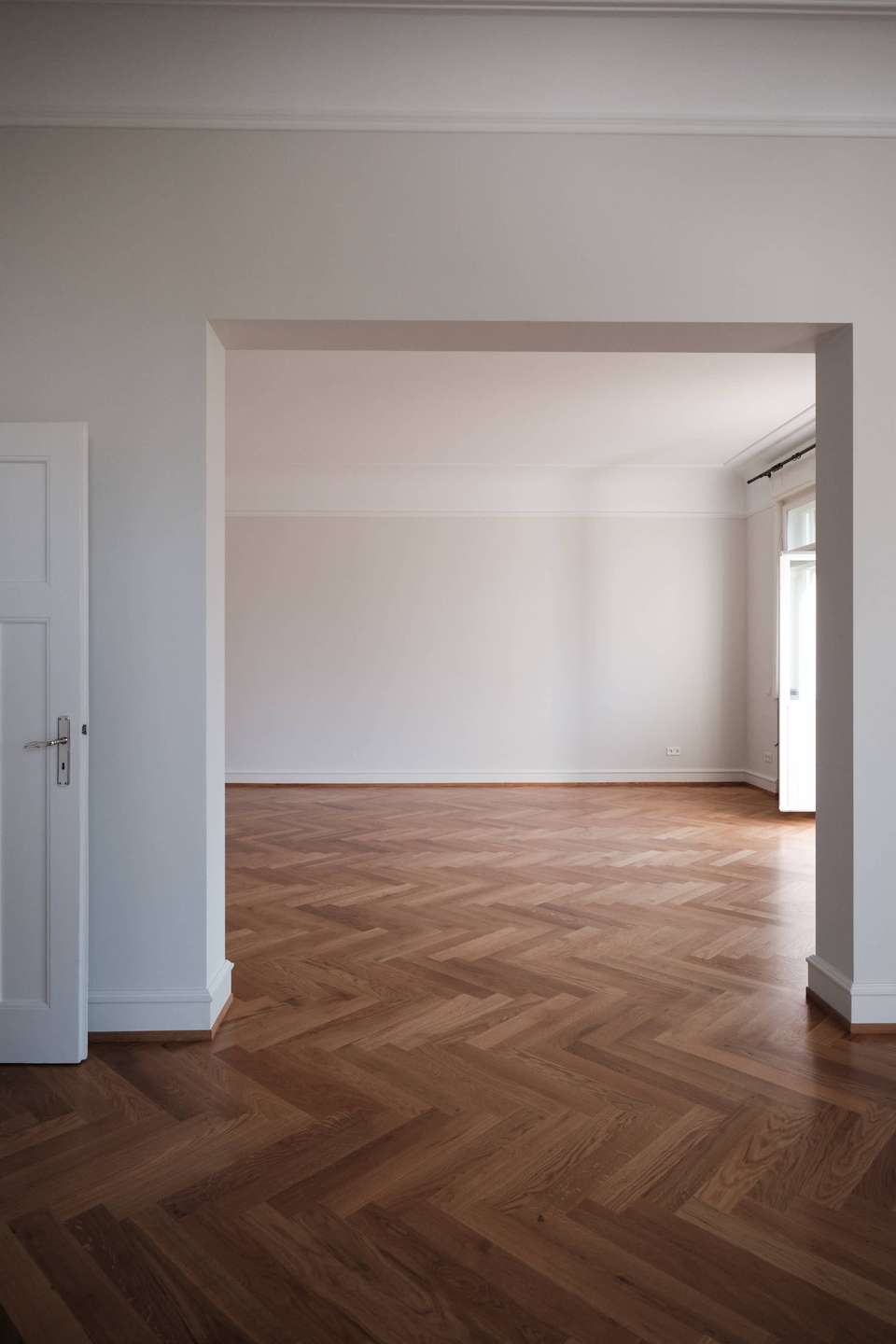 Schon das historische Treppenhaus mit originalem Terrazzo-Boden verweist auf die Substanz des Hauses. Oben, im ersten Obergeschoss, öffnet sich die Wohnung über eine großzügige Diele, die den Zugang zu allen Räumen klar strukturiert.