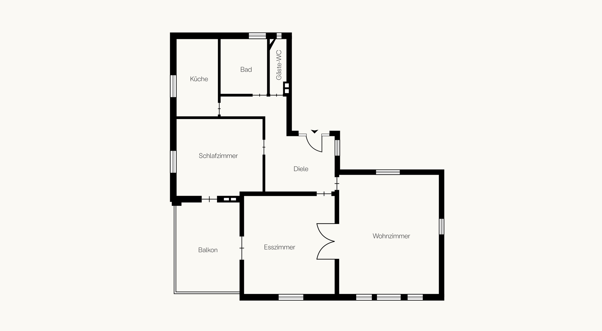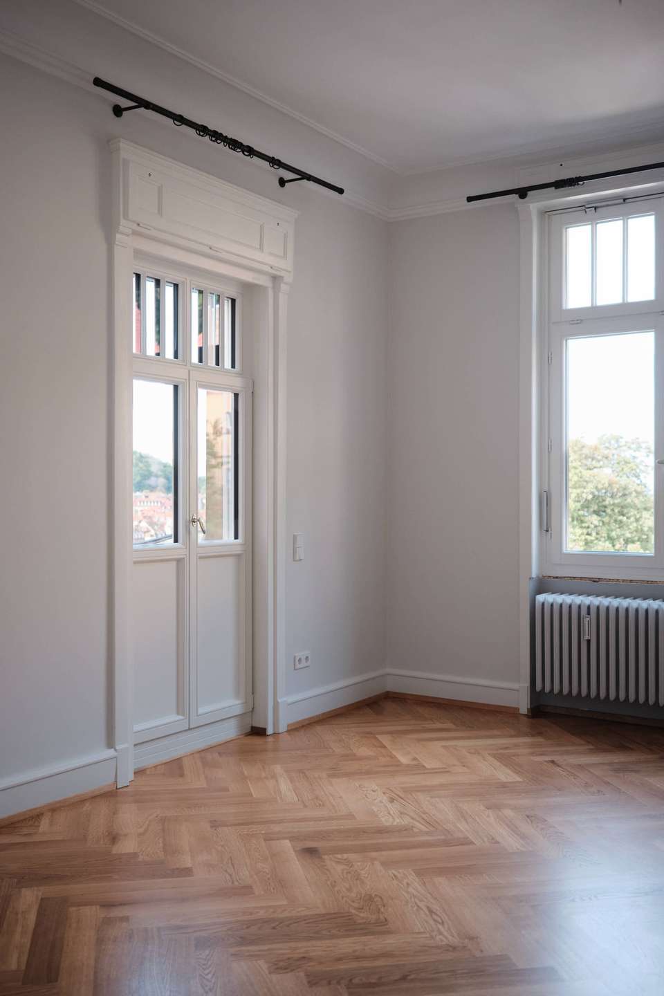 Sämtliche Innentüren der Wohnung wurden sorgfältig aufgearbeitet und erhalten. In allen Wohnräumen – mit Ausnahme von Bad, Gäste-WC und Küche – wurde durchgehend Fischgrätparkett verlegt. Die Fenster sind größtenteils neu, drei historische Kastenfenster wurden mit innenliegendem Mini-Isolierglas und neuer Dichtung erhalten. In allen Räumen wurden elektrische Rollläden eingebaut, im Wohnbereich eine elektrische Markise. Zusätzlich sind stilvolle Vorhangstangen von Interstil sowie maßgefertigte Heizkörperverkleidungen montiert worden.