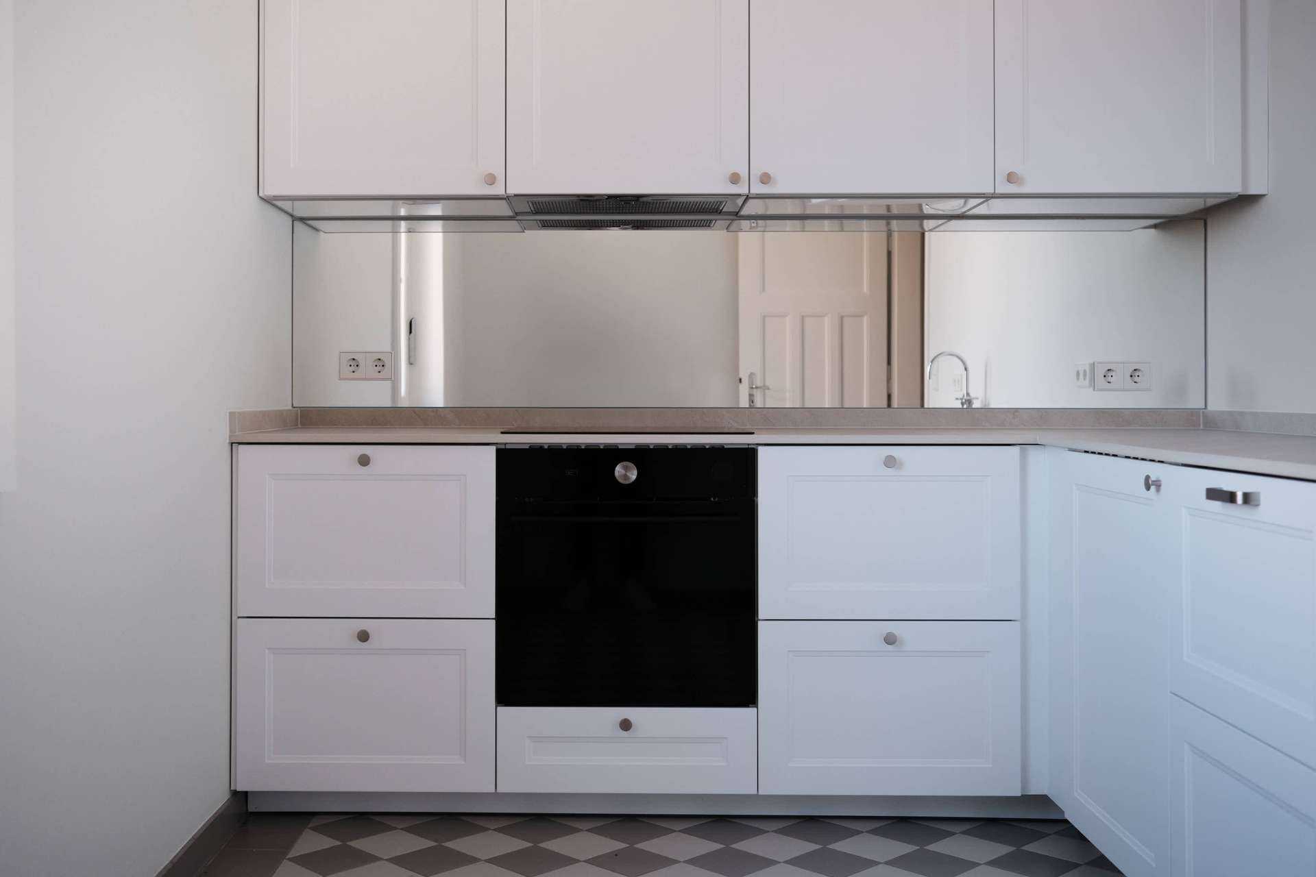 Die Küche wurde mit maßgefertigten IKEA-Möbeln ausgestattet und durch eine Quarzkomposit-Arbeitsplatte der Firma Lulay ergänzt. Auch hier kommt eine Armatur von Dornbracht zum Einsatz. Der Boden ist mit hellen Fliesen belegt, die Gestaltung ist ruhig, funktional und harmonisch auf das Gesamtbild der Wohnung abgestimmt.