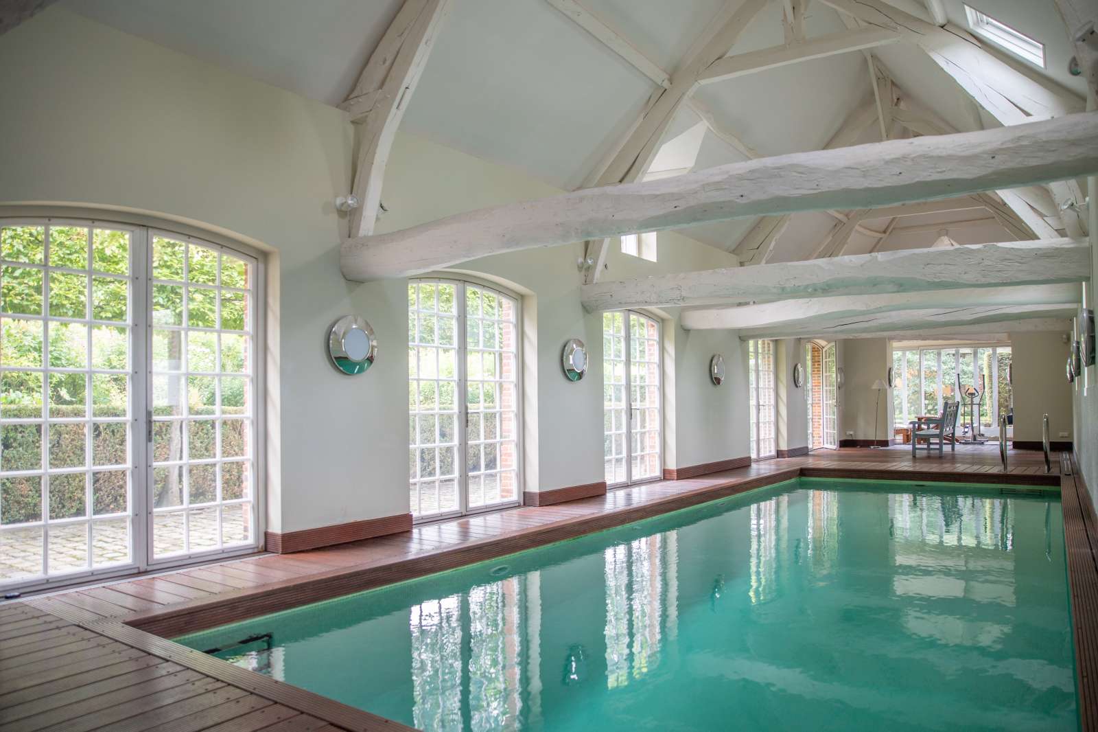 Das Haupthaus bietet auf etwa 350 m² eine eindrucksvolle Raumfolge. Historische Holzvertäfelungen, ein großzügiger Kamin, lichtdurchflutete Wohn- und Essbereiche sowie ein Büro schaffen eine Atmosphäre von zeitloser Noblesse. In den oberen Etagen finden sich ein Hauptschlafzimmer mit Bad en suite, weitere Schlafzimmer mit individuellen Bädern sowie Rückzugsräume im Dachgeschoss. Die Erweiterung mit dem lichtdurchfluteten Innenpool setzt einen modernen Akzent und bietet zugleich Entspannung auf höchstem Niveau.