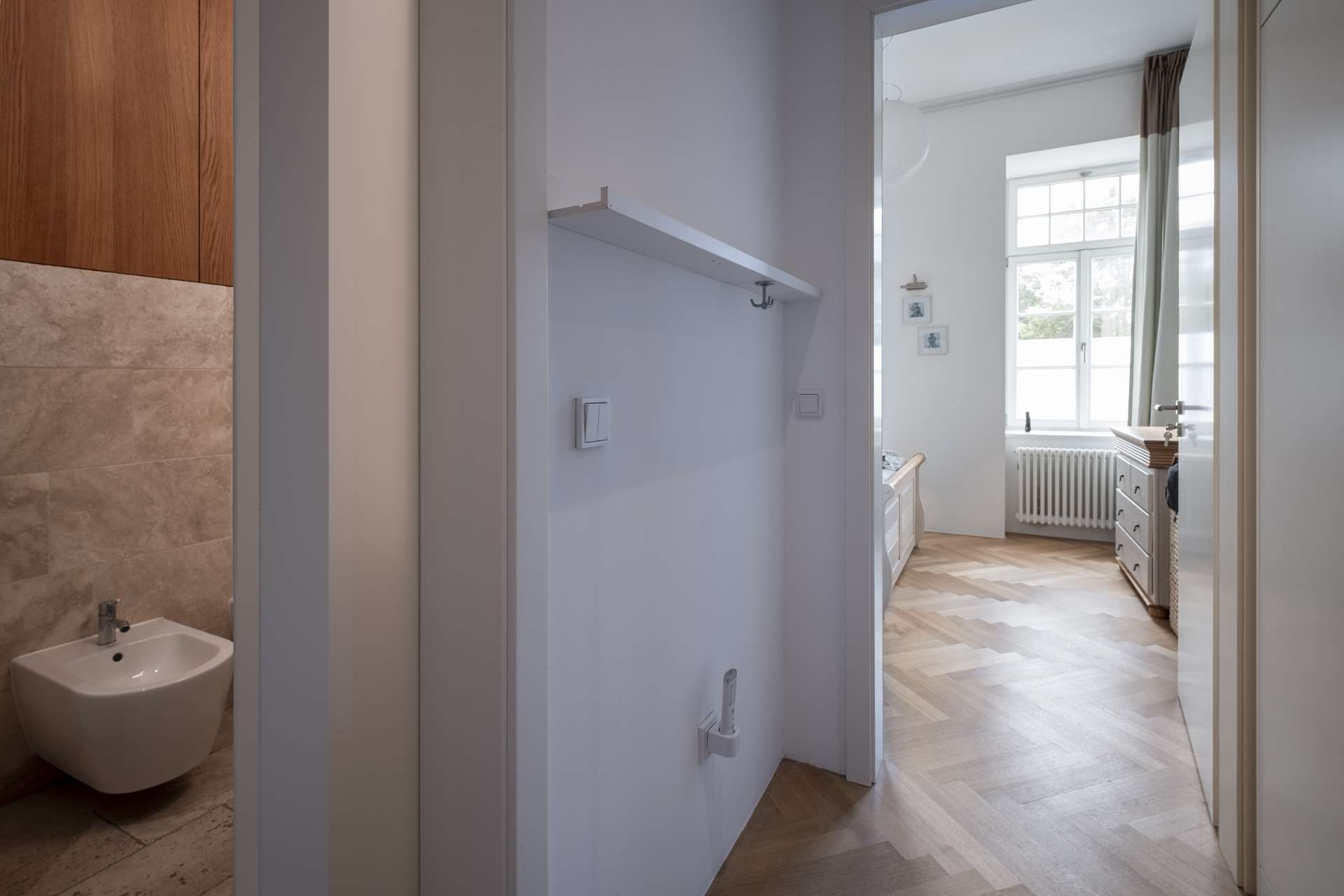 Direkt links zweigt ein abgeschlossener Bereich ab, der ursprünglich eine eigenständige Wohnung bildete. Deshalb verfügt dieser Trakt bis heute über eine zweite Hauseingangstür. Er umfasst zwei Zimmer sowie ein eigenes Badezimmer mit Sandsteinfliesen und Raindance-Dusche – ideal als Kindertrakt, Homeoffice-Bereich oder Gästetrakt mit hoher Privatsphäre.