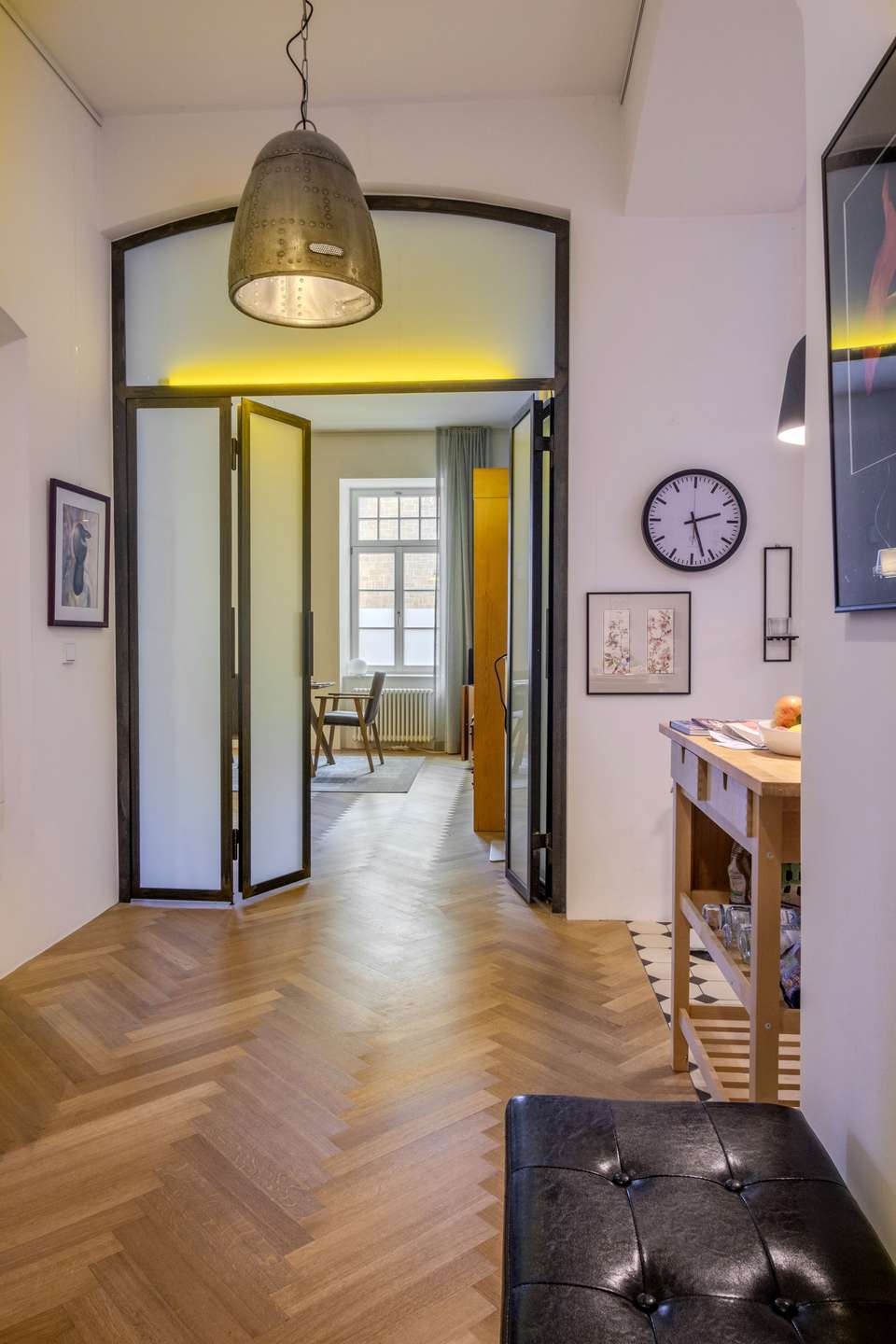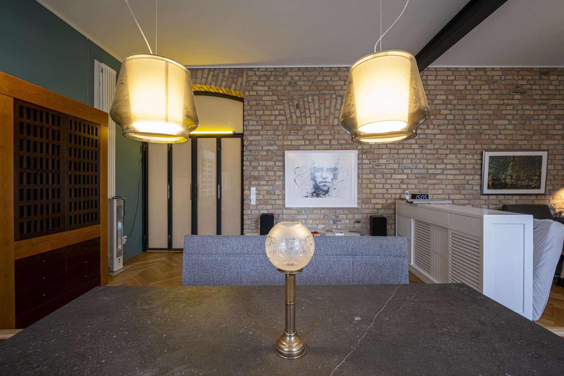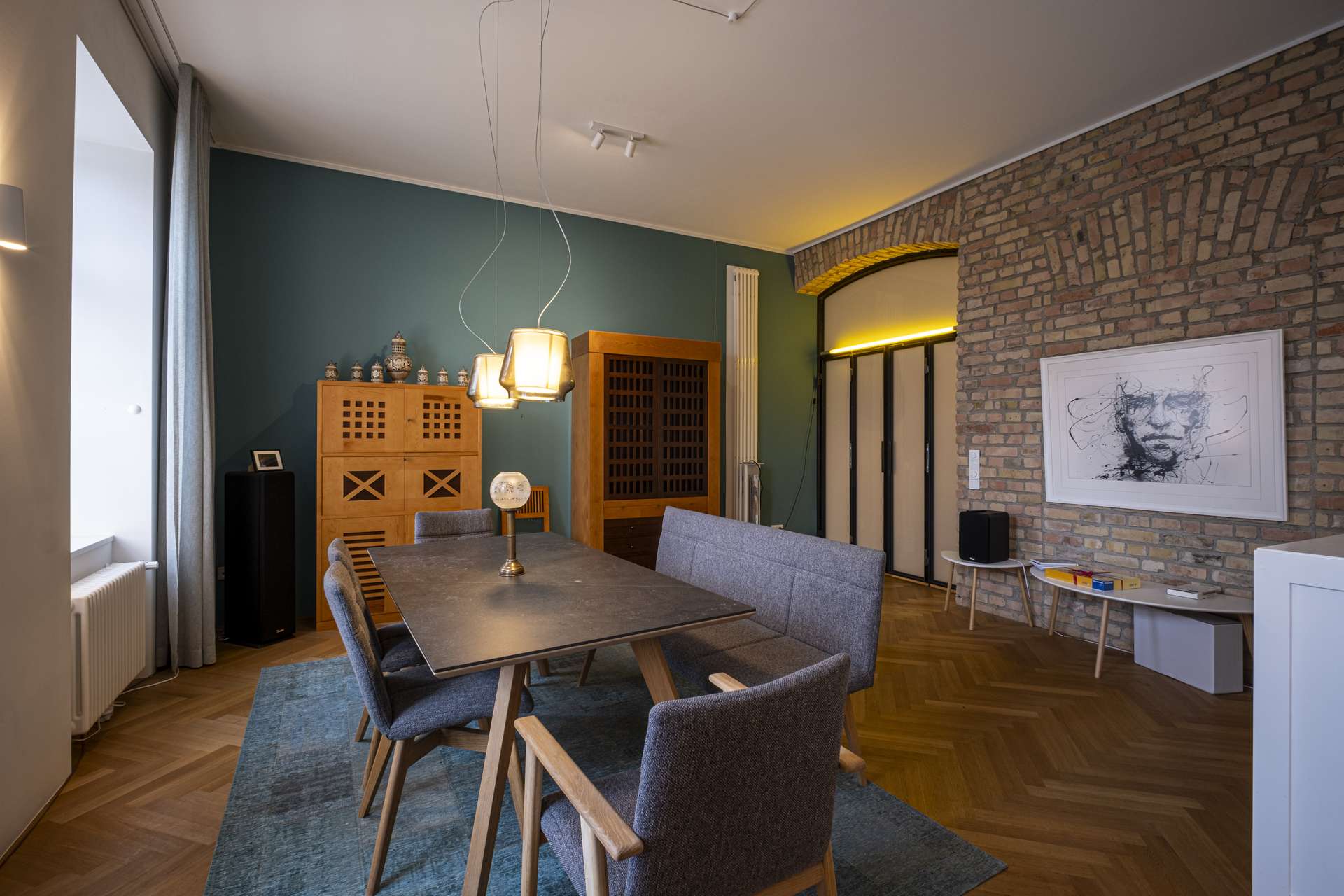 Am Ende des Flurs markiert eine schwarze Sprossen-Flügeltür aus Glas den Übergang in den großzügigen Wohnbereich. Ein zentrales Gestaltungselement ist hier die lange, durchgängige Backsteinwand gegenüber der Fensterfront – ein prägnantes architektonisches Detail, das dem Raum eine besondere, fast loftartige Atmosphäre verleiht. Vom Wohnbereich aus ist auch das ruhig gelegene Schlafzimmer zugänglich, das sich organisch an den privaten Rückzugsbereich anschließt.