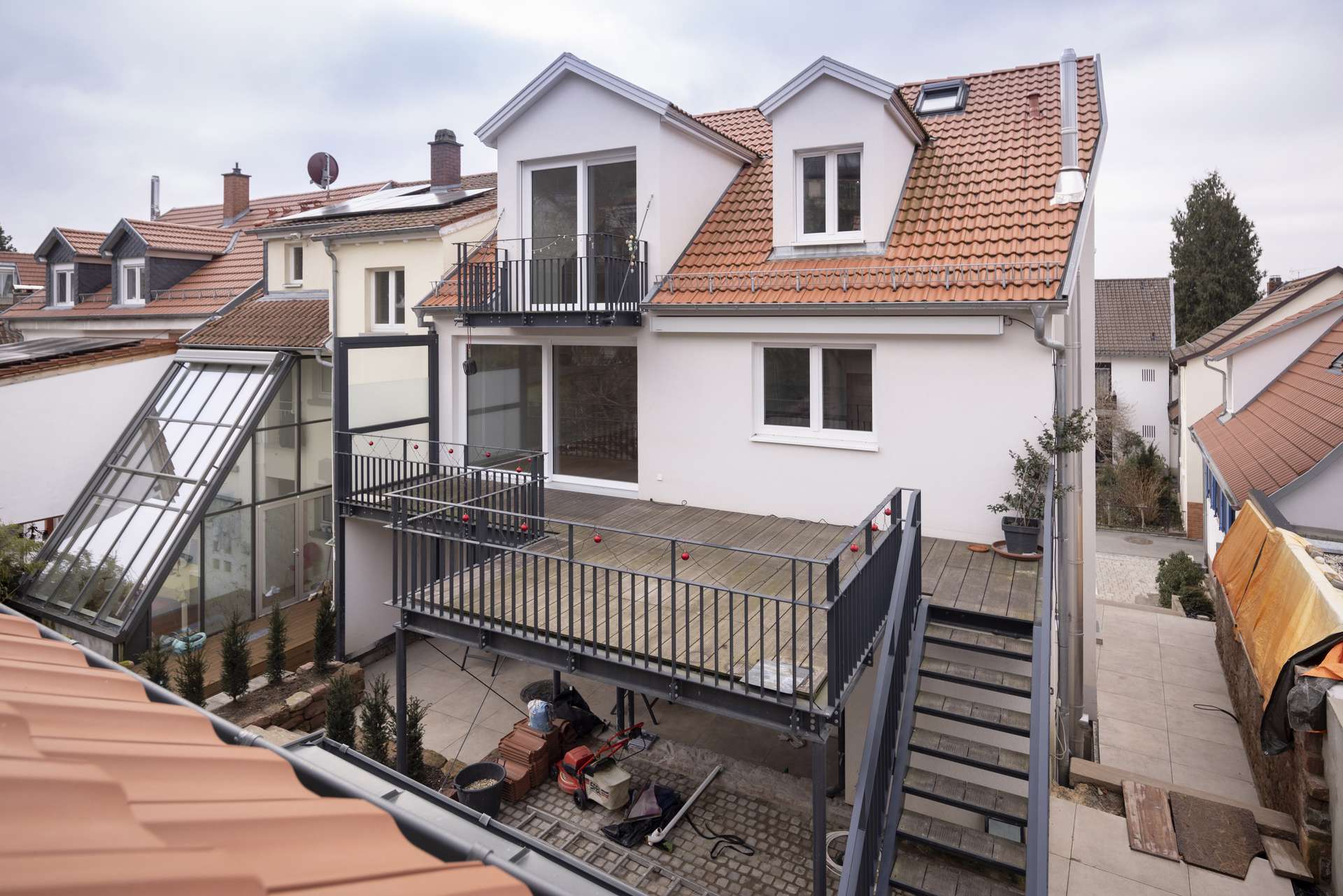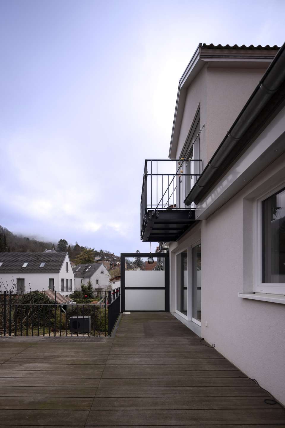 -Terrasse mit Bankirai-Holz, Markise, Morgensonne