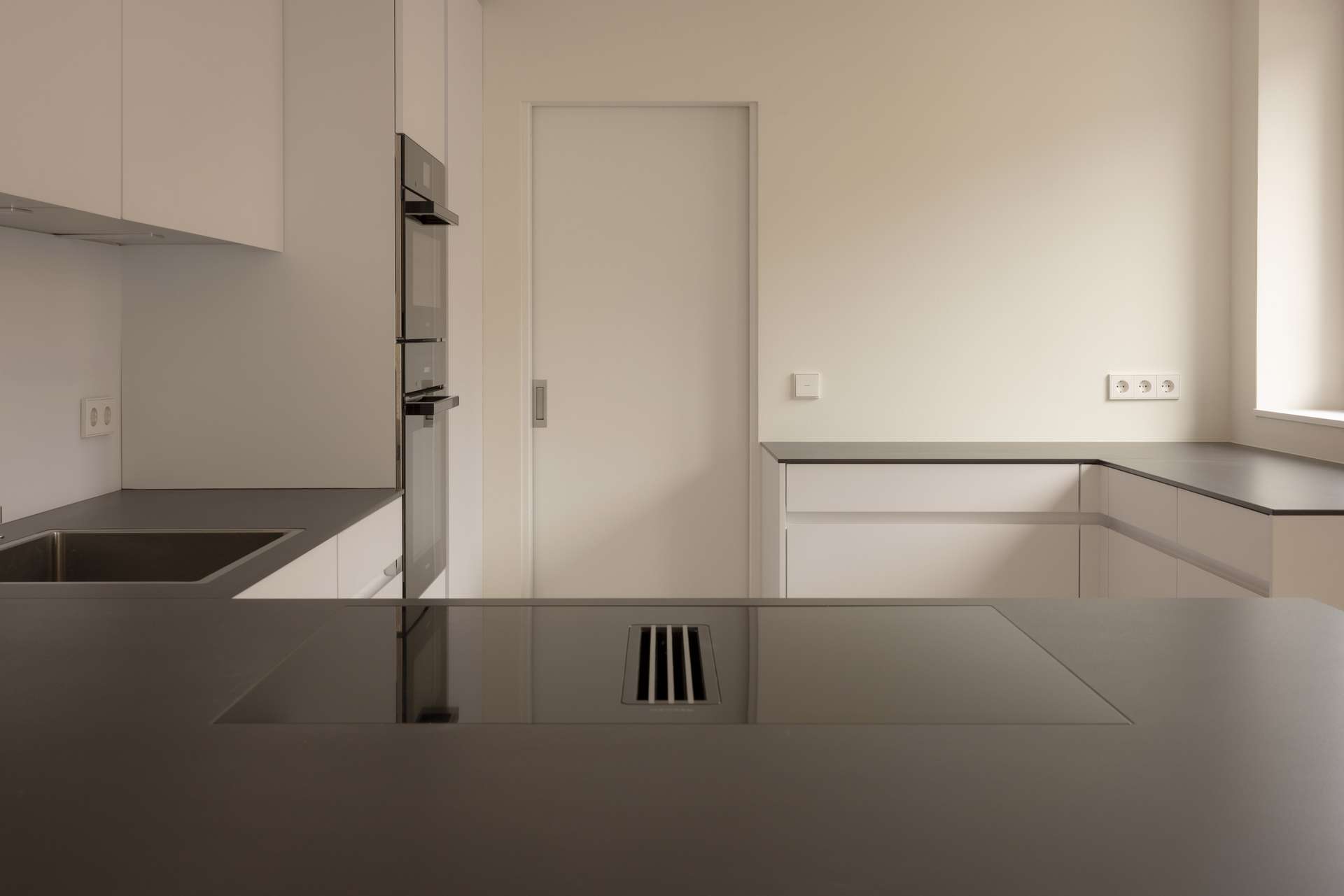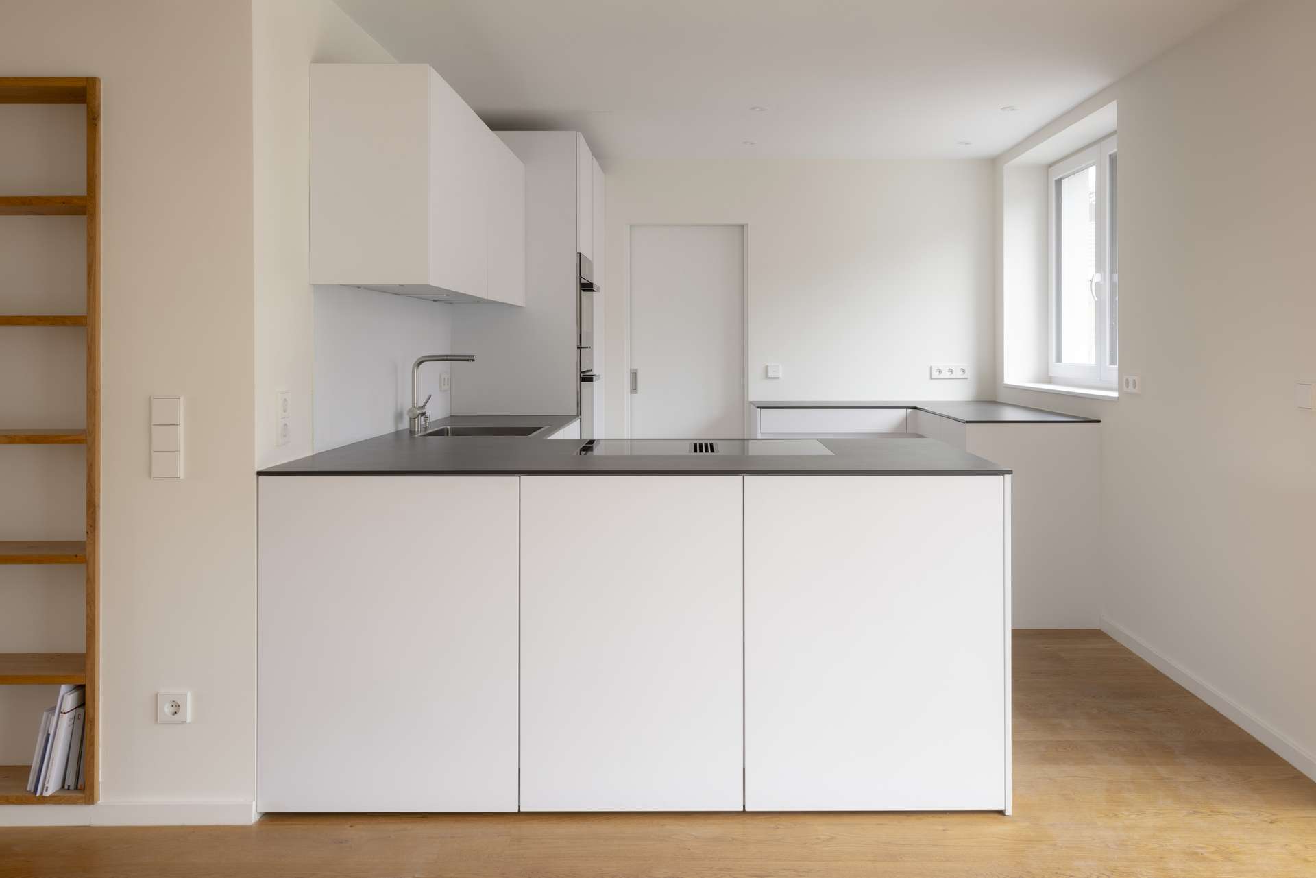 -Küche von Leicht, weiße Küchenzeile, schwarzer Küchenblock, Miele-Geräte inklusive Dampfgarer (Spülmaschine neu, Küche gehört nicht zur Wohnung)