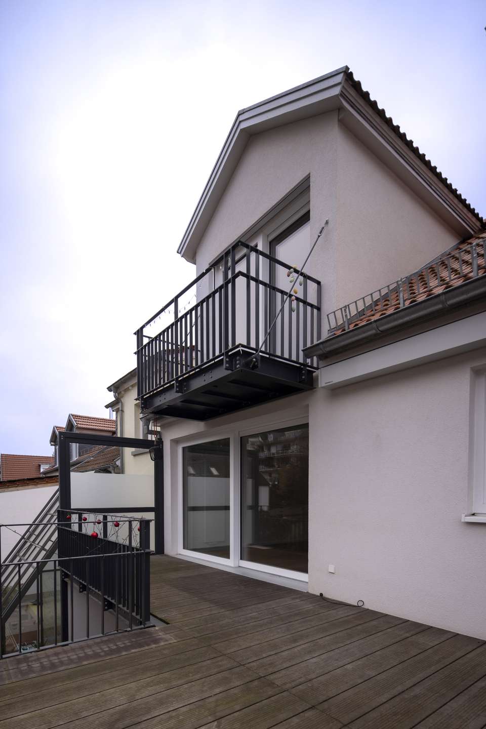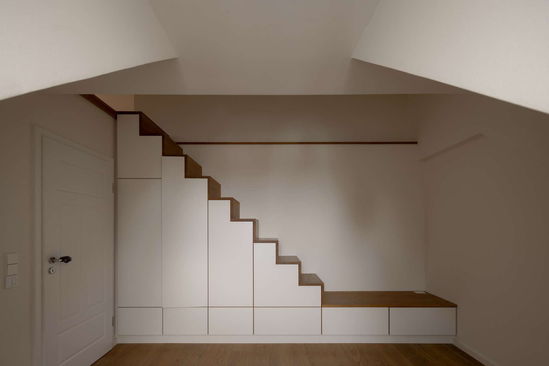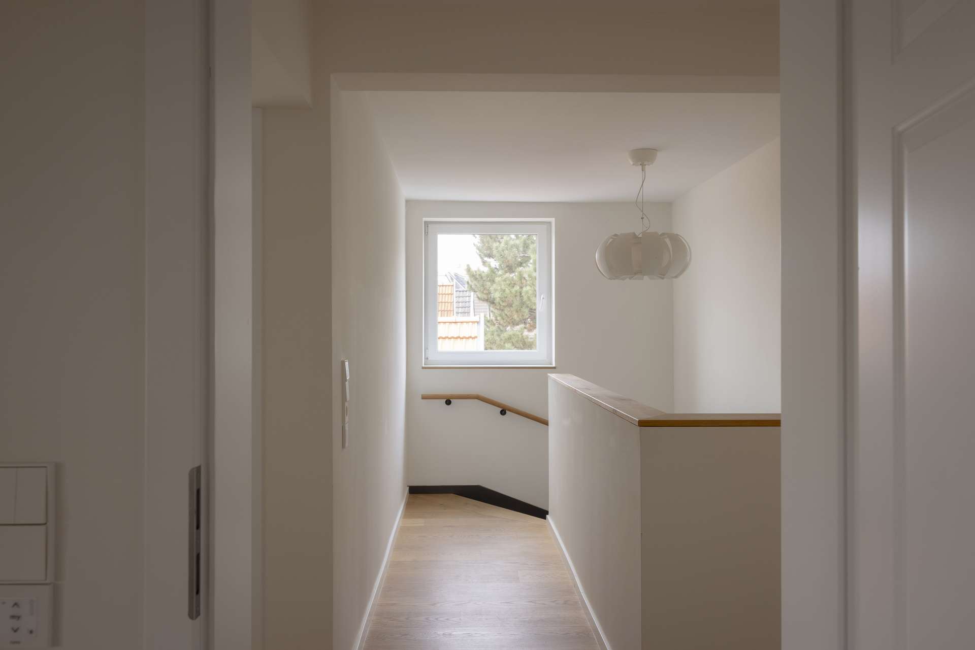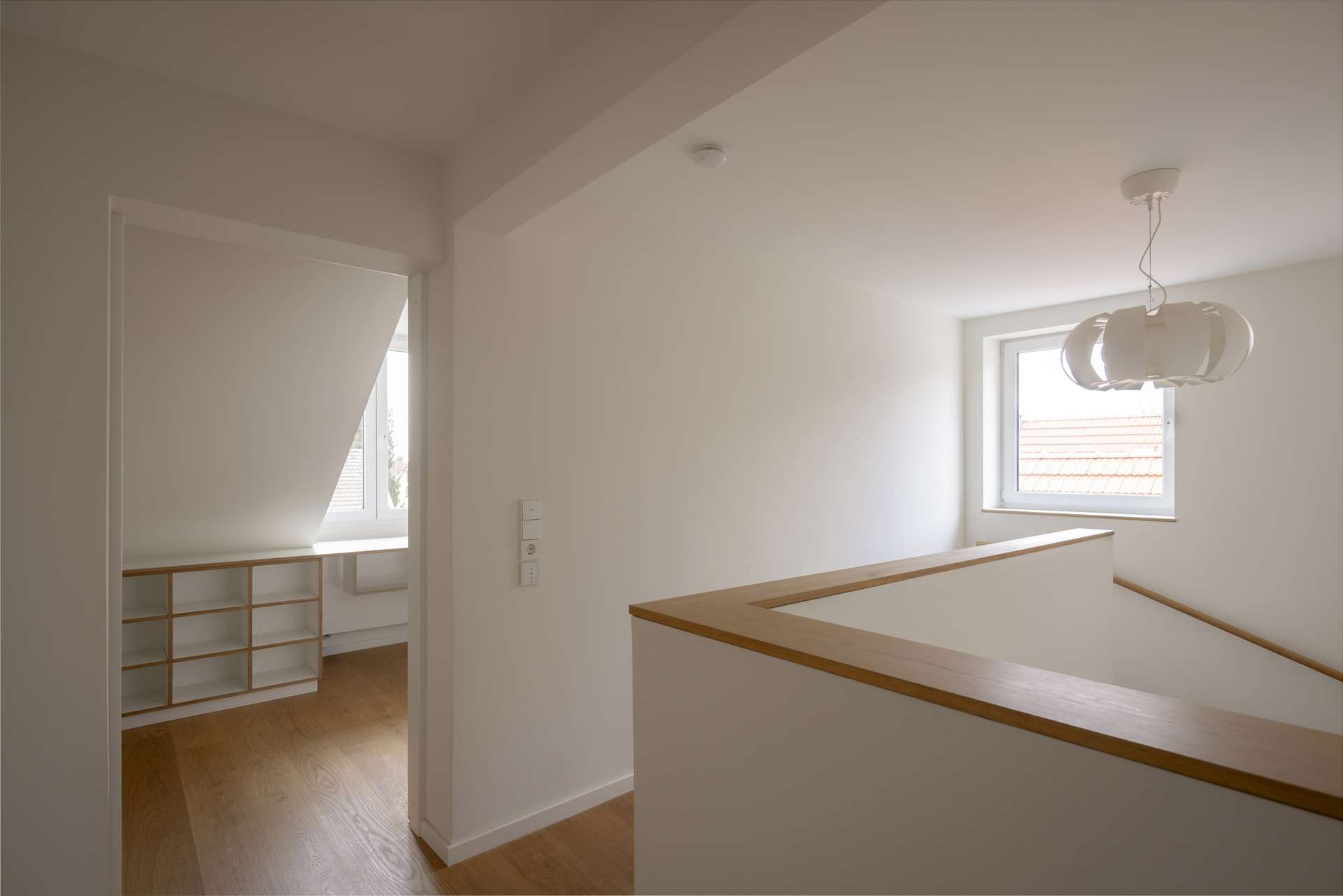 In der zweiten Wohnebene erschließt eine zentrale Fläche zwei weitere Schlafzimmer sowie ein kleines Arbeitszimmer. Das Arbeitszimmer ist mit Einbauschrank und Schreibtisch ausgestattet. Das zweite Schlafzimmer verfügt über eine Gaube und eine kleine Treppe zu einem gemütlichen Dachzimmer. Das dritte Schlafzimmer hat einen eigenen Balkon sowie Einbauschränke und Schubladen. Gegenüber liegt das Tageslichtbad mit Badewanne, Dusche, Doppelwaschbecken und Einbauschrank.