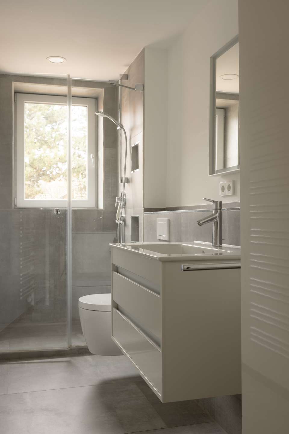 -2 Bäder: Gäste-Bad mit Dusche und Tageslicht, Hauptbad mit Wanne, Dusche, Doppelwaschbecken von Duravit und Einbauschrank