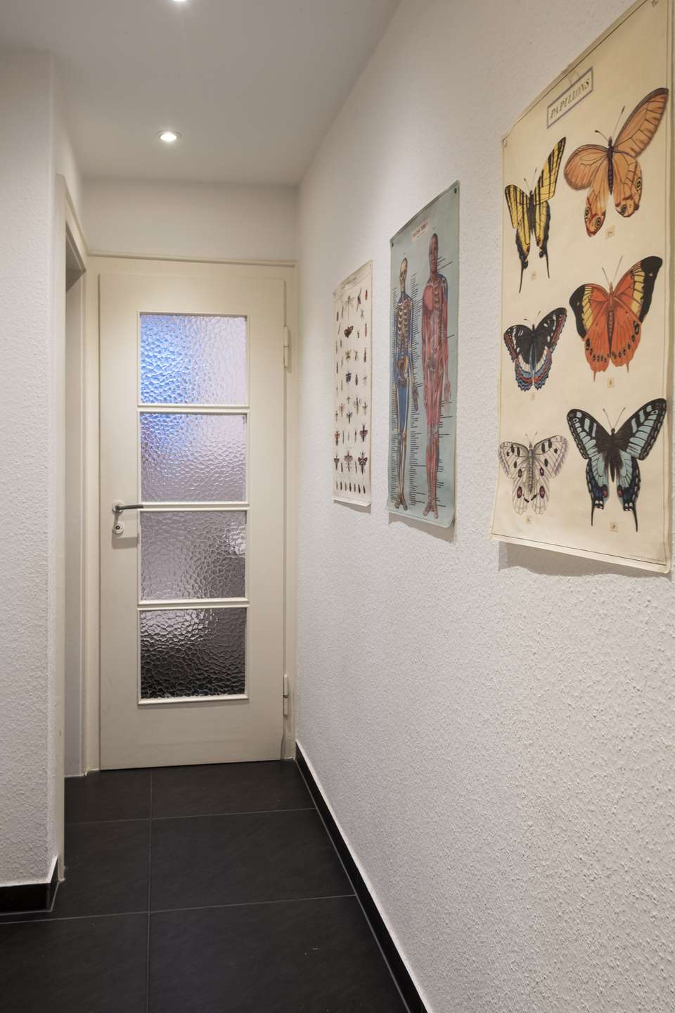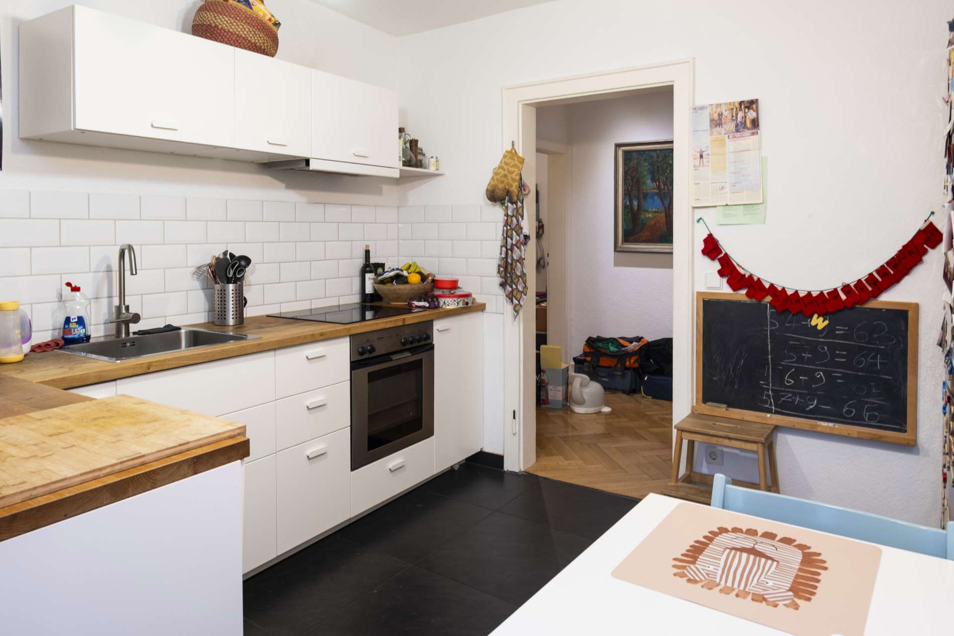 - Schwarze Fliesen in Flur und Bädern