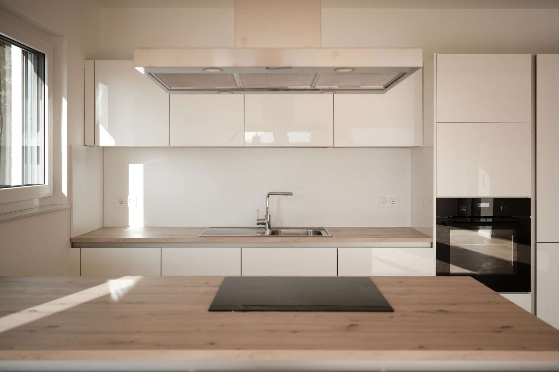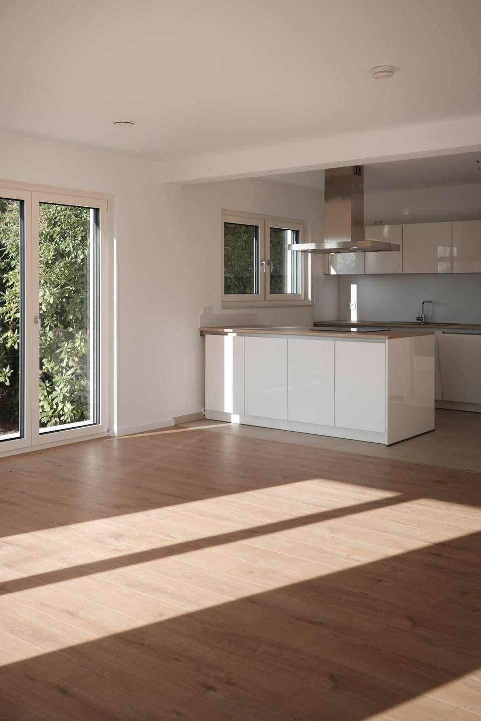 Beim Betreten des Hauses befindet man sich in einem geräumigen Flur. Rechts befindet sich der Technikraum, links das Gäste-Badezimmer mit Fenster und hellen Steinfliesen. Geradeaus führt der Flur direkt in den Wohn- und Essbereich. Die eingebaute, moderne Küche mit Küchenblock u...