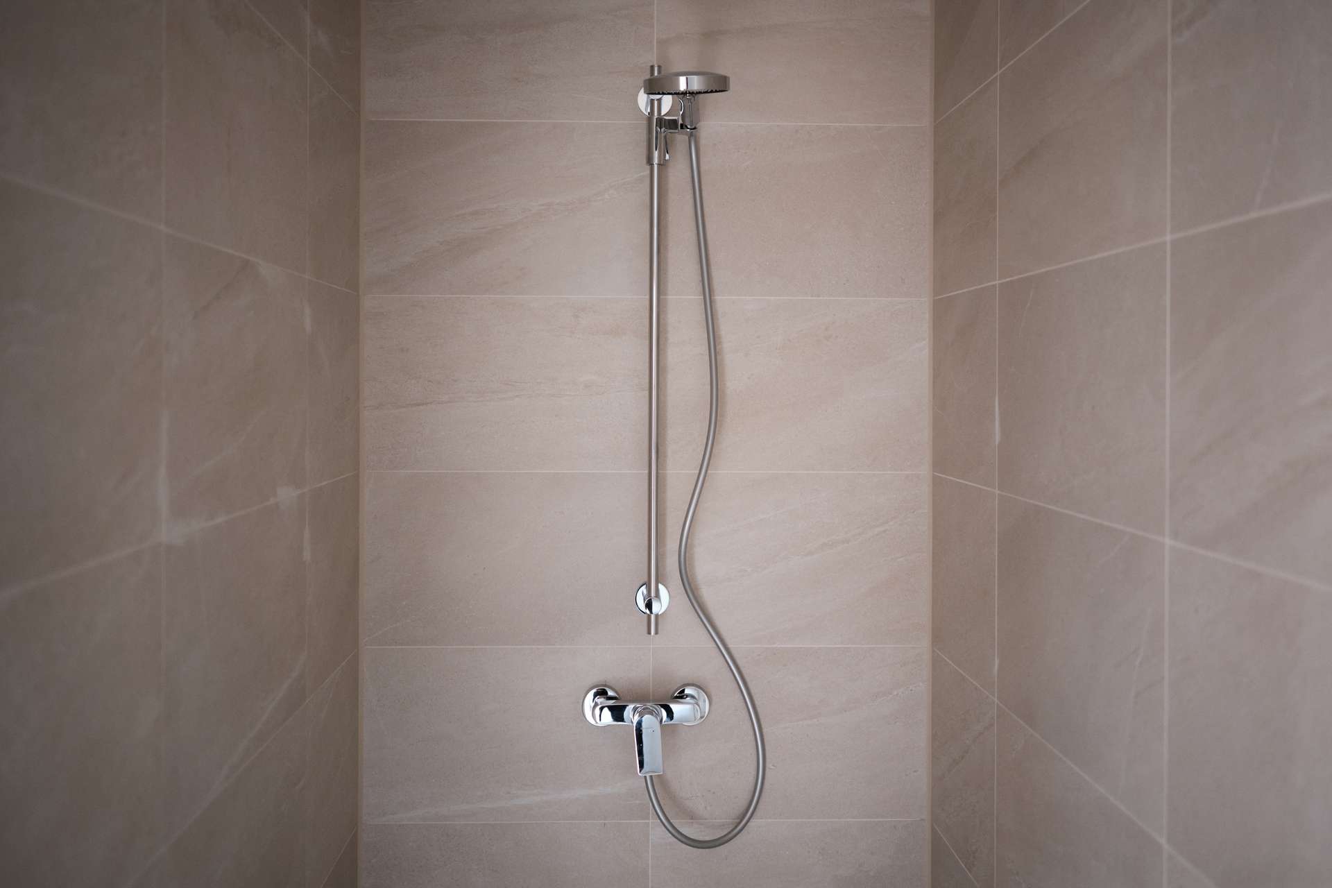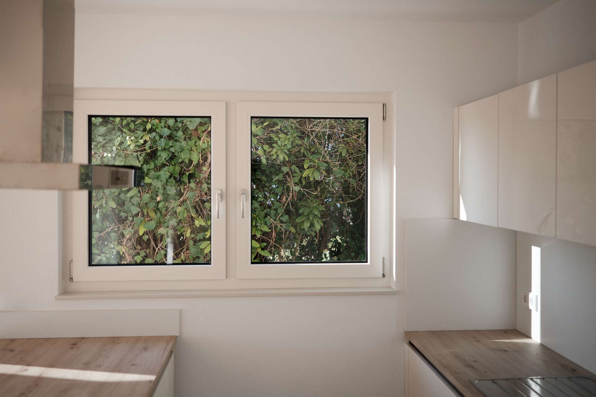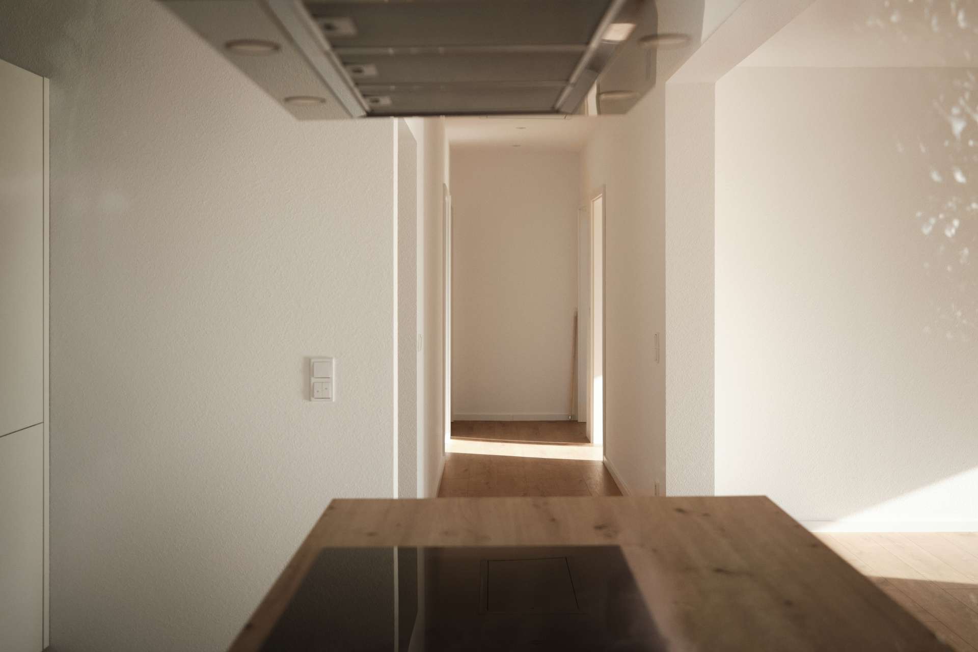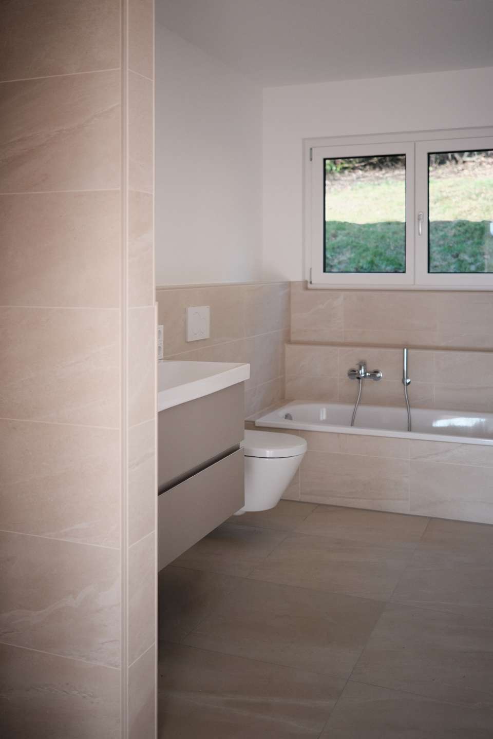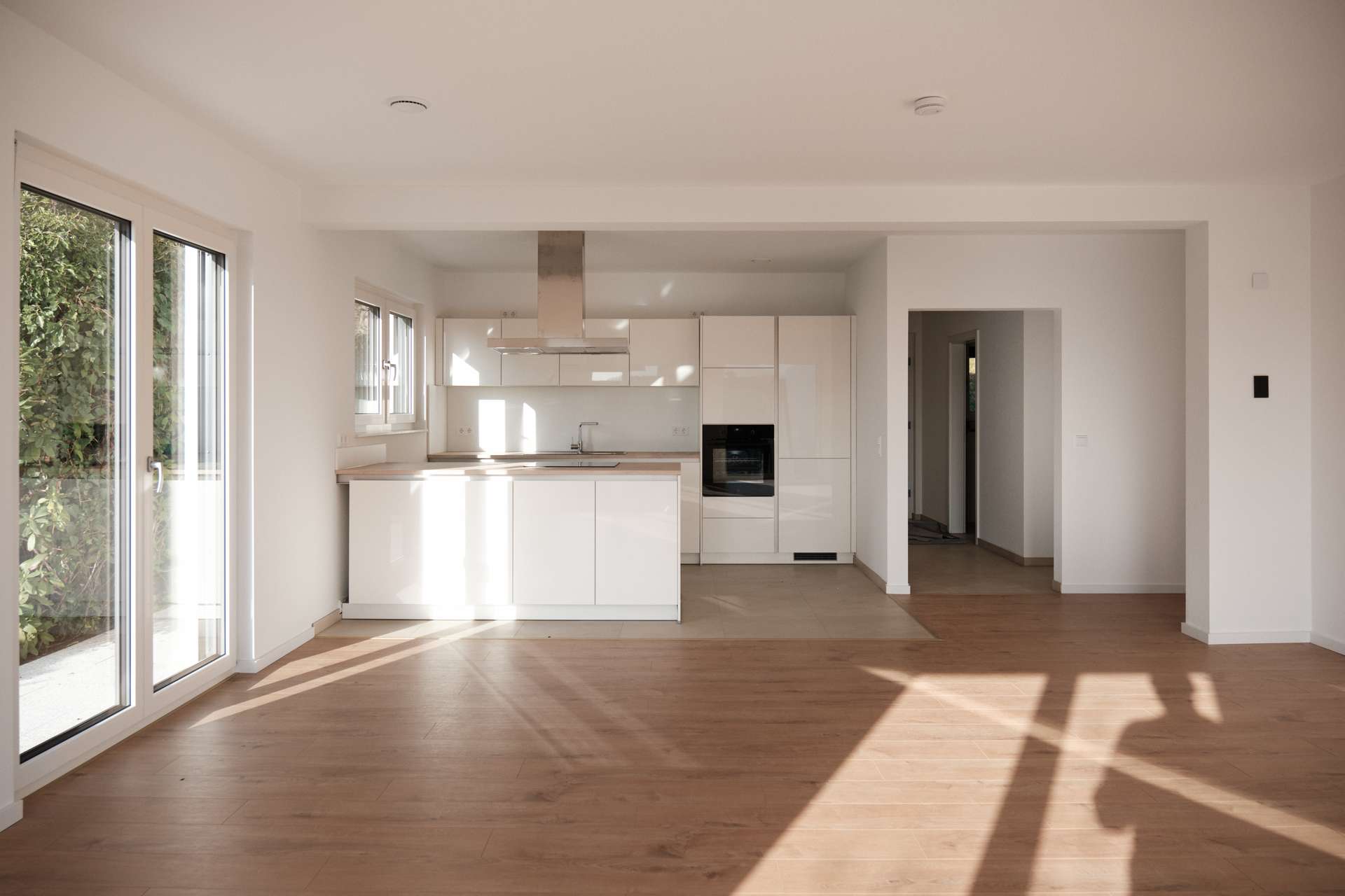 Beim Betreten des Hauses befindet man sich in einem geräumigen Flur. Rechts befindet sich der Technikraum, links das Gäste-Badezimmer mit Fenster und hellen Steinfliesen. Geradeaus führt der Flur direkt in den Wohn- und Essbereich. Die eingebaute, moderne Küche mit Küchenblock und Küchenzeile befindet sich rechts vom Wohnbereich. Vom Wohn- und Essbereich eröffnet sich der Zugang zur großzügigen, überdachten Terrasse, die den freien Blick auf das Neckartal freigibt.