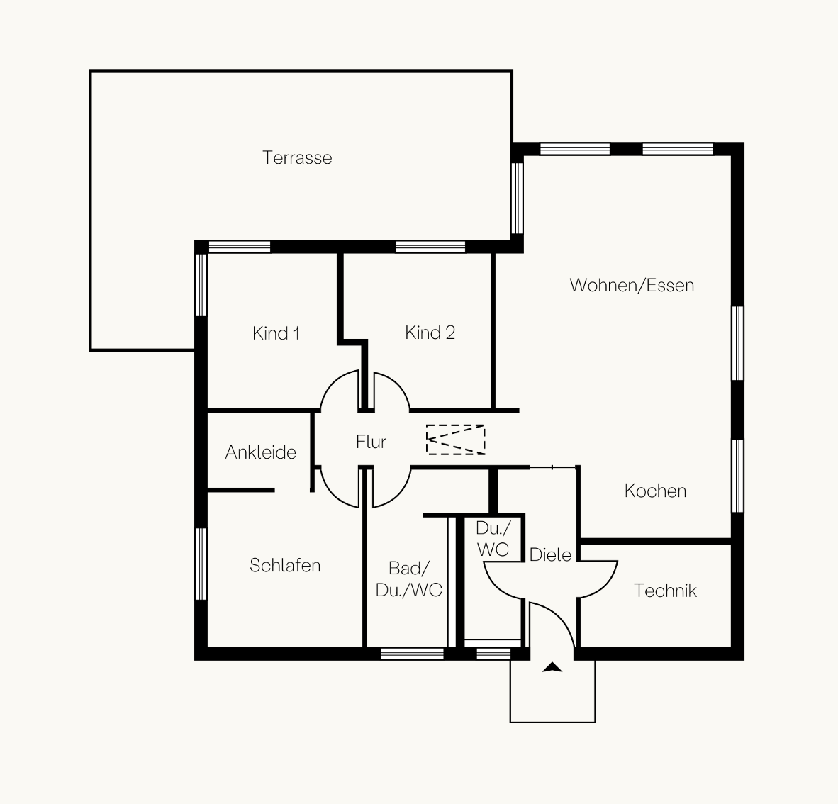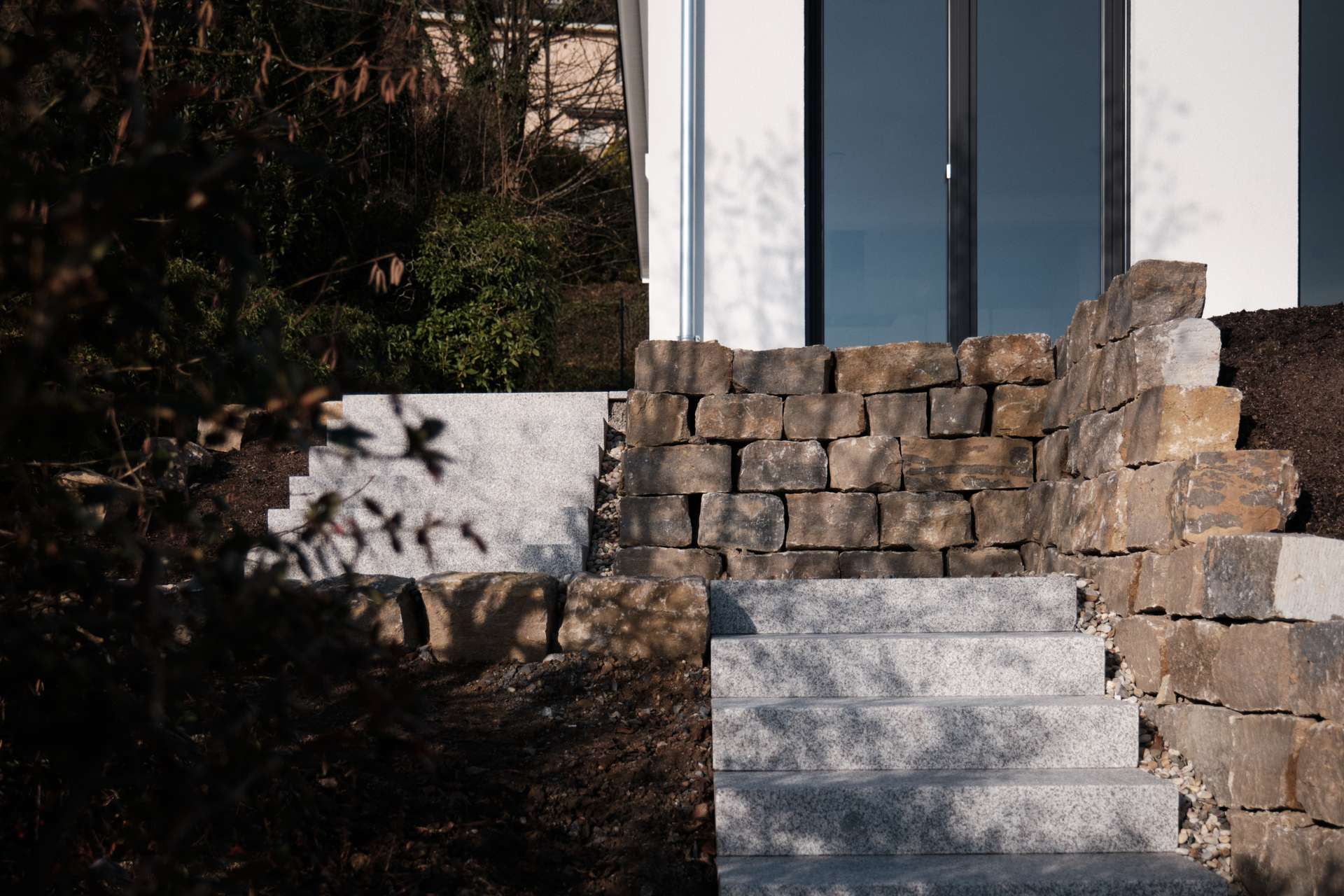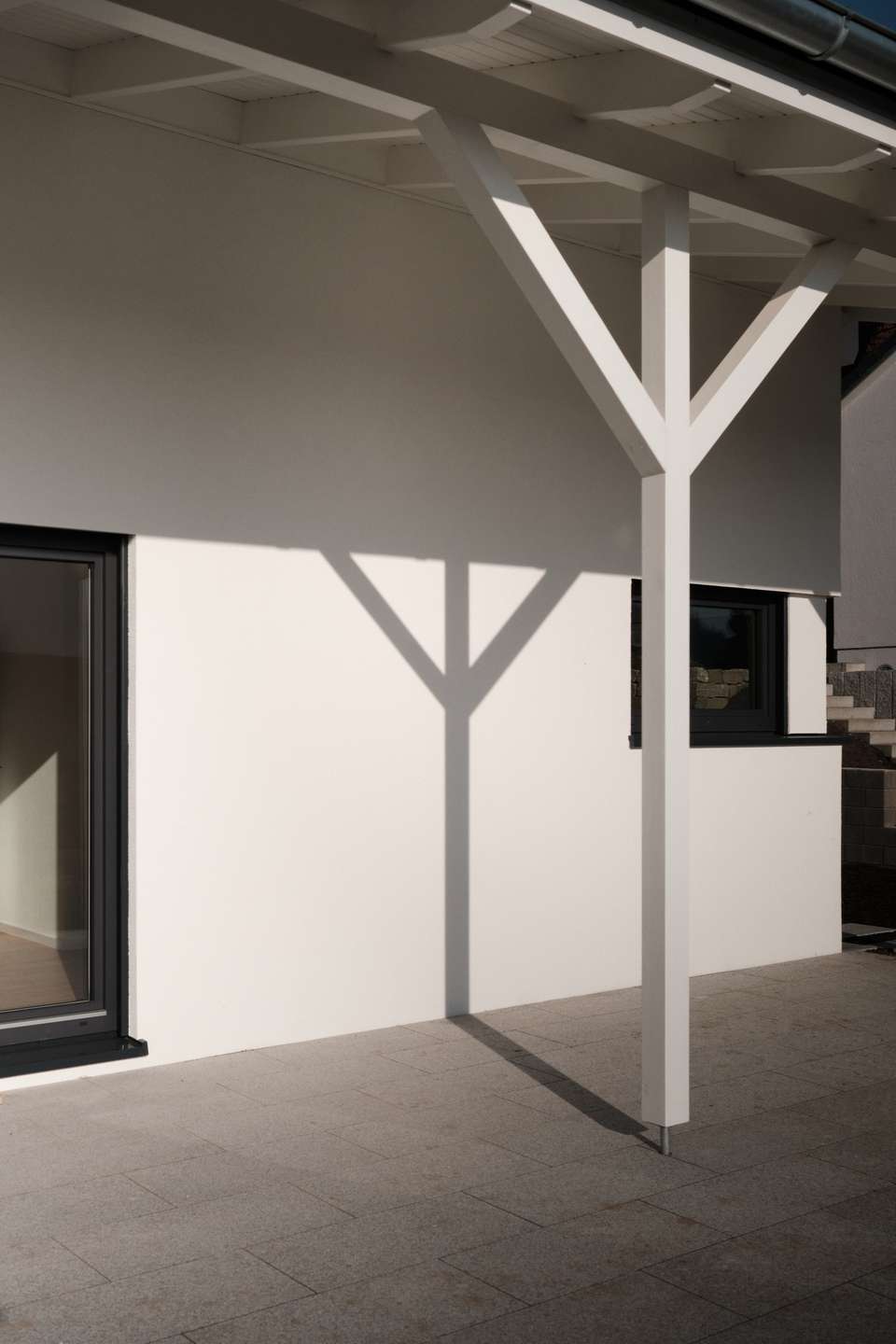 Zum Hauseingang gelangt man über einige Steinstufen, die in den Hang integriert sind. Unterhalb des Hauses befindet sich die Doppelgarage. Die Bauweise in leichter Hanglage und die clevere Raumaufteilung sorgen dafür, dass die Wohnfläche von ca. 125 m² optimal genutzt wird.