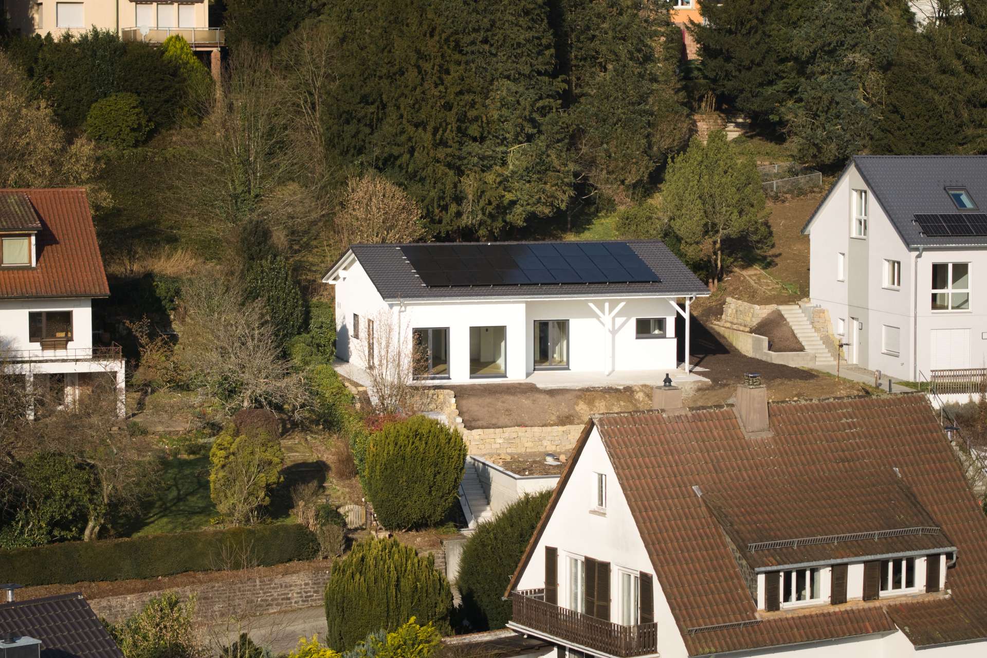 Auf einem großen Grundstück in besonders schöner, sonniger Hanglage über dem Neckartal wurde dieses Einfamilienhaus mit drei Schlafzimmern auf einer Ebene errichtet. Das rund 830 m² große Grundstück bietet einen unverbaubaren Blick ins Grüne und garantiert Ruhe und Privatsphäre. Die westliche Ausrichtung des Hauses sorgt für maximale Lichtdurchflutung und eröffnet eine traumhafte Aussicht auf das Neckartal und die umliegende Hügellandschaft.