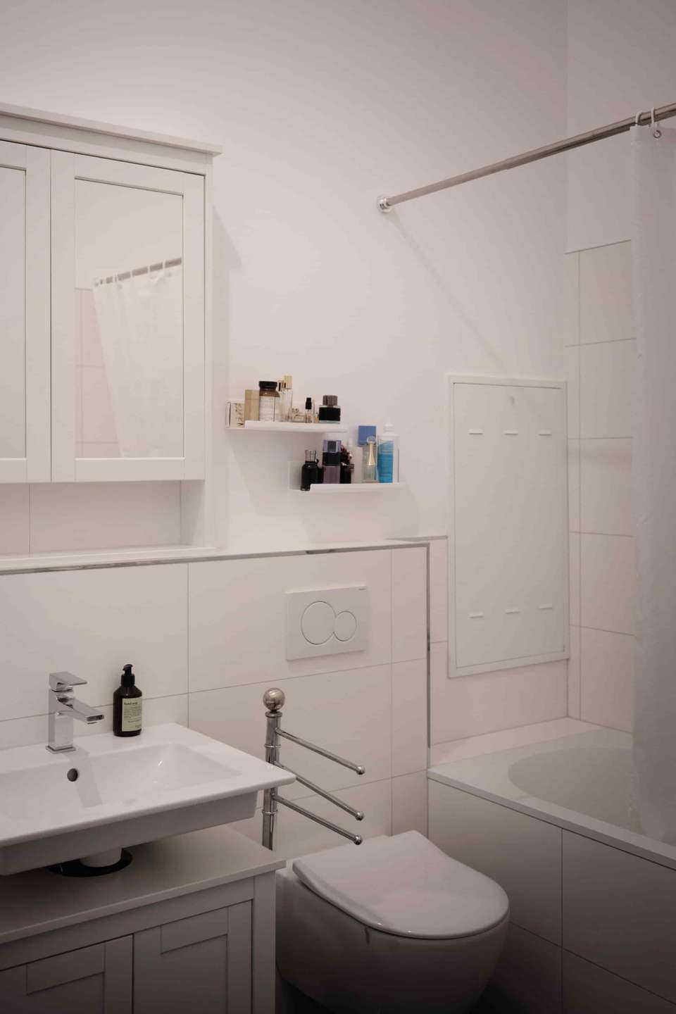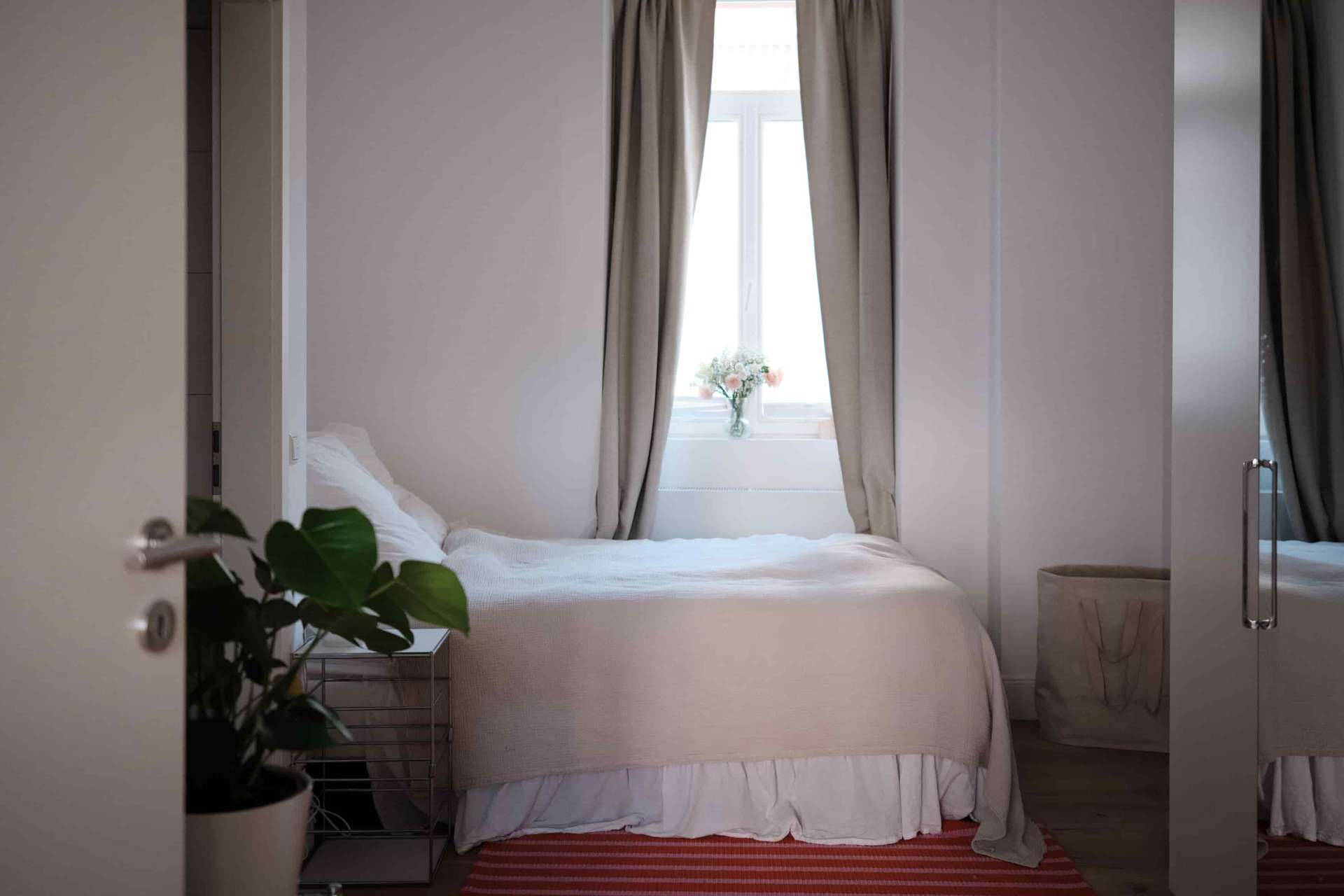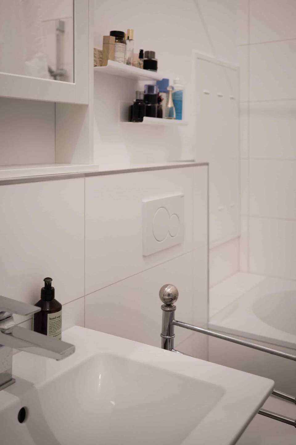 Das Schlafzimmer grenzt offen an den Wohn Essbereich an und ist über einen eleganten Durchbruch erreichbar. Ein Fenster zum ruhigen Hinterhof sorgt hier für eine angenehme Rückzugsmöglichkeit. Links vom Schlafzimmer befindet sich das innenliegende Badezimmer, ausgestattet mit einer Badewanne, die auch als Dusche genutzt werden kann. Anthrazitfarbene Bodenfliesen und weiße Wandfliesen schaffen ein zeitloses und modernes Ambiente. Waschmaschine und Trockner sind ebenfalls im Badezimmer untergebracht.