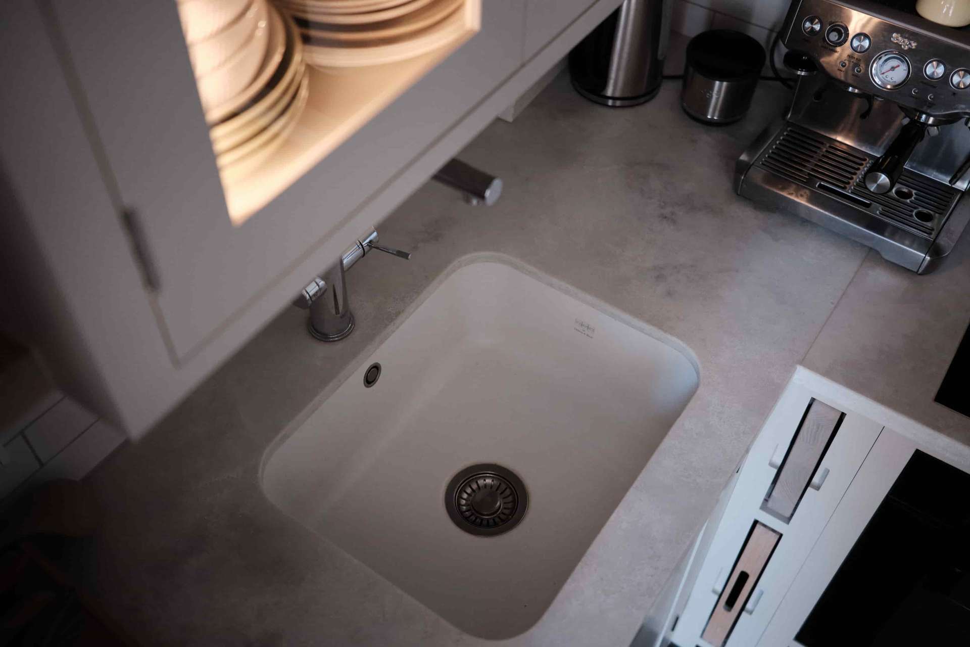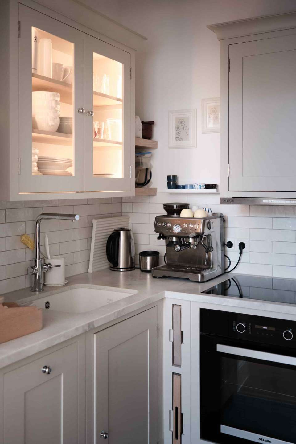 Ein besonderes Highlight ist die hochwertige Neptune Einbauküche im Wert von ca. 40.000 Euro. Die stilvolle Küche ist harmonisch in eine eigene Nische des Wohnbereichs integriert und überzeugt mit beige-farbenen Fronten, einer edlen Steinplatte sowie ausschließlich hochwertigen Miele Elektrogeräten. Zur Ausstattung gehören ein Induktionskochfeld, eine Dunstabzugshaube sowie ein Wasserhahn mit integriertem Filtersystem für gefiltertes Trinkwasser.