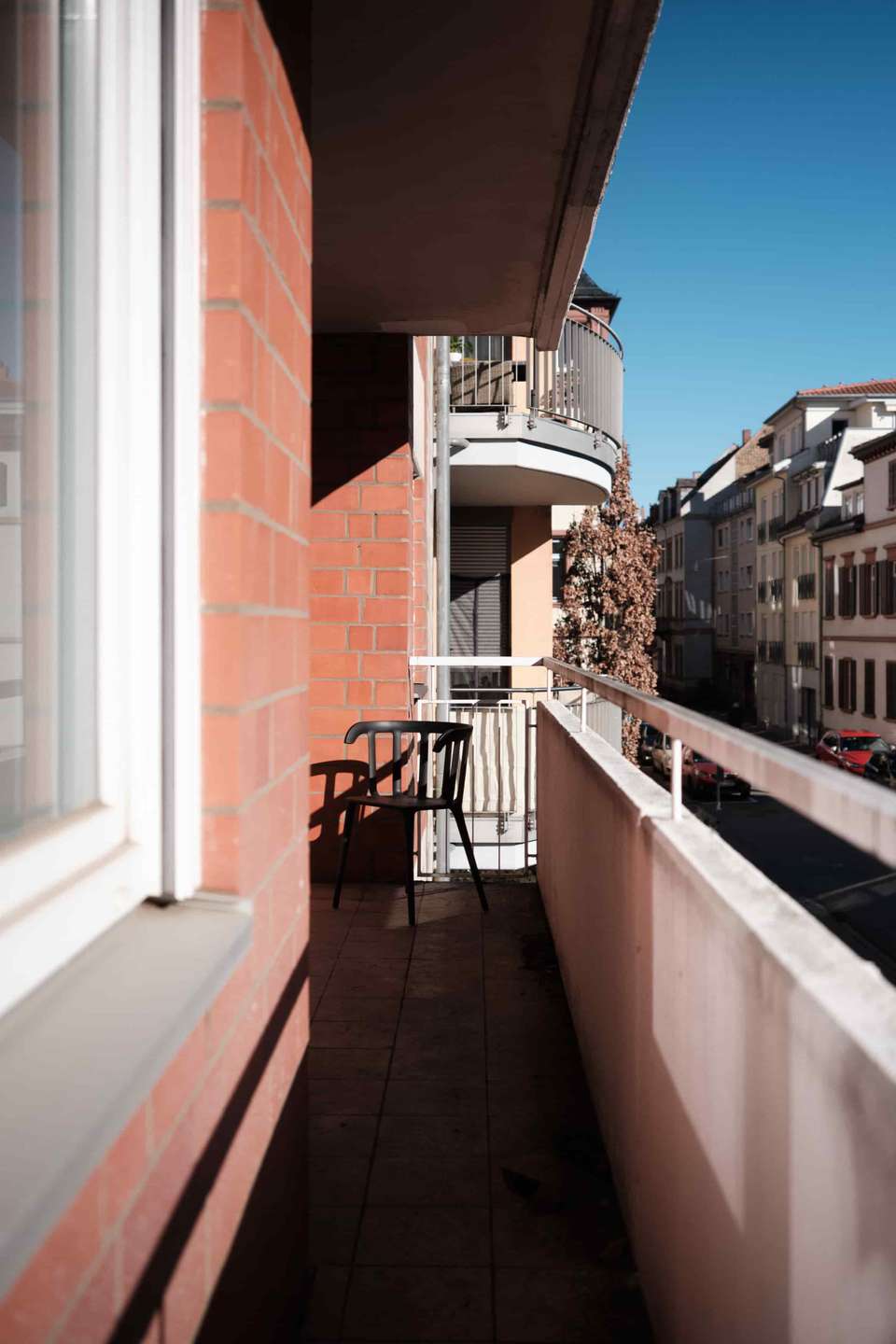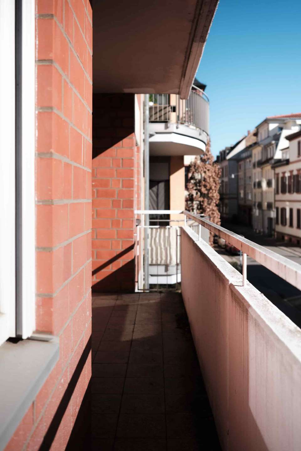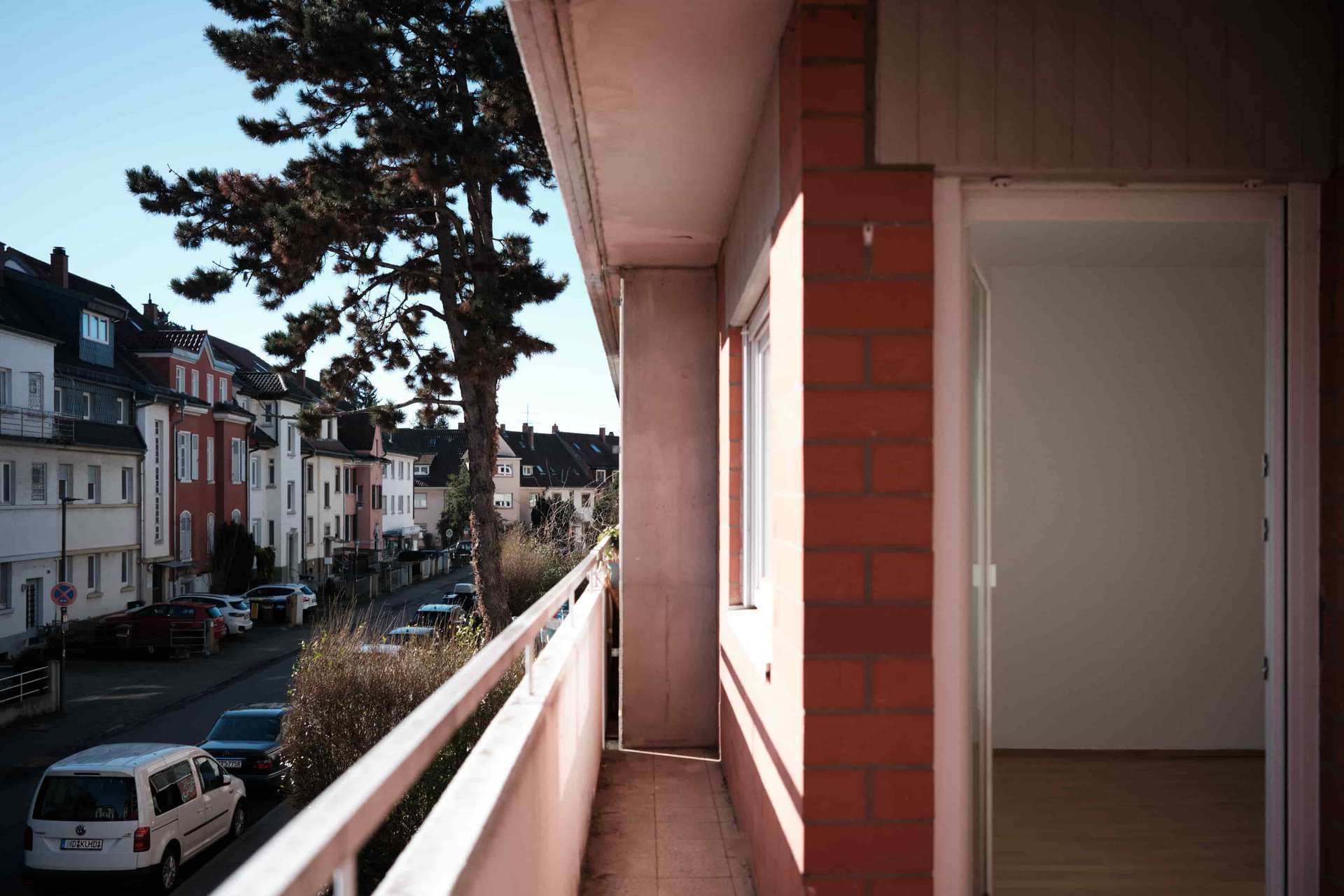 Das Gebäude stammt aus einer Zeit, in der Architektur noch selbstbewusst mit Materialität und klaren Formen gearbeitet hat. Die Klinkerfassade wird durch markante Betonelemente ergänzt und verleiht dem Haus einen eigenständigen Charakter mit einem gewissen Brutalismus-Charme. Die solide Bauweise und die klaren Strukturen prägen auch das Innere des Hauses. Die Wohnung selbst befindet sich im ersten Obergeschoss.