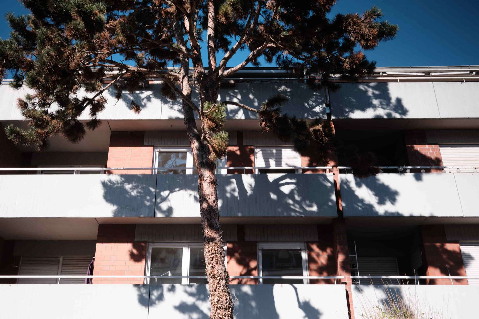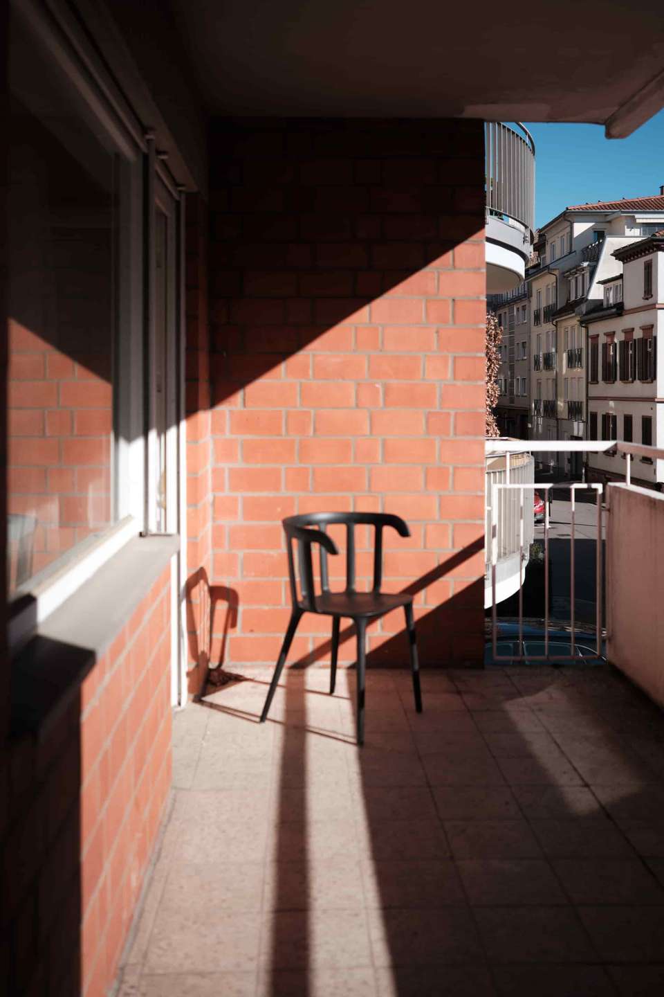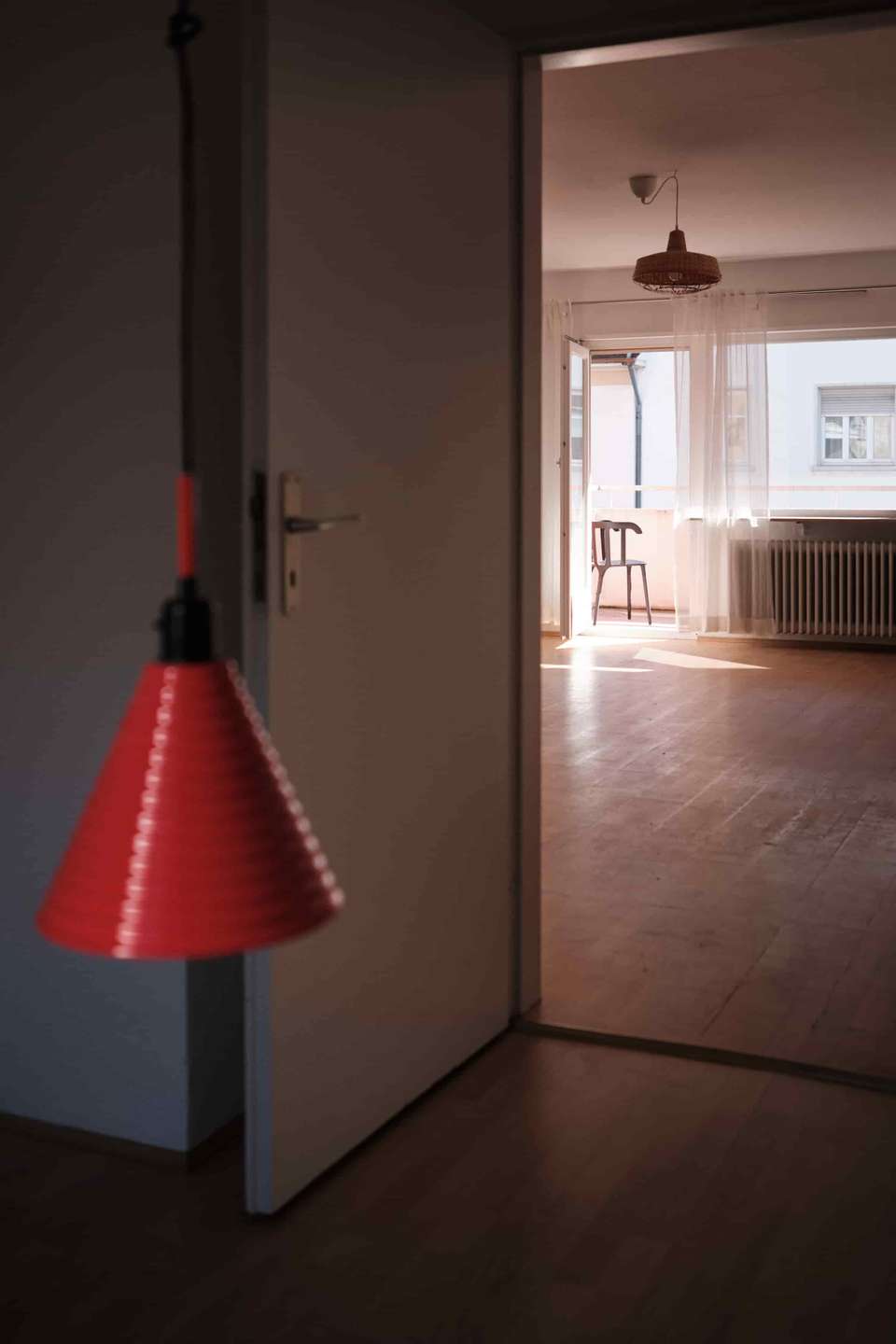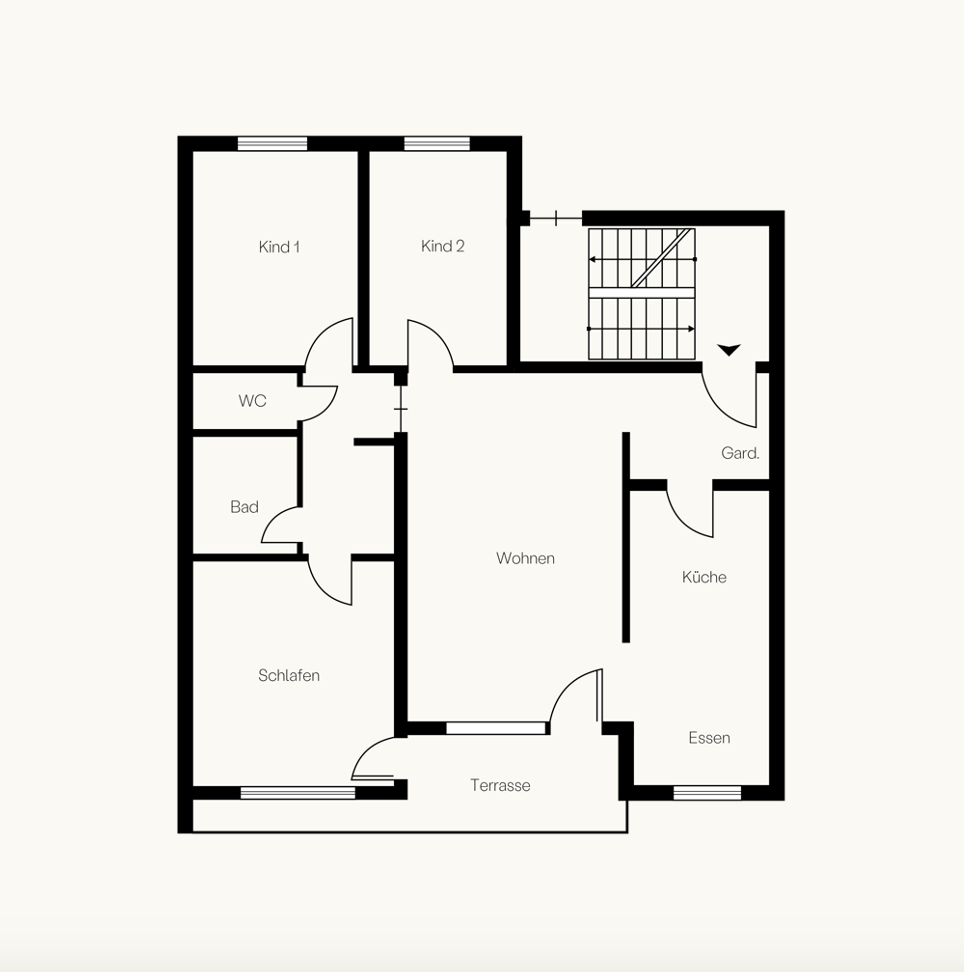 Das Gebäude stammt aus einer Zeit, in der Architektur noch selbstbewusst mit Materialität und klaren Formen gearbeitet hat. Die Klinkerfassade wird durch markante Betonelemente ergänzt und verleiht dem Haus einen eigenständigen Charakter mit einem gewissen Brutalismus-Charme. Die solide Bauweise und die klaren Strukturen prägen auch das Innere des Hauses. Die Wohnung selbst befindet sich im ersten Obergeschoss.