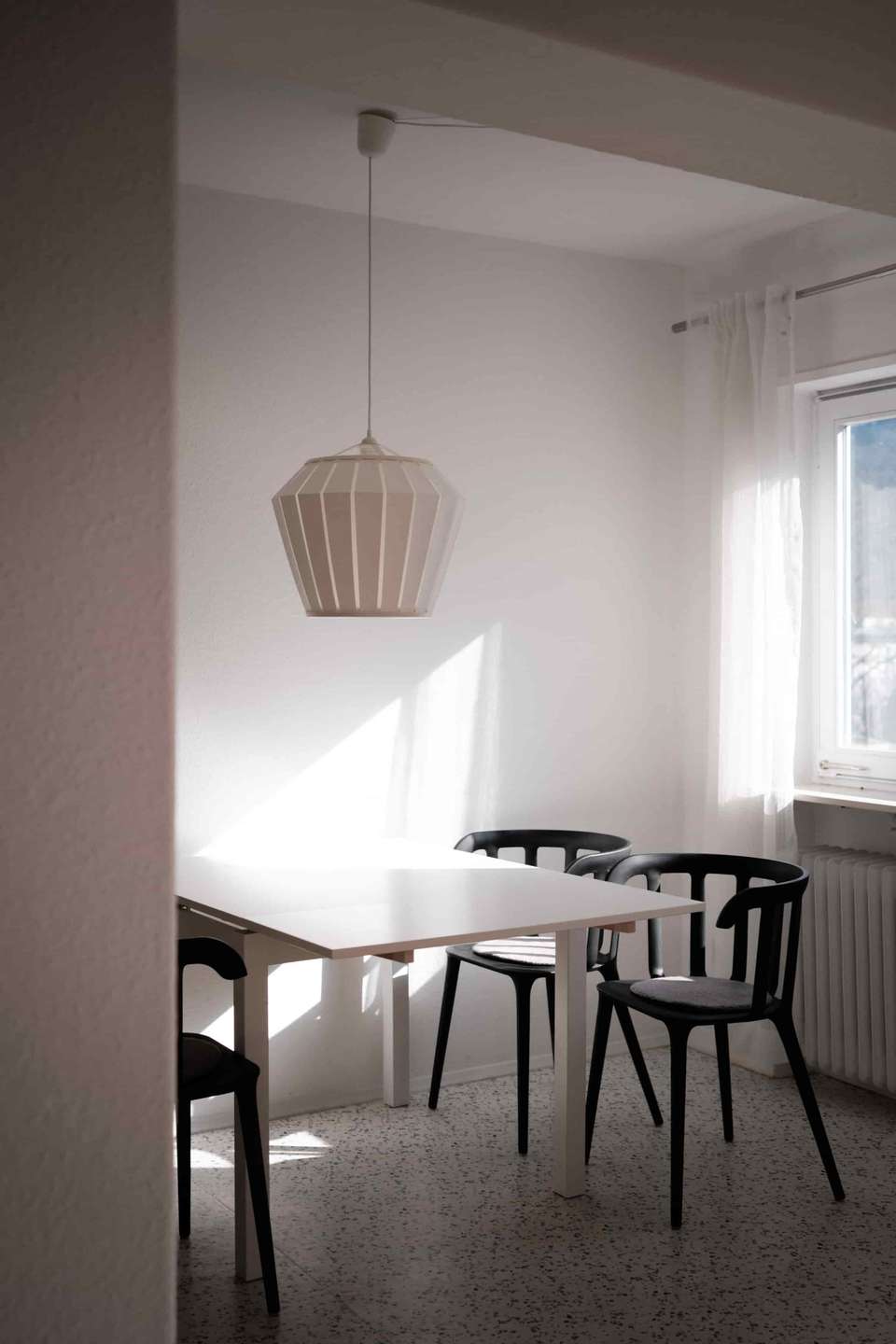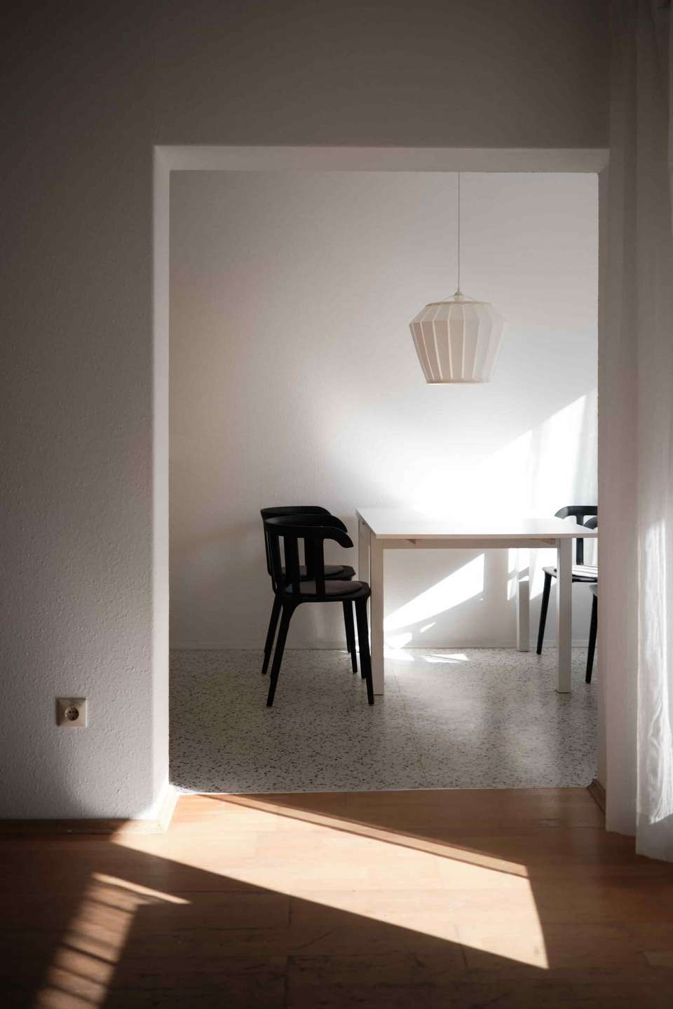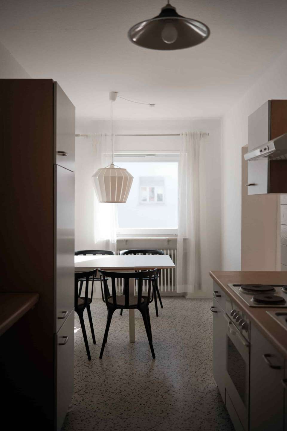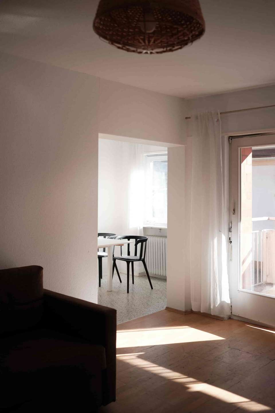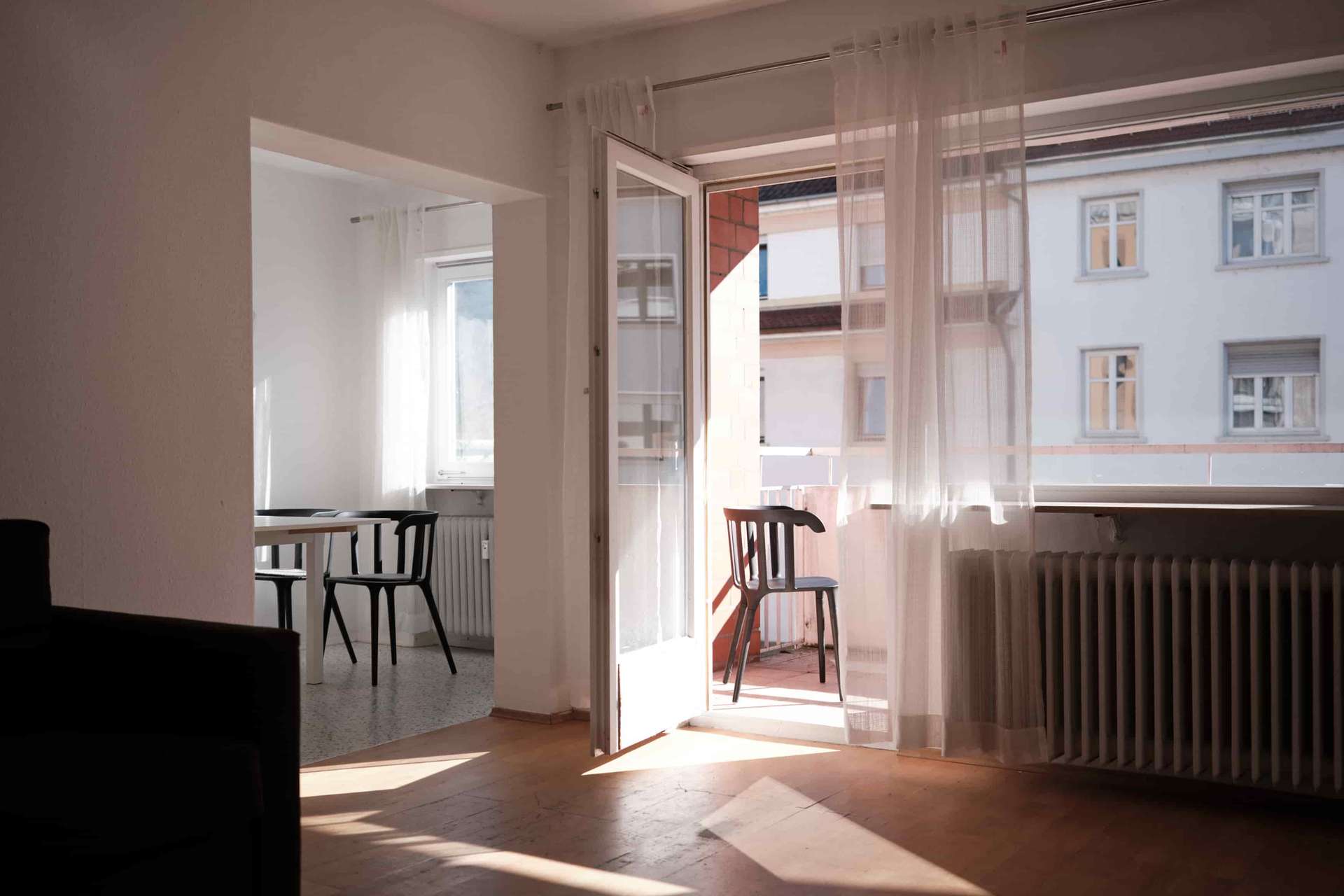 Mit rund 92 Quadratmetern Wohnfläche überzeugt die Wohnung durch einen sehr klar strukturierten und gut nutzbaren Grundriss. Beim Betreten gelangt man in einen kleinen Eingangsbereich, von dem aus sich die Wohnung nach rechts in einem rechteckigen Grundriss entfaltet. Geradeaus führt der Weg in die Küche, die durch eine Wand vom Wohnbereich getrennt ist und in ein kleines Esszimmer übergeht. Hier lässt sich problemlos ein Tisch mit vier Stühlen platzieren. Von diesem Bereich aus gelangt man auf den nach Süden ausgerichteten Balkon, auf dem ebenfalls bequem ein Tisch mit mehreren Stühlen Platz findet. Die Südausrichtung sorgt besonders am Nachmittag und Abend für schönes Licht und viel Sonne. Über einen Durchgang ist der Essbereich mit dem großzügigen Wohnzimmer verbunden, sodass ein angenehm offener Wohnbereich entsteht. Sowohl das Wohnzimmer als auch der Essbereich haben Zugang zum Balkon.