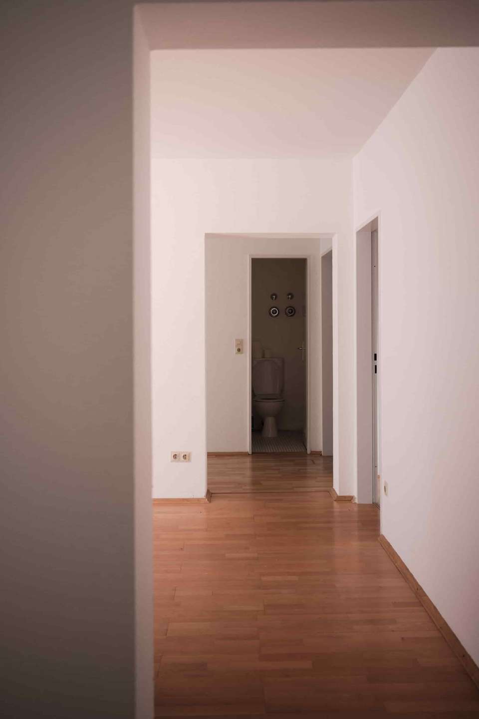 Der private Teil der Wohnung liegt im hinteren Bereich. Entlang des Flurs befinden sich zwei kleinere Zimmer mit jeweils etwa zehn Quadratmetern, die sich sehr gut als Arbeitszimmer, Gästezimmer oder Kinderzimmer eignen. Am Ende des Flurs liegt das modernisierte Badezimmer, zusätzlich steht eine separate Toilette zur Verfügung. Auf der gegenüberliegenden Seite befindet sich das größere Schlafzimmer, ebenfalls nach Süden orientiert und in einer Reihe mit Wohnzimmer und Esszimmer angeordnet.