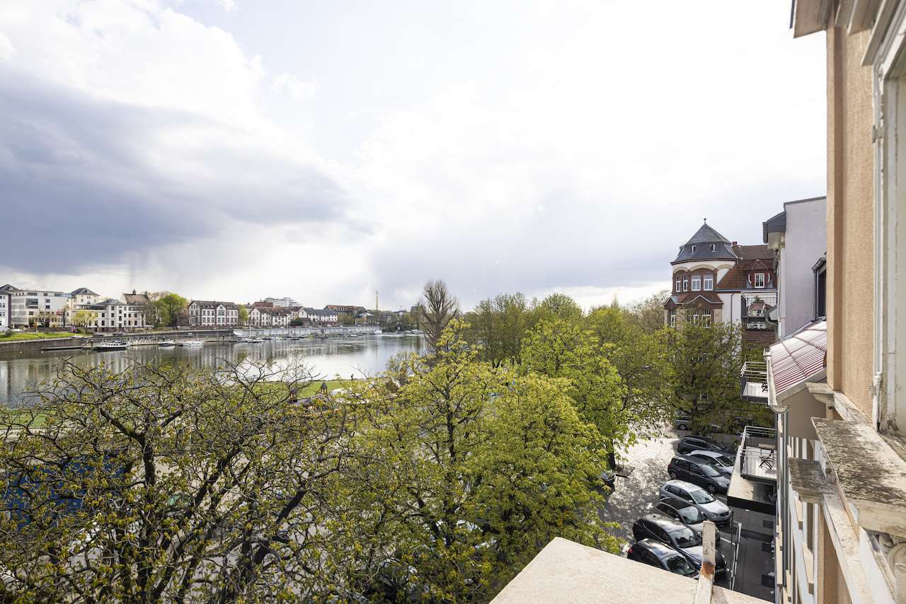 Aus dem rustikalen Treppenhaus betritt man die Wohnung in einen kleinen Flurbereich. Hufeisenförmig um diesen herum, ordnen sich die Räume der insgesamt 95m2 großen Wohnung an, die alle durch weiße Holztüren untereinander verbunden sind. Linkerhand befindet sich ein rund 20 m2 großes Zimmer, das sich ideal als Homeoffice-Raum eignet und von dem aus man hinaus nach Neuenheim blickt. Nebenan, in südöstlicher Richtung, befindet sich das rund 27 m2 große Wohnzimmer, das über einen kleinen Zierbalkon verfügt. Von hier aus sieht man auf den vorbeiglitzernden Neckar und kann einen Blick auf das Heidelberger Schloss erhaschen.