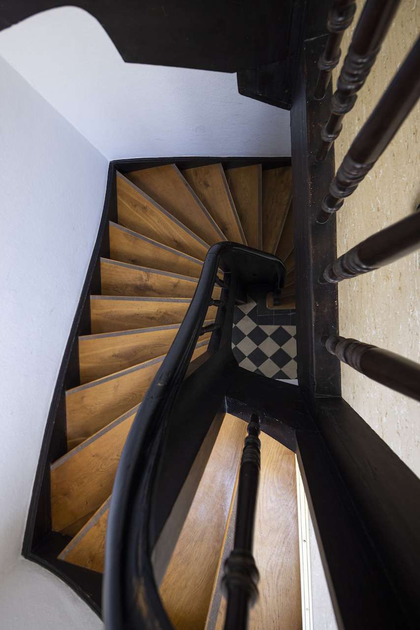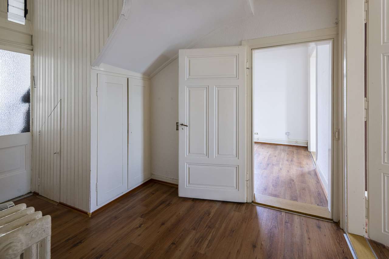 Über Holzstufen führt der Weg durchs Treppenhaus hinauf in die Dachgeschosswohnung. Auch diese Wohnung betritt man durch einen kleinen Flurbereich, um den herum sich ebenfalls hufeisenförmig die Wohnräume ordnen. Die Grundfläche dieser Wohnung ähnelt der Darunterliegenden, es gibt aber einige Unterschiede. Auf diesem Stockwerk ist die in südlicher Richtung gelegene Wohnfläche in zwei Zimmer unterteilt, die über eine Tür miteinander verbunden sind. Es bietet sich daher an, das in östlicher Richtung gelegene, größte Zimmer der Wohnung als Wohnzimmer zu nutzen. Ein großes Badezimmer mit WC, Bidet und Duschkabine ist Teil der Wohnung und schließt in nördlicher Richtung an den Eingangsbereich an.
