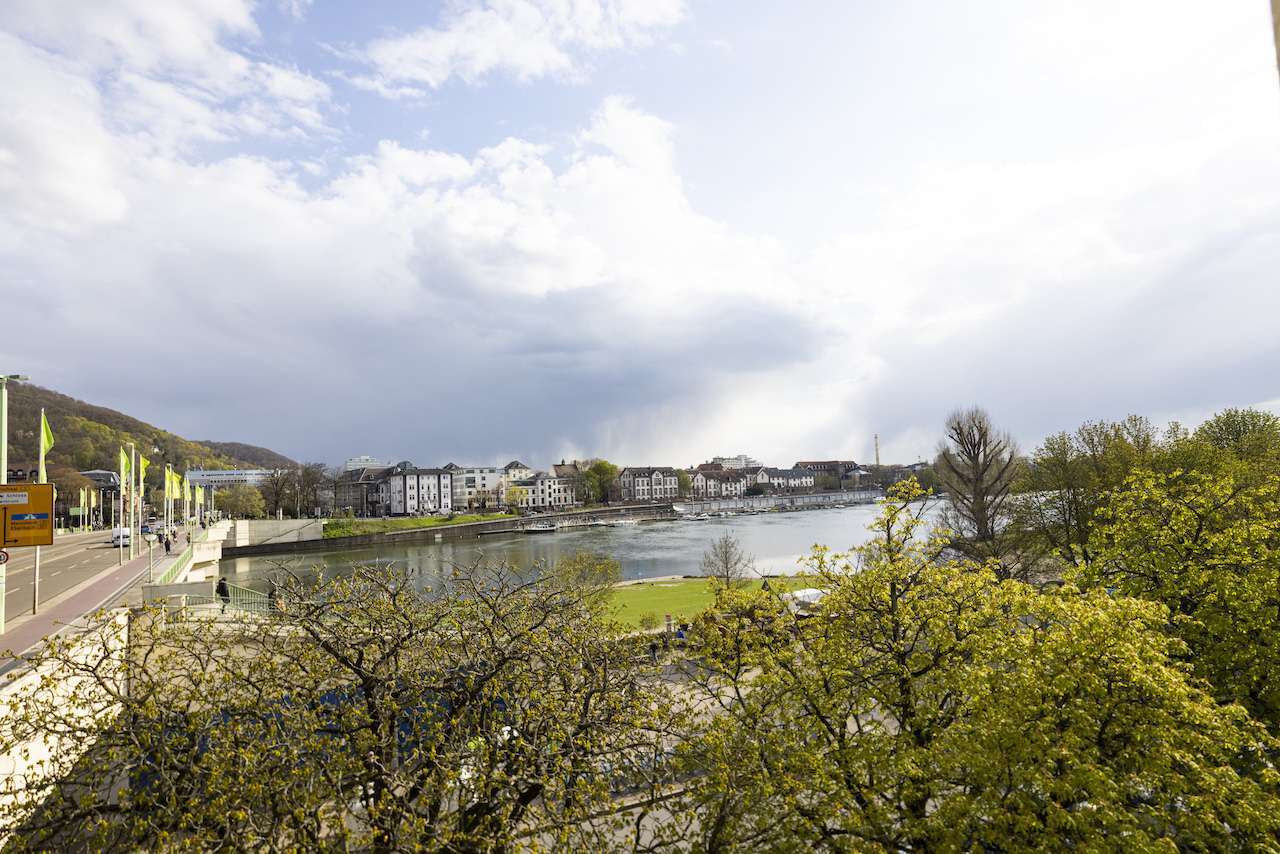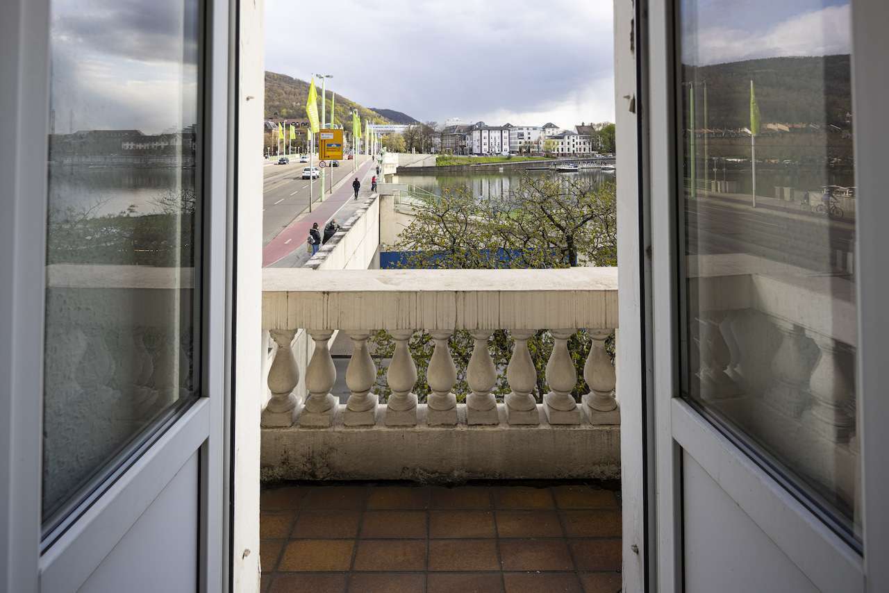 Vom kleineren Zimmer, dem Besprechungszimmer aus betritt man rechts neben dem großen Fenster einen kleinen Balkon, von dem aus sich das Treiben auf der Theodor- Heuss-Brücke und dem Neckarufer beobachten lässt.