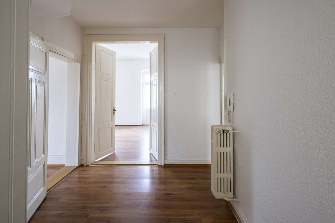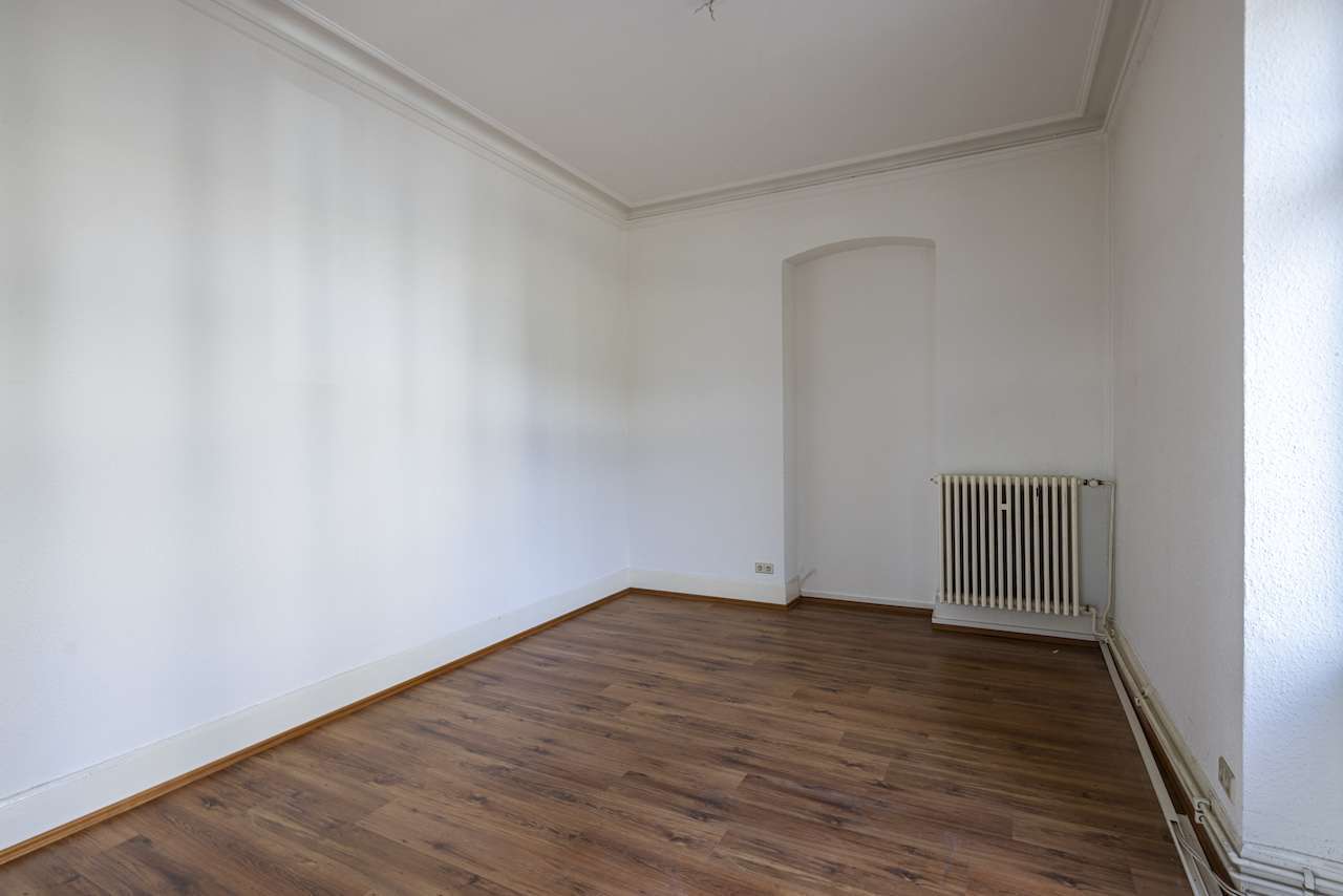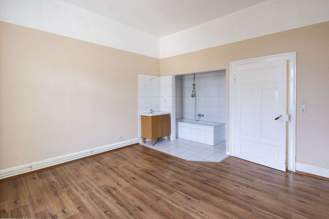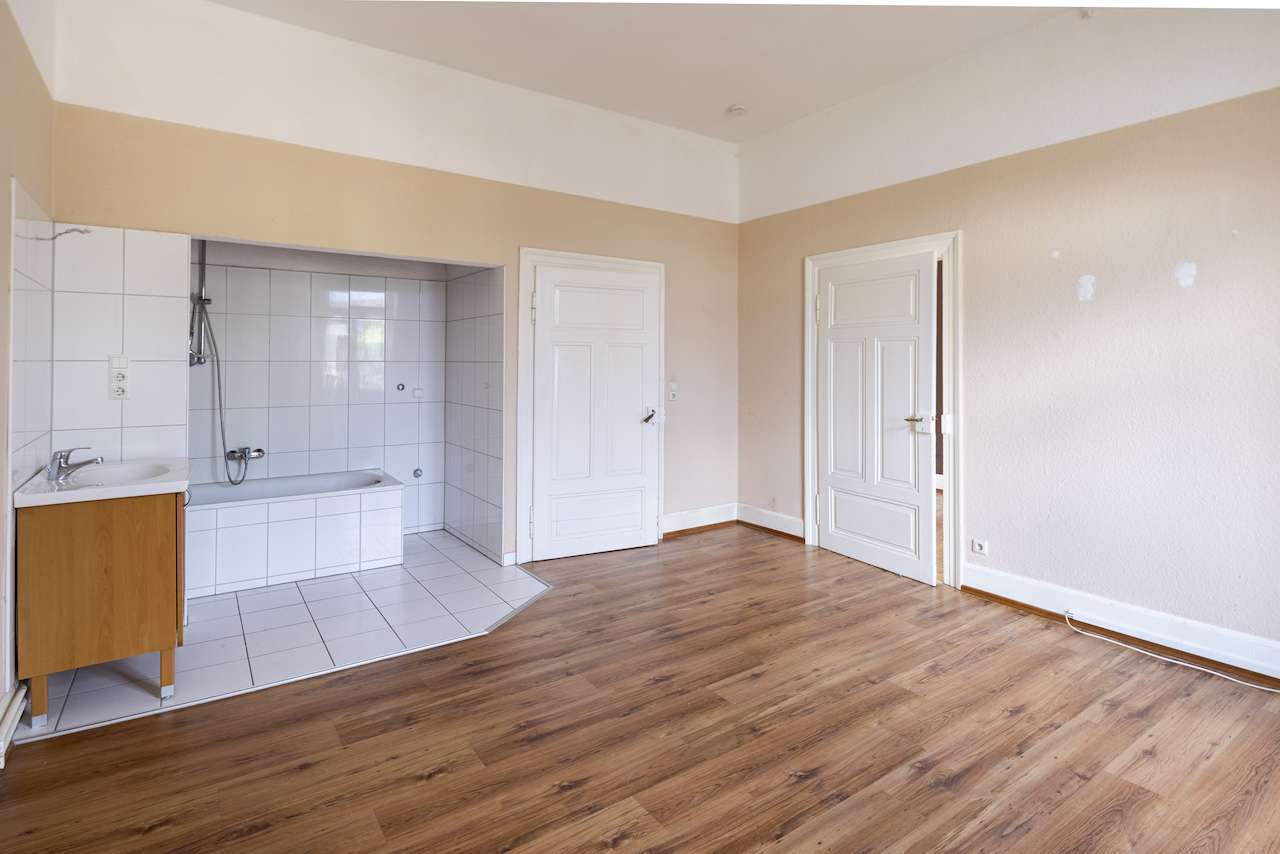An das Wohnzimmer schließt in südwestlicher Richtung ein großes Schlafzimmer an, das über eine charmante Altbau-Besonderheit verfügt: eine geflieste Badnische mit eigenem Waschbecken und einer großen Badewanne. Das zur Wohnung gehörende WC befindet sich auf Etagenhöhe im Außenflur. Gegenüber der Zimmertüre des Schlafzimmers befindet sich der Eingang zur Küche, von der aus es auf einen kleinen Außensitz hinausgeht. Von hier aus blickt man auf das Flachdach des Nebengebäudes. Die Dachfläche wird momentan nicht als Terrasse genutzt.