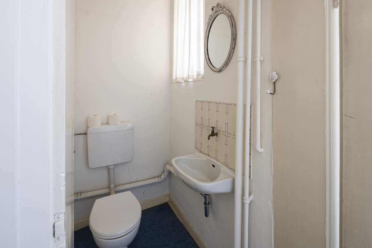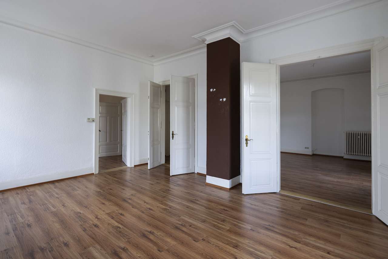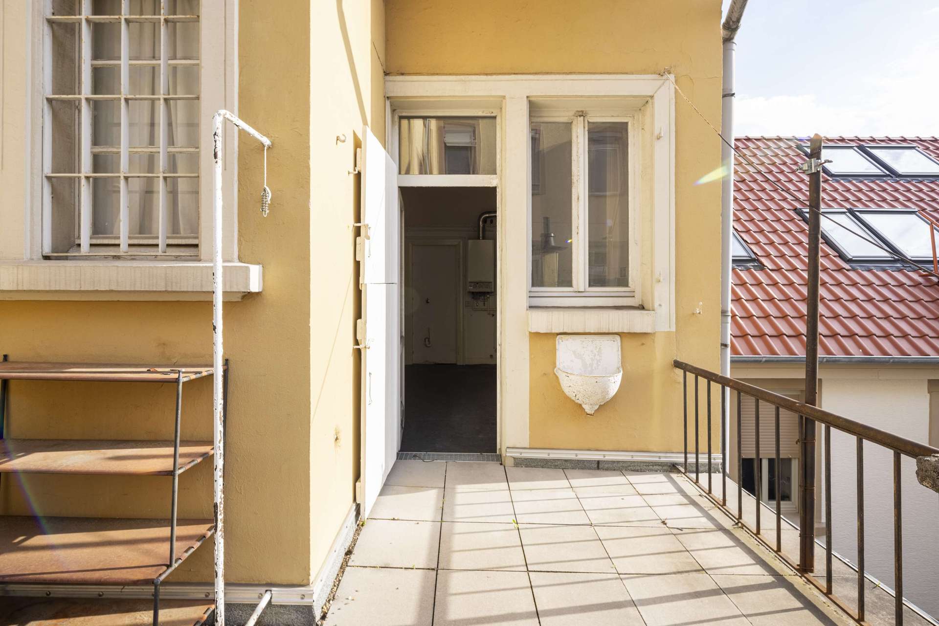 An das Wohnzimmer schließt in südwestlicher Richtung ein großes Schlafzimmer an, das über eine charmante Altbau-Besonderheit verfügt: eine geflieste Badnische mit eigenem Waschbecken und einer großen Badewanne. Das zur Wohnung gehörende WC befindet sich auf Etagenhöhe im Außenflur. Gegenüber der Zimmertüre des Schlafzimmers befindet sich der Eingang zur Küche, von der aus es auf einen kleinen Außensitz hinausgeht. Von hier aus blickt man auf das Flachdach des Nebengebäudes. Die Dachfläche wird momentan nicht als Terrasse genutzt.